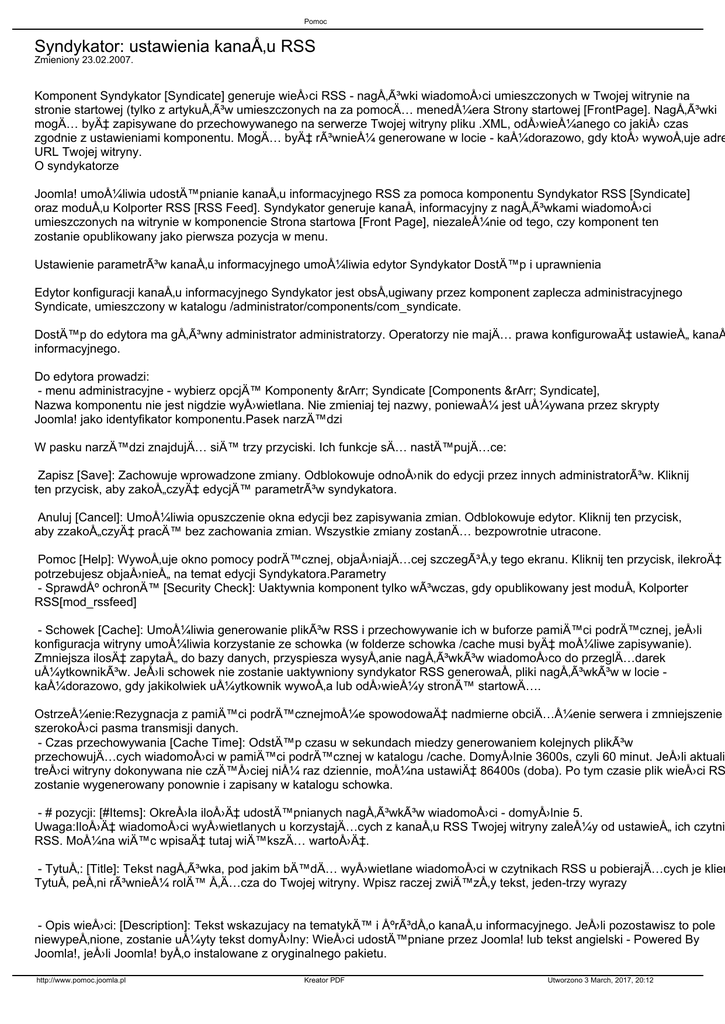 Pomoc Syndykator: ustawienia kanaÅ‚u RSS Zmieniony 23.02.2007. Komponent Syndykator [Syndicate] generuje wieÅ›ci RSS - nagłówki wiadomoÅ›ci umieszczonych w Twojej witrynie na stronie startowej (tylko z artykułów umieszczonych na za pomocÄ… menedżera Strony startowej [FrontPage]. Nagłówki mogÄ… być zapisywane do przechowywanego na serwerze Twojej witryny pliku .XML, odÅ›wieżanego co jakiÅ› czas zgodnie z ustawieniami komponentu. MogÄ… być również generowane w locie - każdorazowo, gdy ktoÅ› wywoÅ‚uje adre URL Twojej witryny. O syndykatorze Joomla! umożliwia udostÄ™pnianie kanaÅ‚u informacyjnego RSS za pomoca komponentu Syndykator RSS [Syndicate] oraz moduÅ‚u Kolporter RSS [RSS Feed]. Syndykator generuje kanaÅ‚ informacyjny z nagłówkami wiadomoÅ›ci umieszczonych na witrynie w komponencie Strona startowa [Front Page], niezależnie od tego, czy komponent ten zostanie opublikowany jako pierwsza pozycja w menu. Ustawienie parametrów kanaÅ‚u informacyjnego umożliwia edytor Syndykator DostÄ™p i uprawnienia Edytor konfiguracji kanaÅ‚u informacyjnego Syndykator jest obsÅ‚ugiwany przez komponent zaplecza administracyjnego Syndicate, umieszczony w katalogu /administrator/components/com_syndicate. DostÄ™p do edytora ma główny administrator administratorzy. Operatorzy nie majÄ… prawa konfigurować ustawieÅ„ kanaÅ informacyjnego. Do edytora prowadzi: - menu administracyjne - wybierz opcjÄ™ Komponenty ⇒ Syndicate [Components ⇒ Syndicate], Nazwa komponentu nie jest nigdzie wyÅ›wietlana. Nie zmieniaj tej nazwy, ponieważ jest używana przez skrypty Joomla! jako identyfikator komponentu.Pasek narzÄ™dzi W pasku narzÄ™dzi znajdujÄ… siÄ™ trzy przyciski. Ich funkcje sÄ… nastÄ™pujÄ…ce: Zapisz [Save]: Zachowuje wprowadzone zmiany. Odblokowuje odnoÅ›nik do edycji przez innych administratorów. Kliknij ten przycisk, aby zakoÅ„czyć edycjÄ™ parametrów syndykatora. Anuluj [Cancel]: Umożliwia opuszczenie okna edycji bez zapisywania zmian. Odblokowuje edytor. Kliknij ten przycisk, aby zzakoÅ„czyć pracÄ™ bez zachowania zmian. Wszystkie zmiany zostanÄ… bezpowrotnie utracone. Pomoc [Help]: WywoÅ‚uje okno pomocy podrÄ™cznej, objaÅ›niajÄ…cej szczegóły tego ekranu. Kliknij ten przycisk, ilekroć potrzebujesz objaÅ›nieÅ„ na temat edycji Syndykatora.Parametry - Sprawdź ochronÄ™ [Security Check]: Uaktywnia komponent tylko wówczas, gdy opublikowany jest moduÅ‚ Kolporter RSS[mod_rssfeed] - Schowek [Cache]: Umożliwia generowanie plików RSS i przechowywanie ich w buforze pamiÄ™ci podrÄ™cznej, jeÅ›li konfiguracja witryny umożliwia korzystanie ze schowka (w folderze schowka /cache musi być możliwe zapisywanie). Zmniejsza ilosć zapytaÅ„ do bazy danych, przyspiesza wysyÅ‚anie nagłówków wiadomoÅ›co do przeglÄ…darek użytkowników. JeÅ›li schowek nie zostanie uaktywniony syndykator RSS generowaÅ‚ pliki nagłówków w locie każdorazowo, gdy jakikolwiek użytkownik wywoÅ‚a lub odÅ›wieży stronÄ™ startowÄ…. Ostrzeżenie:Rezygnacja z pamiÄ™ci podrÄ™cznejmoże spowodować nadmierne obciążenie serwera i zmniejszenie szerokoÅ›ci pasma transmisji danych. - Czas przechowywania [Cache Time]: OdstÄ™p czasu w sekundach miedzy generowaniem kolejnych plików przechowujÄ…cych wiadomoÅ›ci w pamiÄ™ci podrÄ™cznej w katalogu /cache. DomyÅ›lnie 3600s, czyli 60 minut. JeÅ›li aktuali treÅ›ci witryny dokonywana nie częściej niż raz dziennie, można ustawić 86400s (doba). Po tym czasie plik wieÅ›ci RS zostanie wygenerowany ponownie i zapisany w katalogu schowka. - # pozycji: [#Items]: OkreÅ›la ilość udostÄ™pnianych nagłówków wiadomoÅ›ci - domyÅ›lnie 5. Uwaga:Ilość wiadomoÅ›ci wyÅ›wietlanych u korzystajÄ…cych z kanaÅ‚u RSS Twojej witryny zależy od ustawieÅ„ ich czytni RSS. Można wiÄ™c wpisać tutaj wiÄ™kszÄ… wartość. - TytuÅ‚: [Title]: Tekst nagłówka, pod jakim bÄ™dÄ… wyÅ›wietlane wiadomoÅ›ci w czytnikach RSS u pobierajÄ…cych je klien TytuÅ‚ peÅ‚ni również rolÄ™ łącza do Twojej witryny. Wpisz raczej zwiÄ™zÅ‚y tekst, jeden-trzy wyrazy - Opis wieÅ›ci: [Description]: Tekst wskazujacy na tematykÄ™ i źródÅ‚o kanaÅ‚u informacyjnego. JeÅ›li pozostawisz to pole niewypeÅ‚nione, zostanie użyty tekst domyÅ›lny: WieÅ›ci udostÄ™pniane przez Joomla! lub tekst angielski - Powered By Joomla!, jeÅ›li Joomla! byÅ‚o instalowane z oryginalnego pakietu. http://www.pomoc.joomla.pl Kreator PDF Utworzono 3 March, 2017, 20:12 Pomoc - Ilustracja: [Image]: Grafika - ilustracja wieÅ›ci. Wybierz z listy rozwijanej obraz, który zostanie włączony do nagłówka wiadomoÅ›ci. Plik z grafikÄ… przeÅ›lij do katalogu /images/stories/..., korzystajÄ…c z menedżera Biblioteki mediów. - Tekst zastÄ™pczy: [Image Alt]: Tekst alternatywny opisujÄ…cy ilustracjÄ™ nagłówka (argument parametru alt w kodzie HTM - Skracanie tekstu: [Limit Text]: Umożliwia ograniczenie iloÅ›ci słów w tekstach nagłówków wiadomoÅ›ci. JeÅ›li Tak, iloÅ słów w nagłówkach zostanie ograniczona do okreśłonej nastÄ™pnym parametrem. - DÅ‚ugość tekstu: [Text Length]: Ilość słów w skróconym nagłówku wiadomoÅ›ci - domyÅ›lnie 20. JeÅ›li '0', teksty nagłówków (pierwsze sÅ‚owa wiadomoÅ›ci) nie bÄ™dÄ… dołączane. Uwaga:Aby ta funkcja dziaÅ‚aÅ‚a, parametr Skracanie tekstu: musi być ustawiony na Tak. - Format wiadomoÅ›ci [RSS format]: Umożliwia włączenie bÄ…dź wyłączenie standardowych formatów wiadomoÅ› - UporzÄ…dkuj wg [Order]: okreÅ›la kolejność nagłówków. DostÄ™pne opcje: - DomyÅ›lne [Default]: DomyÅ›lne [Default]: PorzÄ…dkuje pozycje zgodnie z kolejnoÅ›ciÄ… ustawionÄ… w parametrach menu strony startowej [menu MateiaÅ‚y ⇒ 