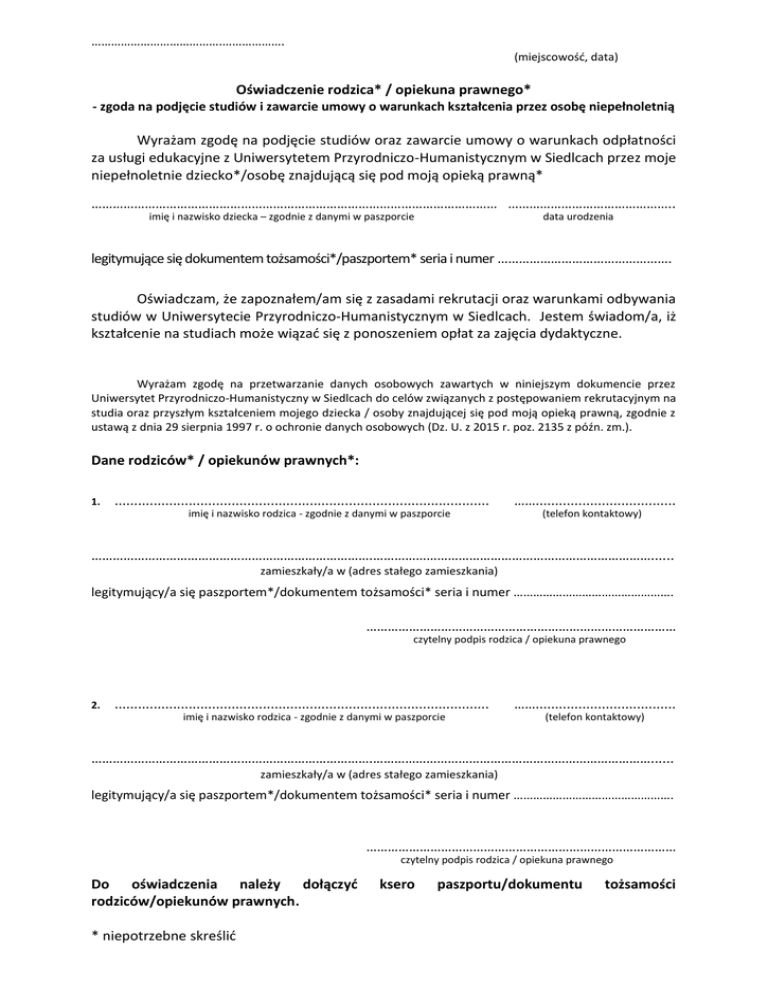 ………………………………….………………. (miejscowość, data) Oświadczenie rodzica* / opiekuna prawnego* - zgoda na podjęcie studiów i zawarcie umowy o warunkach kształcenia przez osobę niepełnoletnią Wyrażam zgodę na podjęcie studiów oraz zawarcie umowy o warunkach odpłatności za usługi edukacyjne z Uniwersytetem Przyrodniczo-Humanistycznym w Siedlcach przez moje niepełnoletnie dziecko*/osobę znajdującą się pod moją opieką prawną* …………………………………………………………………………………………………… ……………………………………….. imię i nazwisko dziecka – zgodnie z danymi w paszporcie data urodzenia legitymujące się dokumentem tożsamości*/paszportem* seria i numer …………………………………………. Oświadczam, że zapoznałem/am się z zasadami rekrutacji oraz warunkami odbywania studiów w Uniwersytecie Przyrodniczo-Humanistycznym w Siedlcach. Jestem świadom/a, iż kształcenie na studiach może wiązać się z ponoszeniem opłat za zajęcia dydaktyczne. Wyrażam zgodę na przetwarzanie danych osobowych zawartych w niniejszym dokumencie przez Uniwersytet Przyrodniczo-Humanistyczny w Siedlcach do celów związanych z postępowaniem rekrutacyjnym na studia oraz przyszłym kształceniem mojego dziecka / osoby znajdującej się pod moją opieką prawną, zgodnie z ustawą z dnia 29 sierpnia 1997 r. o ochronie danych osobowych (Dz. U. z 2015 r. poz. 2135 z późn. zm.). Dane rodziców* / opiekunów prawnych*: 1. ................................................................................................ imię i nazwisko rodzica - zgodnie z danymi w paszporcie …….................................... (telefon kontaktowy) …………………………………………………………………….……………………………………………………………………...... zamieszkały/a w (adres stałego zamieszkania) legitymujący/a się paszportem*/dokumentem tożsamości* seria i numer …………………………………………. …………………………………………………………………………… czytelny podpis rodzica / opiekuna prawnego 2. ................................................................................................ imię i nazwisko rodzica - zgodnie z danymi w paszporcie …….................................... (telefon kontaktowy) …………………………………………………………………….……………………………………………………………………...... zamieszkały/a w (adres stałego zamieszkania) legitymujący/a się paszportem*/dokumentem tożsamości* seria i numer …………………………………………. …………………………………………………………………………… czytelny podpis rodzica / opiekuna prawnego Do oświadczenia należy dołączyć rodziców/opiekunów prawnych. * niepotrzebne skreślić ksero paszportu/dokumentu tożsamości