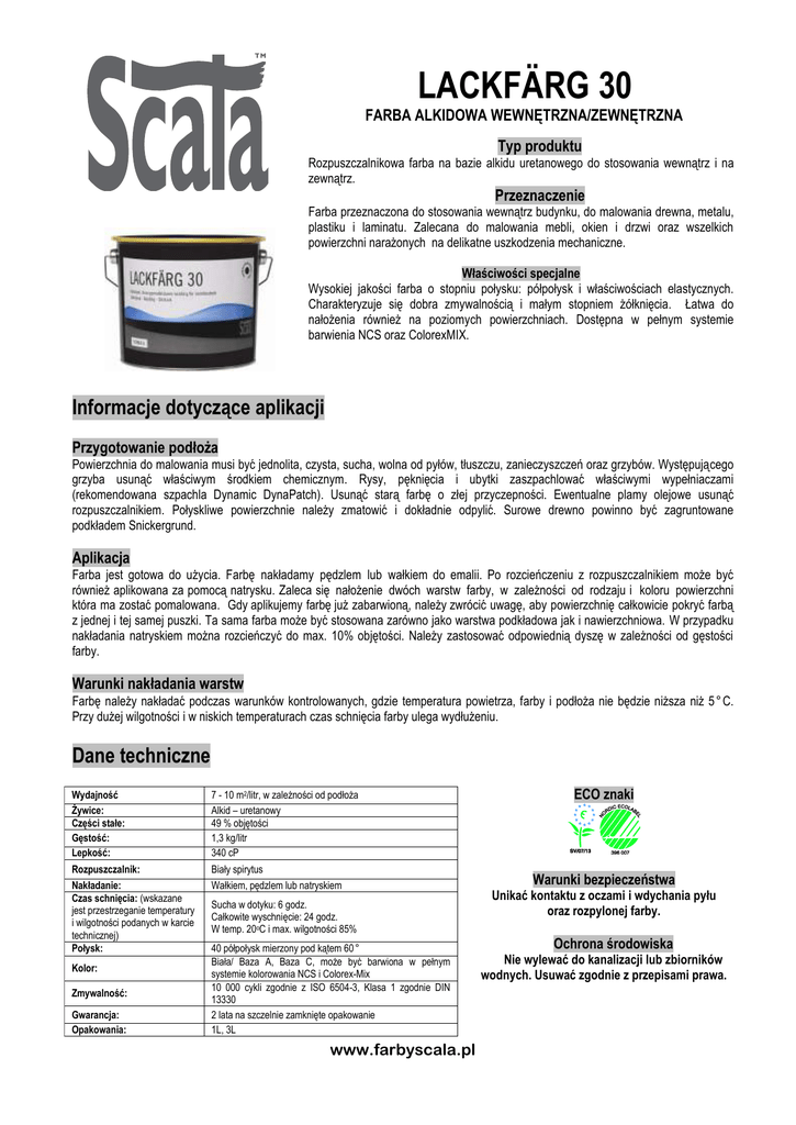 LACKFÄRG 30 FARBA ALKIDOWA WEWNĘTRZNA/ZEWNĘTRZNA Typ produktu Rozpuszczalnikowa farba na bazie alkidu uretanowego do stosowania wewnątrz i na zewnątrz. Przeznaczenie Farba przeznaczona do stosowania wewnątrz budynku, do malowania drewna, metalu, plastiku i laminatu. Zalecana do malowania mebli, okien i drzwi oraz wszelkich powierzchni narażonych na delikatne uszkodzenia mechaniczne. Właściwości specjalne Wysokiej jakości farba o stopniu połysku: półpołysk i właściwościach elastycznych. Charakteryzuje się dobra zmywalnością i małym stopniem żółknięcia. Łatwa do nałożenia również na poziomych powierzchniach. Dostępna w pełnym systemie barwienia NCS oraz ColorexMIX. Informacje dotyczące aplikacji Przygotowanie podłoża Powierzchnia do malowania musi być jednolita, czysta, sucha, wolna od pyłów, tłuszczu, zanieczyszczeń oraz grzybów. Występującego grzyba usunąć właściwym środkiem chemicznym. Rysy, pęknięcia i ubytki zaszpachlować właściwymi wypełniaczami (rekomendowana szpachla Dynamic DynaPatch). Usunąć starą farbę o złej przyczepności. Ewentualne plamy olejowe usunąć rozpuszczalnikiem. Połyskliwe powierzchnie należy zmatowić i dokładnie odpylić. Surowe drewno powinno być zagruntowane podkładem Snickergrund. Aplikacja Farba jest gotowa do użycia. Farbę nakładamy pędzlem lub wałkiem do emalii. Po rozcieńczeniu z rozpuszczalnikiem może być również aplikowana za pomocą natrysku. Zaleca się nałożenie dwóch warstw farby, w zależności od rodzaju i koloru powierzchni która ma zostać pomalowana. Gdy aplikujemy farbę już zabarwioną, należy zwrócić uwagę, aby powierzchnię całkowicie pokryć farbą z jednej i tej samej puszki. Ta sama farba może być stosowana zarówno jako warstwa podkładowa jak i nawierzchniowa. W przypadku nakładania natryskiem można rozcieńczyć do max. 10% objętości. Należy zastosować odpowiednią dyszę w zależności od gęstości farby. Warunki nakładania warstw Farbę należy nakładać podczas warunków kontrolowanych, gdzie temperatura powietrza, farby i podłoża nie będzie niższa niż 5°C. Przy dużej wilgotności i w niskich temperaturach czas schnięcia farby ulega wydłużeniu. Dane techniczne Wydajność Żywice: Części stałe: Gęstość: Lepkość: 7 - 10 m2/litr, w zależności od podłoża Alkid – uretanowy 49 % objętości 1,3 kg/litr 340 cP Rozpuszczalnik: Biały spirytus Nakładanie: Czas schnięcia: (wskazane jest przestrzeganie temperatury i wilgotności podanych w karcie technicznej) Połysk: Wałkiem, pędzlem lub natryskiem Kolor: Zmywalność: Gwarancja: Opakowania: Sucha w dotyku: 6 godz. Całkowite wyschnięcie: 24 godz. W temp. 20oC i max. wilgotności 85% 40 półpołysk mierzony pod kątem 60° Biała/ Baza A, Baza C, może być barwiona w pełnym systemie kolorowania NCS i Colorex-Mix 10 000 cykli zgodnie z ISO 6504-3, Klasa 1 zgodnie DIN 13330 2 lata na szczelnie zamknięte opakowanie 1L, 3L www.farbyscala.pl ECO znaki Warunki bezpieczeństwa Unikać kontaktu z oczami i wdychania pyłu oraz rozpylonej farby. Ochrona środowiska Nie wylewać do kanalizacji lub zbiorników wodnych. Usuwać zgodnie z przepisami prawa.