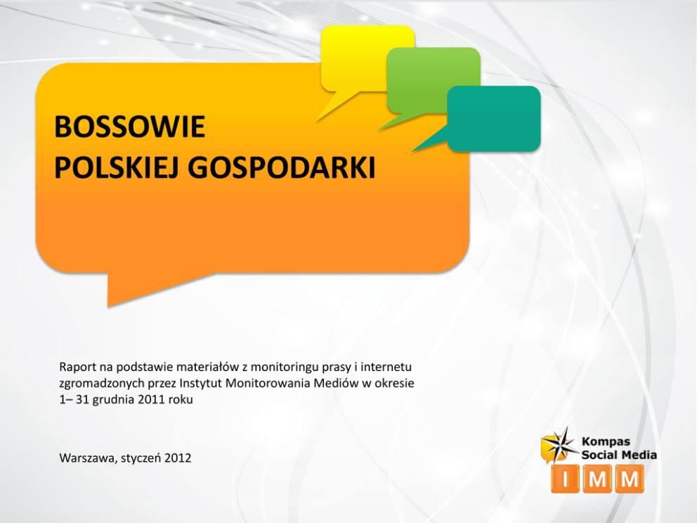 BOSSOWIE POLSKIEJ GOSPODARKI Raport na podstawie materiałów z monitoringu prasy i internetu zgromadzonych przez Instytut Monitorowania Mediów w okresie 1– 31 grudnia 2011 roku Warszawa, styczeo 2012 Bossowie polskiej gospodarki Raport IMM prezentuje obecnośd szefów największych firm na polskim rynku w prasie, internecie oraz social media. Analiza obejmuje 2 928 publikacji, które ukazały się między 1 a 31 grudnia 2011 roku w monitorowanych przez Instytut gazetach, portalach internetowych, na forach, blogach oraz w serwisach społecznościowych. Analiza porównawcza dotyczy sylwetek szefów firm z poniższych sektorów: Bankowośd Energetyka Telekomunikacja Ubezpieczenia Firmy zostały wyselekcjonowane z czołówki przedsiębiorstw z „Listy 500” (za 2010 rok) największych polskich firm, rankingu publikowanym corocznie przez dziennik "Rzeczpospolita". Każda wybrana przez nas do raportu branża reprezentowana jest przez szefów pięciu firm: Bankowośd: BRE Bank , Bank Pekao , Bank Zachodni WBK , ING Bank Śląski, PKO BP. Energetyka: Energa, Kompania Węglowa, PGE Polska Grupa Energetyczna, PGNiG, Tauron Polska Energia. Telekomunikacja: Netia, Polkomtel, Polska Telefonia Cyfrowa, PTK Centertel, Telekomunikacja Polska. Ubezpieczenia: Grupa Europa, ING TUnŻ, PZU, Vienna IG, Warta TUnŻ. 2 W raporcie Obecnośd bossów w mediach Udział bossów w mediach: podział branżowy Udział bossów w mediach: osoby Bossowie o największej ekspozycji Udział bossów w mediach: profilowanie informacji Tematyka dyskusji Tu dyskutowano o bossach: najaktywniejsze kanały komunikacji Popularne media społecznościowe o najczęściej dyskutowanych bossach 3 RANKINGI GŁÓWNE Udział bossów w mediach wg branży TOP 10 - bossowie o największej ekspozycji TOP 5 w mediach TOP 3 w mediach BOSSOWIE W MEDIACH Bossowie w mediach 7% 9% 84% internet prasa media społecznościowe Udział bossów o największej ekspozycji Tomasz Zadroga (PGE) 7% 3% 2% Michał Szubski (PGNiG) 3% Dariusz Lubera (Tauron) 3% Maciej Witucki (TP) 27% 4% Zbigniew Jagiełło (PKO BP) 8% Mirosław Godlewski (Netia) Cezary Stypułkowski (BRE Bank) 19% 11% Małgorzata Kołakowska (ING Bank Śląski) Luigi Lovaglio (Bank Pekao) Andrzej Klesyk (PZU) 13% pozostali Tu dyskutowano na temat bossów 89 gospodarka.gazeta.pl 79 wyborcza.biz 74 gpwinfostrefa.pl bankier.pl 68 biznes.interia.pl 68 biznes.onet.pl 64 gielda.onet.pl 63 stooq.pl 62 finanse.wp.pl 55 money.pl 54 Puls Biznesu 53 0 50 100 Profilowanie informacji o bossach 2% 2% 2% 7% 8% 56% 23% finanse/ubezpieczenia/prawo przemysł nieruchomości pozostałe ogólnoinformacyjny media/marketing/PR telekomunikacja BOSSOWIE – SOCIAL MEDIA Udział w mediach społecznościowych wg branży 200 180 Branża bankowa 160 Branża energetyczna 140 120 Branża telekomunikacyjna 100 Branża ubezpieczeniowa 80 60 40 20 grudzieo listopad październik wrzesieo sierpieo lipiec czerwiec maj kwiecieo marzec luty styczeo 0 Tu dyskutowano na temat bossów 35 twitter.com 21 forum.wnp.pl 18 forum.parkiet.com kampanianazywo.pl 15 forum.gazeta.pl 14 facebook.com 13 forum.stockwatch.pl 12 0 10 20 30 40 Bossowie w popularnych mediach społecznościowych Tomasz Zadroga Michał Szubski Maciej Witucki Andrzej Klesyk 0 facebook.com 10 twitter.com 20 30 blip.pl forum.gazeta.pl BOSSOWIE TEMATYKA DYSKUSJI O tym dyskutowano w sieci Energetyka W grudniu czołowymi tematami w mediach były zmiany kadrowe w dwóch firmach energetycznych skarbu paostwa. Z fotelem prezesa pożegnał w połowie miesiąca Tomasz Zadroga z PGE , a tydzieo później swoją rezygnację ogłosił Michał Szubski z PGNiG*. Rezygnacji Zadrogi towarzyszyły liczne domysły na temat przyczyn tej decyzji. Jak zawsze w takich momentach, w mediach rozpoczęły się spekulacje na temat obsadzania wakujących stanowisk. Stawiano również pytania, czy to początek tzw. karuzeli stanowisk w pozostałych paostwowych firmach. Natomiast przed ogłoszeniem tych rewelacji głośno było o PGE w kontekście energetyki jądrowej. Polska Grupa Energetyczna zawiesiła bowiem swoje zaangażowanie w budowę elektrowni jądrowej na Litwie. Z kolei o szefie PGNiG mówiono dużo tuż po ogłoszeniu rezygnacji Szubskiego, która oficjalnie miała byd spowodowana niekorzystną dla spółki decyzją URE. Urząd nie zatwierdził podwyżek cen gazu, których chciała spółka. Szef Tauronu, Dariusz Lubera najczęściej pojawiał się w mediach w związku z kupnem przez Tauron Górnośląskiego Zakładu Elektroenergetycznego od Vattenfall. *Ponieważ konkurs na szefa PGE został rozpisany na początek 2012 roku a Michał Szubski pełnił obowiązki do kooca roku, obydwaj prezesi zostali uwzględnieni w całym grudniowym zestawieniu. O tym dyskutowano w sieci Telekomunikacja Wywiad, którego prezes Telekomunikacji Polskiej Maciej Witucki udzielił w połowie grudnia dziennikowi Parkiet, był szeroko komentowany w mediach elektronicznych. Media podchwyciły chętnie temat rebrandingu TP na Orange oraz planów rezygnacji spółki z telefonii stacjonarnej. W drugiej połowie grudnia Parkiet rozmawiał też z Mirosławem Godlewskim. Media cytowały wypowiedzi prezesa na temat nowej strategii Netii i planów telekomu po sfinalizowaniu transakcji nabycia przez Netię Telefonii Dialog oraz Crowley Data Poland. O tym dyskutowano w sieci Bankowość Na trzecim miejscu pod względem liczby wystąpieo znaleźli się przedstawiciele sektora bankowego. Najczęściej w tym kontekście mówiono o Zbigniewie Jagiełło (PKO BP). Bank PKO BP wygrał w kategorii marek finansowych w Rankingu Najcenniejszych Polskich Marek 2011 przygotowanym przez dziennik Rzeczpospolita. Przy tej okazji prezes przypominał, że kierowana przez niego instytucja została doceniona również za granicą. Należący do Financial Times Group the Banker przyznał mu tytuł Banku Roku 2011. Jagiełło komentował mediom również decyzję o wycofaniu kredytów hipotecznych w walutach obcych z oferty banku. O tym dys