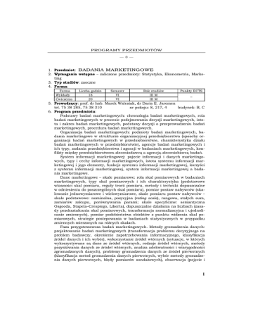 PROGRAMY PRZEDMIOTÓW —— 1. Przedmiot: BADANIA MARKETINGOWE 2. Wymagania wstępne – zaliczone przedmioty: Statystyka, Ekonometria, Marketing 3. Typ studiów: zaoczne 4. Forma: Forma Wykłady Ćwiczenia Liczba godzin 18 20 Semestr VI VI Rok studiów III M III M Punkty ECTS – 5. Prowadzący: prof. dr hab. Marek Walesiak, dr Daria E. Jaremen tel. 75 38 285, 75 38 310 nr pokoju: 8, 217, 4 budynek: B, C 6. Program przedmiotu: Podstawy badań marketingowych: chronologia badań marketingowych, rola badań marketingowych w procesie podejmowania decyzji marketingowych, istota i zakres badań marketingowych, podstawy decyzji o przeprowadzeniu badań marketingowych, procedura badań marketingowych. Organizacja badań marketingowych: podmioty badań marketingowych, badania marketingowe w strukturze organizacyjnej przedsiębiorstwa (sposoby organizacji badań marketingowych w przedsiębiorstwie, charakterystyka działu badań marketingowych w przedsiębiorstwie), agencje badań marketingowych i ich typy, zadania przedsiębiorstwa i agencji w badaniach marketingowych, konflikty między przedsiębiorstwem-zleceniodawcą a agencją-zleceniobiorcą badań. System informacji marketingowej: pojęcie informacji i danych marketingowych, typy i cechy informacji marketingowych, istota systemu informacji marketingowej i jego elementy, funkcje systemu informacji marketingowej, korzyści z systemu informacji marketingowej, system informacji marketingowej a badania marketingowe. Dane marketingowe – skale pomiarowe: rola skal pomiarowych w badaniach marketingowych, typy skal pomiarowych i ich charakterystyka (podstawowe własności skal pomiaru, reguły teorii pomiaru, metody i techniki dopuszczalne w odniesieniu do poszczególnych skal pomiaru), pomiar postaw nabywców (skalowanie jednowymiarowe i wielowymiarowe, skale pomiaru postaw nabywców – skale podstawowe: nominalna, pozycyjna (rating scale), rangowa, stałych sum, zamiarów zakupu, porównywania parami; skale specyficzne: semantyczna Osgooda, Stapela–Crespiego, Likerta), dopuszczalne działania na liczbach (zasady przekształcania skal pomiarowych, transformacja normalizacyjna i ujednolicanie zmiennych), pomiar podobieństwa obiektów z punktu widzenia skal pomiarowych, strategie postępowania w badaniach statystycznych w przypadku zmiennych mierzonych na różnych skalach. Faza przygotowawcza badań marketingowych. Metody gromadzenia danych: projektowanie badań marketingowych (transformacja problemu decyzyjnego na problem badawczy, określenie zapotrzebowania informacyjnego, klasyfikacja źródeł danych i ich wybór), wykorzystanie źródeł wtórnych (sytuacje, w których wykorzystywane są dane ze źródeł wtórnych, rodzaje źródeł wtórnych, metody pozyskiwania danych ze źródeł wtórnych, analiza adekwatności i wiarygodności zgromadzonych danych), problemy gromadzenia danych ze źródeł pierwotnych (klasyfikacja metod gromadzenia danych pierwotnych, wybór metody gromadzenia danych pierwotnych, błędy pomiarów sondażowych), obserwacja (pojęcie i 1 ROK AKADEMICKI 2003/2004 cechy obserwacji, rodzaje (techniki) obserwacji, kryteria wyboru technik obserwacyjnych, schemat obserwacji i jego konstrukcja, sytuacje, w których można stosować obserwacje), wywiad (pojęcie wywiadu, klasyfikacja wywiadów, wybór rodzaju wywiadu, metody projekcyjne), metody ankietowe (pojęcie ankiety, klasyfikacja ankiet, wybór sposobu ankietowania, projektowanie kwestionariusza ankietowego, zasady konstrukcji kwestionariusza, rodzaje pytań, cechowanie kwestionariusza ankietowego, studia przypadków), inne metody pomiarów pośrednich i bezpośrednich (metoda delficka, badania panelowe, pomiary fizjologiczne, degustacje i oceny próbek), eksperyment (pojęcie i rodzaje eksperymentów, sytuacje, w których konieczny jest eksperyment, rynki testowe). Zasady doboru próby do badań marketingowych: metody doboru próby badawczej (metody losowania oparte o podejście probabilistyczne, nieprobabilistyczne metody losowania), określenie liczebności próby, czynniki determinujące wielkość próby. Metody analizy danych marketingowych: jednowymiarowa i dwuwymiarowa analiza danych marketingowych (miary położenia; miary dyspersji, testy statystyczne, miary współzależności), wielowymiarowe metody analizy danych marketingowych (badanie zależności – analiza regresji wielorakiej; conjoint analysis; metoda detekcji interakcji, opis metody, charakterystyka zastosowań marketingowych; badanie współwystępowania – analiza czynnikowa; metody klasyfikacji; skalowanie wielowymiarowe; metody porządkowania liniowego, opis metody, charakterystyka zastosowań marketingowych), czynniki decydujące o wyborze metod analizy danych. Podstawowe obszary zastosowań metod analizy wielowymiarowej w badaniach marketingowych: segmentacja rynku (rys historyczny, fazy w strategicznych badaniach marketingowych, podstawowe pojęcia segmentacji rynku, kryteria segmentacji rynku, segmentacja a priori, post hoc i hybrydowa, klasyfikacja metod segmentacji rynku, ocena przydatności metod segmentacji rynku, przykłady segmentacji a priori i post hoc, wybór rynku docelowego, conjoint analysis w strategicznych badaniach marketingowych), badania związane z produktem (badania związane z kształtowaniem nowego produktu, identyfikacja rynków testowych, określanie pozycji produktu na rynku – pozycjonowanie i repozycjonowanie produktu oraz rozpoznawanie luk na rynku, przykłady wykorzystania metod analizy wielowymiarowej w badaniach związanych z produktem), prognozowanie rynku (udziału w rynku, sprzedaży, cen), analiza popytu i rozpoznawanie związków konkurencyjnych, badania preferencji nabywców. 7. Metodyka zajęć: studium przypadków, indywidualne projekty, zestawy zadań do samodzielnego rozwiązania. 8. Cel dydaktyczny przedmiotu: wiadomości: poznanie zasad, metodologii i praktycznych zastosowań badań marketingowych; umiejętności: praktyczne przeprowadzanie b