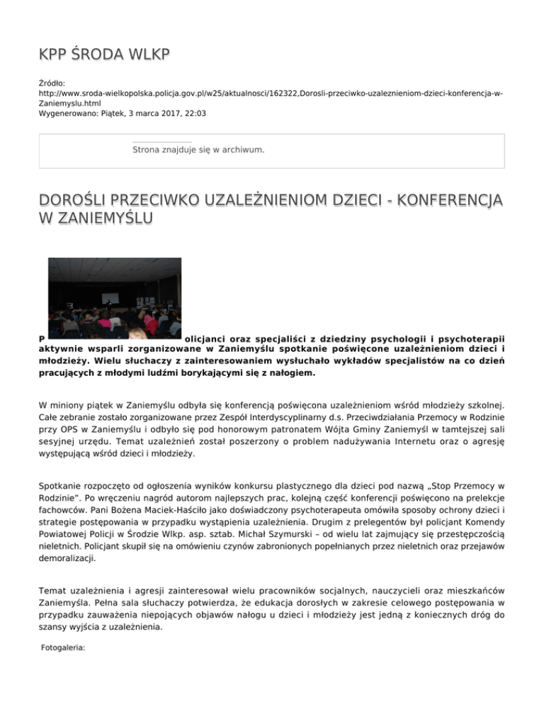 KPP ŚRODA WLKP Źródło: http://www.sroda-wielkopolska.policja.gov.pl/w25/aktualnosci/162322,Dorosli-przeciwko-uzaleznieniom-dzieci-konferencja-wZaniemyslu.html Wygenerowano: Piątek, 3 marca 2017, 22:03 Strona znajduje się w archiwum. DOROŚLI PRZECIWKO UZALEŻNIENIOM DZIECI - KONFERENCJA W ZANIEMYŚLU P olicjanci oraz specjaliści z dziedziny psychologii i psychoterapii aktywnie wsparli zorganizowane w Zaniemyślu spotkanie poświęcone uzależnieniom dzieci i młodzieży. Wielu słuchaczy z zainteresowaniem wysłuchało wykładów specjalistów na co dzień pracujących z młodymi ludźmi borykającymi się z nałogiem. W miniony piątek w Zaniemyślu odbyła się konferencją poświęcona uzależnieniom wśród młodzieży szkolnej. Całe zebranie zostało zorganizowane przez Zespół Interdyscyplinarny d.s. Przeciwdziałania Przemocy w Rodzinie przy OPS w Zaniemyślu i odbyło się pod honorowym patronatem Wójta Gminy Zaniemyśl w tamtejszej sali sesyjnej urzędu. Temat uzależnień został poszerzony o problem nadużywania Internetu oraz o agresję występującą wśród dzieci i młodzieży. Spotkanie rozpoczęto od ogłoszenia wyników konkursu plastycznego dla dzieci pod nazwą „Stop Przemocy w Rodzinie”. Po wręczeniu nagród autorom najlepszych prac, kolejną część konferencji poświęcono na prelekcje fachowców. Pani Bożena Maciek-Haściło jako doświadczony psychoterapeuta omówiła sposoby ochrony dzieci i strategie postępowania w przypadku wystąpienia uzależnienia. Drugim z prelegentów był policjant Komendy Powiatowej Policji w Środzie Wlkp. asp. sztab. Michał Szymurski – od wielu lat zajmujący się przestępczością nieletnich. Policjant skupił się na omówieniu czynów zabronionych popełnianych przez nieletnich oraz przejawów demoralizacji. Temat uzależnienia i agresji zainteresował wielu pracowników socjalnych, nauczycieli oraz mieszkańców Zaniemyśla. Pełna sala słuchaczy potwierdza, że edukacja dorosłych w zakresie celowego postępowania w przypadku zauważenia niepojących objawów nałogu u dzieci i młodzieży jest jedną z koniecznych dróg do szansy wyjścia z uzależnienia. Fotogaleria: prewencja/URZEDZ_UZALEZNIENIE/Zaniemysl Ocena: 0/5 (0) Tweetnij