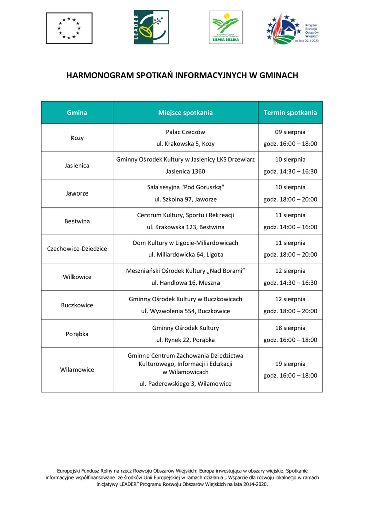 HARMONOGRAM SPOTKAŃ INFORMACYJNYCH W GMINACH Gmina Kozy Jasienica Jaworze Bestwina Czechowice-Dziedzice Wilkowice Buczkowice Porąbka Wilamowice Miejsce spotkania Termin spotkania Pałac Czeczów 09 sierpnia ul. Krakowska 5, Kozy godz. 16:00 – 18:00 Gminny Ośrodek Kultury w Jasienicy LKS Drzewiarz 10 sierpnia Jasienica 1360 godz. 14:30 – 16:30 Sala sesyjna "Pod Goruszką" 10 sierpnia ul. Szkolna 97, Jaworze godz. 18:00 – 20:00 Centrum Kultury, Sportu i Rekreacji 11 sierpnia ul. Krakowska 123, Bestwina godz. 14:00 – 16:00 Dom Kultury w Ligocie-Miliardowicach 11 sierpnia ul. Miliardowicka 64, Ligota godz. 18:00 – 20:00 Meszniański Ośrodek Kultury „Nad Borami” 12 sierpnia ul. Handlowa 16, Meszna godz. 14:30 – 16:30 Gminny Ośrodek Kultury w Buczkowicach 12 sierpnia ul. Wyzwolenia 554, Buczkowice godz. 18:00 – 20:00 Gminny Ośrodek Kultury 18 sierpnia ul. Rynek 22, Porąbka godz. 16:00 – 18:00 Gminne Centrum Zachowania Dziedzictwa Kulturowego, Informacji i Edukacji w Wilamowicach 19 sierpnia godz. 16:00 – 18:00 ul. Paderewskiego 3, Wilamowice Europejski Fundusz Rolny na rzecz Rozwoju Obszarów Wiejskich: Europa inwestująca w obszary wiejskie. Spotkanie informacyjne współfinansowane ze środków Unii Europejskiej w ramach działania „ Wsparcie dla rozwoju lokalnego w ramach inicjatywy LEADER” Programu Rozwoju Obszarów Wiejskich na lata 2014-2020.