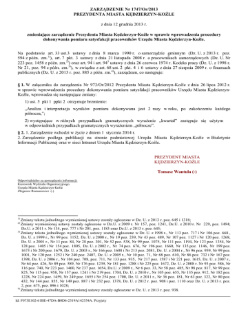 ZARZĄDZENIE Nr 1747/Or/2013 PREZYDENTA MIASTA KĘDZIERZYN-KOŹLE z dnia 12 grudnia 2013 r. zmieniające zarządzenie Prezydenta Miasta Kędzierzyn-Koźle w sprawie wprowadzenia procedury dokonywania pomiaru satysfakcji pracowników Urzędu Miasta Kędzierzyn-Koźle. Na podstawie art. 33 ust.3 ustawy z dnia 8 marca 1990 r. o samorządzie gminnym (Dz. U. z 2013 r. poz. 594 z późn. zm.1)), art. 7 pkt. 3 ustawy z dnia 21 listopada 2008 r. o pracownikach samorządowych (Dz. U. Nr 223 poz. 1458 z późn. zm.2)) oraz art. 94 i art. 943 ustawy z dnia 26 czerwca 1974 r. Kodeks pracy (Dz. U. z 1998 r. Nr 21, poz. 94 z późn. zm.3)), w związku z art. 68 ust. 2 pkt. 4 i 6 ustawy z dnia 27 sierpnia 2009 r. o finansach publicznych (Dz. U. z 2013 r. poz. 885 z późn. zm.4)), zarządzam, co następuje: § 1. W załączniku do zarządzenia Nr 973/Or/2012 Prezydenta Miasta Kędzierzyn-Koźle z dnia 26 lipca 2012 r. w sprawie wprowadzenia procedury dokonywania pomiaru satysfakcji pracowników Urzędu Miasta KędzierzynKoźle, wprowadza się następujące zmiany: 1) ust. 5 pkt 1 ppkt 2 otrzymuje brzmienie: „Analiza i interpretacja wyników pomiaru dokonywana jest 2 razy w roku, po zakończeniu każdego półrocza,”; 2) występujące w różnych przypadkach gramatycznych wyrażenie „kwartał” zastępuje się użytym w odpowiednich przypadkach gramatycznych wyrażeniem „półrocze”. § 2. 1. Zarządzenie wchodzi w życie z dniem 1 stycznia 2014 r. 2. Zarządzenie podlega publikacji na stronie podmiotowej Urzędu Miasta Kędzierzyn-Koźle w Biuletynie Informacji Publicznej oraz w sieci Intranet Urzędu Miasta Kędzierzyn-Koźle. PREZYDENT MIASTA KĘDZIERZYN-KOŹLE Tomasz Wantuła (-) Odpowiedzialny za sporządzenie informacji: Kierownik Wydziału Organizacyjnego Urzędu Miasta Kędzierzyn-Koźle Zbigniew Romanowicz (-) 1) Zmiany tekstu jednolitego wymienionej ustawy zostały ogłoszone w Dz. U. z 2013 r. poz. 645 i 1318; Zmiany wymienionej ustawy zostały ogłoszone w Dz.U. z 2009 r. Nr 157, poz. 1241, Dz.U. z 2010 r. Nr 229, poz. 1494; Dz.U. z 2011 r. Nr 134, poz. 777 i Nr 201, poz. 1183 oraz Dz.U. z 2013 r. poz. 645; 3) Zmiany tekstu jednolitego wymienionej ustawy zostały ogłoszone w Dz. U. z 1998 r., Nr 113 poz. 717 i Nr 106 poz. 668 , Dz. U. z 1999 r., Nr 99 poz. 1152, Dz. U. z 2000 r., Nr 19 poz. 239, Nr 43 poz. 489, Nr 107 poz. 1127 i Nr 120 poz. 1268, Dz. U. z 2001 r., Nr 11 poz. 84, Nr 28 poz. 301, Nr 52 poz. 538, Nr 99 poz. 1075, Nr 111 poz. 1194, Nr 123 poz. 1354, Nr 128 poz. 1405 i Nr 154 poz. 1805, Dz. U. z 2002 r., Nr 74 poz. 676, Nr 196 poz. 1660, Nr 135 poz. 1146, Nr 199 poz. 1673 i Nr 200 poz. 1679, Dz. U. z 2003 r., Nr 166 poz. 1608 i Nr 213 poz. 2081, Dz. U. z 2004 r., Nr 96 poz. 959, Nr 99 poz. 1001, Nr 120 poz. 1252 i Nr 240 poz. 2407, Dz. U. z 2005 r., Nr 10 poz. 71, Nr 68 poz. 610, Nr 86 poz. 732 i Nr 167 poz. 1398, Dz. U. z 2006 r., Nr 104 poz. 708, poz. 711, Nr 133 poz. 935, Nr 217 poz. 1587 i Nr 221 poz. 1615, Dz. U. z 2007 r., Nr 64 poz. 426, Nr 89 poz. 589, Nr 176 poz. 1239, Nr 181 poz. 1288 i Nr 225 poz. 1672, Dz. U. z 2008 r. Nr 93 poz. 586, Nr 116 poz. 740, Nr 223 poz. 1460, Nr 237 poz. 1654, Dz.U. z 2009 r., Nr 6 poz. 33, Nr 58 poz. 485, Nr 98 poz. 817, Nr 99 poz. 825, Nr 115 poz. 958, Nr 157 poz. 1241 i Nr 219 poz. 1704, Dz. U. z 2010 r., Nr 105 poz. 655, Nr 135 poz. 912, Nr 182 poz. 1228, Nr 224 poz. 1459, Nr 249 poz. 1655 i Nr 254 poz. 1700, Dz. U. z 2011 r., Nr 36 poz. 181, Nr 63 poz. 322, Nr 80 poz. 432, Nr 144 poz. 855, Nr 149 poz. 887 i Nr 232 poz. 1378, Dz. U. z 2012 r. poz. 908 i poz. 1110 oraz Dz. U. z 2013 r. poz. 2, poz. 675, poz. 896 i 1028; 4) Zmiany tekstu jednolitego wymienionej ustawy zostały ogłoszone w Dz. U. z 2013 r. poz. 938. 2) Id: F073E102-61BE-47DA-B0D6-2319A142554A. Przyjety
