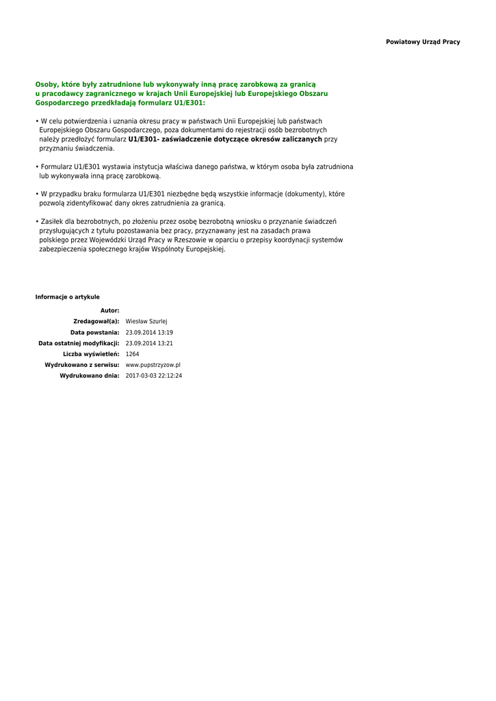 Powiatowy Urząd Pracy Osoby, które były zatrudnione lub wykonywały inną pracę zarobkową za granicą u pracodawcy zagranicznego w krajach Unii Europejskiej lub Europejskiego Obszaru Gospodarczego przedkładają formularz U1/E301: • W celu potwierdzenia i uznania okresu pracy w państwach Unii Europejskiej lub państwach Europejskiego Obszaru Gospodarczego, poza dokumentami do rejestracji osób bezrobotnych należy przedłożyć formularz U1/E301- zaświadczenie dotyczące okresów zaliczanych przy przyznaniu świadczenia. • Formularz U1/E301 wystawia instytucja właściwa danego państwa, w którym osoba była zatrudniona lub wykonywała inną pracę zarobkową. • W przypadku braku formularza U1/E301 niezbędne będą wszystkie informacje (dokumenty), które pozwolą zidentyfikować dany okres zatrudnienia za granicą. • Zasiłek dla bezrobotnych, po złożeniu przez osobę bezrobotną wniosku o przyznanie świadczeń przysługujących z tytułu pozostawania bez pracy, przyznawany jest na zasadach prawa polskiego przez Wojewódzki Urząd Pracy w Rzeszowie w oparciu o przepisy koordynacji systemów zabezpieczenia społecznego krajów Wspólnoty Europejskiej. Informacje o artykule Autor: Zredagował(a): Wiesław Szurlej Data powstania: 23.09.2014 13:19 Data ostatniej modyfikacji: 23.09.2014 13:21 Liczba wyświetleń: 1264 Wydrukowano z serwisu: www.pupstrzyzow.pl Wydrukowano dnia: 2017-03-03 22:12:24