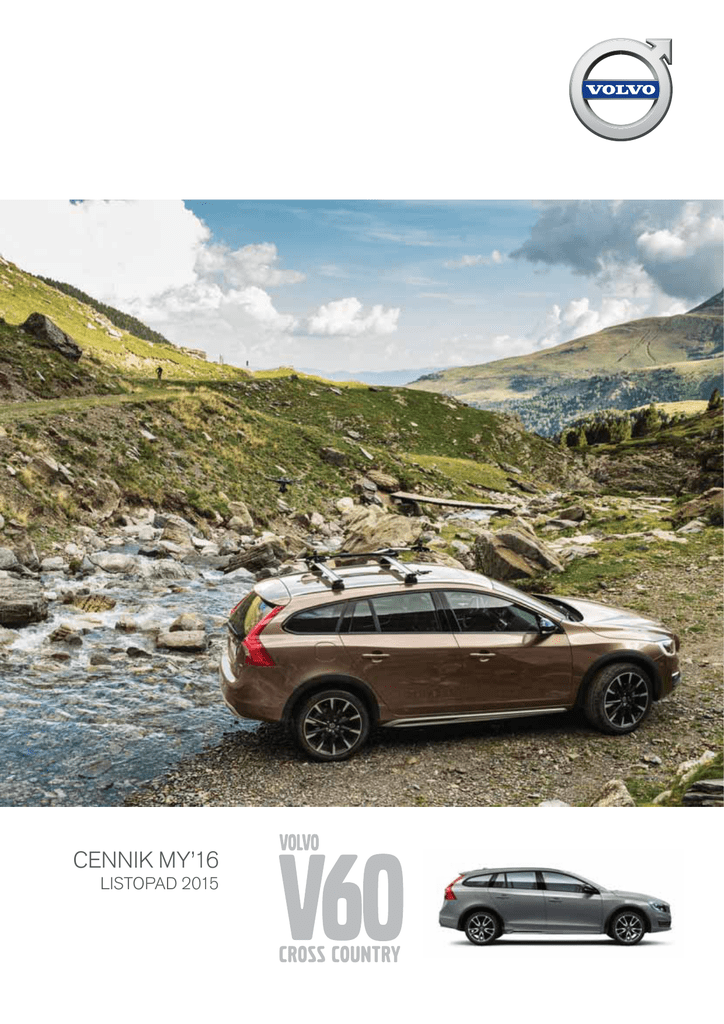 VOLVO V60 CROSS COUNTRY | 1 CENNIK MY’16 LISTOPAD 2015 VOLVO V60 CROSS COUNTRY | 2 VOLVO V60 CROSS COUNTRY | 3 SPIS TREŚCI Jednostki napędowe 04 Technologia 06 Wyposażenie standardowe 07 Bezpieczeństwo 09 Komfort 10 Funkcjonalność 11 12 Koła 13 Tapicerki 14 Wykończenie wnętrza 16 Lakiery 17 Promocyjne pakiety wyposażenia 18 Volvo On Call 19 21 Akcesoria 24 Pakiety gwarancyjne 25 Optymalizacja osiągów Polestar nowej generacji 26 Dane techniczne 27 VOLVO V60 CROSS COUNTRY | 4 SILNIKI DIESLA Silnik (litr/KM) Skrzynia biegów Kinetic Momentum Summum 2.0/150 manualna, 6 biegów 141 500 150 900 166 700 2.0/150 automatyczna Geartronic, 8 biegów 150 800 160 200 176 000 2.0/190 manualna, 6 biegów 151 800 161 200 177 000 2.0/190 automatyczna Geartronic, 8 biegów 161 100 170 500 186 300 2.4/190 automatyczna Geartronic, 6 biegów 171 000 180 400 196 200 D3 D4 D4 AWD Polestar Performance dla Volvo V60 Cross Country D4 i D4 AWD Oprogramowanie Polestar zwiększa moc oraz moment obrotowy Twojego Volvo. Szczegóły oferty u Autoryzowanych Dealerów Volvo. SILNIKI BENZYNOWE Silnik T5 AWD (litr/KM) 2.5/254 Skrzynia biegów automatyczna Geartronic, 6 biegów Kinetic Momentum Summum 173 000 182 400 198 200 Volvo S60 i V60 najmniej awaryjnymi hVbdX]dYVb^lZYj\GVedgijJhiZg`dldóX^ DEKRA 2014 i 2015 VOLVO V60 CROSS COUNTRY | 5 VOLVO V60 CROSS COUNTRY | 6 TECHNOLOGIA Sensus, Intellisafe i Drive-E - teraz możesz jeździć tak, jak zawsze chciałeś. Ty i Twój pojazd: zawsze razem. Siłą skandynawskiego design'u jest połączenie elegancji i funkcjonalności. Przykładem jest Sensus. Ten zintegrowany system informacyjny, rozrywkowy i pomocniczy umożliwia zupełnie nowy, intuicyjny sposób połączenia z Twoim pojazdem. Z pomocą Sensus można bardzo prosto ustawić wszystkie aspekty jazdy pod swoje osobiste potrzeby. Ale to nie wszystko. Twoje Volvo stanie się częścią Twojego cyfrowego świata, tak perfekcyjnie dopasowane, że nawet nie będziesz potrzebował instrukcji obsługi - po prostu wsiądź i jedź! Nowa definicja bezpieczeństwa - dzień po dniu. Inteligentne bezpieczeństwo dla Ciebie i wszystkich wokoło. W kwestii bezpieczeństwa Volvo jest liderem i to od roku 1927. Intellisafe to nasze całościowe podejście do kwestii bezpieczeństwa pojazdu. Jazda z intellisafe jest prosta, bezstresowa i sprawia więcej radości. Stanowi aktywne wsparcie w trakcie jazdy. Dzięki innowacyjnym technologiom takim jak układ monitorujący "martwe pola" widoczności, aktywny tempomat oraz ostrzeganie o ryzyku kolizji z rozpoznawaniem pieszych oraz rowerzystów z pełnym automatycznym hamowaniem możesz jeździć bezpiecznie i spokojnie. System bezpieczeństwa Citysafety skanuje Twoje otoczenie pod kątem niespodziewanych sytuacji i pomaga uniknąć nieszczęśliwych wypadków. We wnętrzu każdego Volvo chroni Cię solidna karoseria, boczna konstrukcja wykonana z niezwykle wytrzymałej stali borowej i nasz innowacyjny system zabezpieczający przed bocznymi uderzeniami (SIPS). Sensem i celem Intellisafe jest stworzenie pojazdów, które całkowicie unikają stłuczek. Ponieważ bezpieczeństwo od dawien dawna jest mocną stroną Volvo – pod każdym względem. Sprawność. Ochrona środowiska. Wydajność. Drive-E to nasze kompleksowe rozwiązanie dla idei zrównoważonej jazdy. Cały szereg innowacyjnych technologii łączy więcej mocy, większą sprawność i więcej radości z jazdy, a zarazem chroni środowisko. Drive-E oznacza nowe, skuteczne i wydajne silniki, pojazdy plug-in Hybrid, wysokowydajne akumulatory, technologię stop/start, systemy odzysku energii i wreszcie długofalową produkcję. My S60 Distance Alert BLIS DSTC City Safe f ty Driver Alert Provides time interval information to vehicle ahead Collision Warning Lane Departure Warning Reduced guard Active bending lights Auxiliary lights VOLVO V60 CROSS COUNTRY | 7 WYPOSAŻENIE STANDARDOWE Opis wyposażenia wersji KINETIC: Bezpieczeństwo: Kinetic Momentum Summum ● ● ● ● ● ● ● ● ● – CITY SAFETY - laserowy czujnik ograniczający ryzyko kolizji (działa do 50 km/h) – 6 poduszek powietrznych: dla kierowcy i pasażera, dwie poduszki boczne (dwukomorowe), kurtyny powietrzne (IC) – autoalarm Volvo Guard z czujnikiem przechyłu oraz ruchu – DSTC (DYNAMIC STABILITY AND TRACTION CONTROL) - układ kontroli stabilności dynamicznej kontroli trakcji – SIPS (SIDE IMPACT PROTECTION SYSTEM) system zabezpieczeń przed skutkami uderzeń bocznych – WHIPS (WHIPLASH PROTECTION SEATING SYSTEM) system zabezpieczeń przed urazami kręgosłupa szyjnego – ABS (ANTI-LOCK BRAKE SYSTEM) z elektronicznym układem rozdziału sił hamowania (EBD – Electronic Brake Distribution) – CTC (CORNER TRACKING CONTROL) - kontrola trakcji w zakręcie – oświetlenie asekuracyjne Home Safe – sygnalizacja niezapiętych pasów bezpieczeństwa dla wszystkich miejsc – EBA (EMERGENCY BRAKE ASSISTANCE) - układ wspomagania nagłego hamowania – EBL (EMERGENCY BRAKE LIGHTS) - ostrzeganie innych użytkowników drogi o gwałtownym hamowaniu – elektronicznie sterowany napęd na obie osie AWD (ALL WHEEL DRIVE) z układem Instant Traction (dla D4 AWD, i T6 AWD) – RSC (ROLL STABILITY CONTROL)- układ stabilizacji przechyłu – Hill Start Assist - układ ułatwiający ruszanie pod gorę – układ Start/Stop – zdalnie sterowany zamek centralny – system mocowania fotelika ISOFIX dla zewnętrznych miejsc tylnej kanapy – elektrycznie sterowany hamulec postojowy Komfort: – zawieszenie Dynamic podwyższone - prześwit 201mm. – układ szybkiego nagrzewania wnętrza PTC (Positive Temperature Control) tylko dla silników Diesla – klucz zintegrowany z pilotem centralnego zamka (KIR - KEY INTEGRATED REMOTE) – elektrycznie regulowane i podgrzewane lusterka zewnętrzne – elektronicznie sterowana klimatyzacja ECC (dwustrefowa) – układ recyrkulacji powietrza we wnętrzu samochodu – przeciwpyłkowy filtr powietrza – trójramienna 
