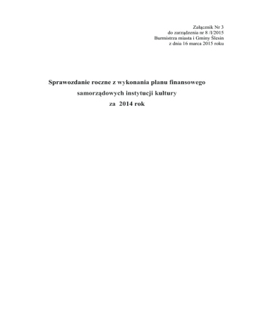 Załącznik Nr 3 do zarządzenia nr 8 /I/2015 Burmistrza miasta i Gminy Ślesin z dnia 16 marca 2015 roku Sprawozdanie roczne z wykonania planu finansowego samorządowych instytucji kultury za 2014 rok Sprawozdanie finansowe z działalności BIBLIOTEKI PUBLICZNEJ MIASTA I GMINY ŚLESIN ZA 2014 ROK Biblioteka Publiczna Miasta i Gminy Ślesin jest miejsko-wiejską biblioteką publiczną działającą na terenie naszej gminy. Bibliotece tej podległe są trzy filie: w Szyszyńskich Holendrach, Piotrkowicach i Licheniu Starym. W bibliotece oraz podległych placówkach zatrudnionych jest 6 osób – w przeliczeniu na pełne etaty jest ich 5. Księgozbiór wszystkich bibliotek liczy sobie 60418 woluminów. W 2014 roku zarejestrowano ogółem 1992 czytelników. W ciągu całego roku wypoŜyczono 50739 woluminów na zewnątrz oraz 709 woluminów i czasopism nieoprawionych w kącikach czytelniczych. W porównaniu z rokiem 2013 wypoŜyczenie ksiąŜek na zewnątrz wzrosło o 471 woluminów. JeŜeli przeanalizujemy ilość zarejestrowanych czytelników takŜe widzimy wzrost o 80 nowo zarejestrowanych czytelników. W 2014 r. przeprowadzono okresową kontrolę księgozbioru w filii w Licheniu Starym i w filii w Piotrkowicach w dniach od 03.03.014 r. do11.03.2014 r. Zakończono opracowanie komputerowe jednostek inwentarzowych w filii w Szyszyńskich Holendrach (z powodu braku środków finansowych na zakup komputera ksiąŜki z tej filii były przewoŜone do biblioteki główniej, opracowywane i odwoŜone.) Rozpoczęto opracowanie komputerowe w filii w Piotrkowicach oraz kontynuowano w filii w Licheniu Starym. Na koniec 2014 roku zostało opracowane 78 % zbiorów. Przeprowadzono takŜe selekcję księgozbioru w trzech filiach – selekcja objęła 1370 woluminów. Ogólnie w 2014 roku zakupiono 1194 nowości wydawniczych (w tym dla filii 145 woluminów). Wartość zakupionych ksiąŜek wyniosła 10.500,00 zł. (w tym dla filii 2.799 zł.). Ze środków Biblioteki Narodowej (dwa programy) na zakup nowości wydawniczych zakupiono 701 nowości wydawniczych na kwotę 13.245,00 zł. Biblioteka otrzymała takŜe 124 dary w postaci ksiąŜek od czytelników i instytucji w kwocie 59,96 zł Stan księgozbioru w poszczególnych bibliotekach: Biblioteka Publiczna Miasta i Gminy Ślesin. Stan księgozbioru na koniec 2014 roku – 27846 woluminów - literatura piękna dla dorosłych – 12151 woluminy - literatura piękna dla dzieci – 5726 woluminów - literatura niebeletrystyczna – 9969 woluminy W 2014 roku zakupiono z dotacji organizatora 348 woluminów na kwotę 7.700,87 zł Dodatkowo Biblioteka Publiczna Miasta i Gminy Ślesin uczestniczyła w dwóch projektach Biblioteki Narodowej w ramach Narodowego Programu Rozwoju Czytelnictwa. Pierwszy to „Zakup nowości wydawniczych do bibliotek Zakup nowości wydawniczych do bibliotek - Priorytet 1” W ramach priorytetu biblioteka otrzymała dofinansowanie na zakup nowości wydawniczych do bibliotek publicznych w kwocie 7.245,00 zł (z czego 1/3 według wytycznych BN została przekazana na zakup nowości dla dzieci i młodzieŜy). Drugi projekt to „Zakup nowości wydawniczych do bibliotek. Zakup nowości wydawniczych do bibliotek publicznych zgodnie z potrzebami partnerskich bibliotek szkolnych - Priorytet 2”. W ramach tego projektu biblioteka otrzymała kwotę 6.000,00 zł. 1. Filia biblioteczna w Licheniu Starym. Stan księgozbioru na koniec 2014 roku – 11274 woluminy - literatura piękna dla dorosłych – 6375 woluminy - literatura piękna dla dzieci – 2451 woluminów - literatura niebeletrystyczna – 2448 woluminy W 2014 roku zakupiono z dotacji organizatora 49 woluminów na kwotę 1.010,76 zł. 2. Filia biblioteczna w Piotrkowicach. Stan księgozbioru na koniec 2014 roku – 10866 woluminów - literatura piękna dla dorosłych – 4784 woluminów - literatura piękna dla dzieci – 3314 woluminy - literatura niebeletrystyczna – 2768 woluminy W 2014 roku zakupiono z dotacji organizatora 40 woluminów na kwotę 788,49 zł. 3. Filia biblioteczna w Szyszyńskich Holendrach. Stan księgozbioru na koniec 2014 roku – 10432 woluminy - literatura piękna dla dorosłych - 2851 woluminów - literatura piękna dla dzieci – 5396 woluminów - literatura niebeletrystyczna – 2185 woluminy W 2014 roku zakupiono z dotacji organizatora 56 woluminów na kwotę 999,88 zł. W ciągu całego roku biblioteka publiczna w Ślesinie wraz z podległymi filiami prowadziła równieŜ działalność kulturalno-edukacyjną. Działalność kulturalno-edukacyjna w Bibliotece Publicznej Miasta i Gminy Ślesin – 2014r. Data Tematy i formy pracy styczeńmarzec 3.02.201414.02.2014 Kontynuacja cyklicznego czytania w grupach przedszkolnych w ZSP w Ślesinie „Biblioferie” Celem spotkań było zapoznanie dzieci z baśniami: „Piękna i bestia”, „Calineczka”, „O srebrnorogim jeleniu”, „Dzikie łabędzie”, ”Kwiat paproci”, „Królowa Śniegu”- audiobook legendy: „Bazyliszek”, wierszami Juliana Tuwima (audiobook), fragmentami powieści „KsiąŜę i Ŝebrak” oraz „Dzieci z Bullerrbyn” a takŜe bajkami: „Stoliczku nakryj się” oraz „O dzielnym rybaku Alim”. Wszystkie bajki były wyświetlane przy uŜyciu projektora typu „Ania”. KaŜde spotkanie trwało 2 h. składało się z dwóch integralnych części: 1)odczytanie wybranego tekstu; 2)zajęcia plastyczne tematycznie powiązane z częścią pierwszą. Liczba uczestników 8*25 na tydzień 180 Uwagi Kwiecień, maj, czerwiec Kwiecień Czytanie ksiąŜek w 8 grupach przedszkolnych ZSP w Ślesinie (4 razy w tygodniu). Organizacja konkursu na pisankę lub inną ozdobę świąteczną (zakup nagród, pozyskanie sponsora, ogłoszenie konkursu w szkole, udostępnienie materiałów o technikach wykonywania pisanek a takŜe ksiąŜek dotyczących tradycji związanych ze Świętami Wielkanocnymi, przygotowanie dyplomów). 26.0311.04.2014 Maj Czas przeznaczony na przygotowanie i oddanie prac przez 