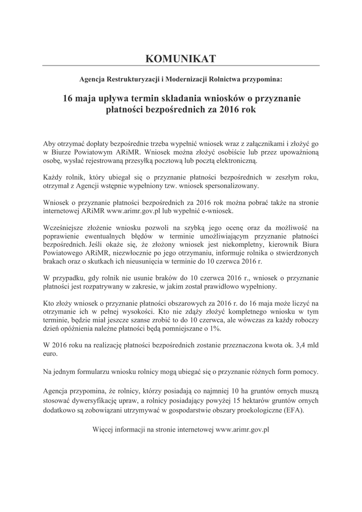 KOMUNIKAT Agencja Restrukturyzacji i Modernizacji Rolnictwa przypomina: 16 maja upływa termin składania wniosków o przyznanie płatności bezpośrednich za 2016 rok Aby otrzymać dopłaty bezpośrednie trzeba wypełnić wniosek wraz z załącznikami i złożyć go w Biurze Powiatowym ARiMR. Wniosek można złożyć osobiście lub przez upoważnioną osobę, wysłać rejestrowaną przesyłką pocztową lub pocztą elektroniczną. Każdy rolnik, który ubiegał się o przyznanie płatności bezpośrednich w zeszłym roku, otrzymał z Agencji wstępnie wypełniony tzw. wniosek spersonalizowany. Wniosek o przyznanie płatności bezpośrednich za 2016 rok można pobrać także na stronie internetowej ARiMR www.arimr.gov.pl lub wypełnić e-wniosek. Wcześniejsze złożenie wniosku pozwoli na szybką jego ocenę oraz da możliwość na poprawienie ewentualnych błędów w terminie umożliwiającym przyznanie płatności bezpośrednich. Jeśli okaże się, że złożony wniosek jest niekompletny, kierownik Biura Powiatowego ARiMR, niezwłocznie po jego otrzymaniu, informuje rolnika o stwierdzonych brakach oraz o skutkach ich nieusunięcia w terminie do 10 czerwca 2016 r. W przypadku, gdy rolnik nie usunie braków do 10 czerwca 2016 r., wniosek o przyznanie płatności jest rozpatrywany w zakresie, w jakim został prawidłowo wypełniony. Kto złoży wniosek o przyznanie płatności obszarowych za 2016 r. do 16 maja może liczyć na otrzymanie ich w pełnej wysokości. Kto nie zdąży złożyć kompletnego wniosku w tym terminie, będzie miał jeszcze szanse zrobić to do 10 czerwca, ale wówczas za każdy roboczy dzień opóźnienia należne płatności będą pomniejszane o 1%. W 2016 roku na realizację płatności bezpośrednich zostanie przeznaczona kwota ok. 3,4 mld euro. Na jednym formularzu wniosku rolnicy mogą ubiegać się o przyznanie różnych form pomocy. Agencja przypomina, że rolnicy, którzy posiadają co najmniej 10 ha gruntów ornych muszą stosować dywersyfikację upraw, a rolnicy posiadający powyżej 15 hektarów gruntów ornych dodatkowo są zobowiązani utrzymywać w gospodarstwie obszary proekologiczne (EFA). Więcej informacji na stronie internetowej www.arimr.gov.pl