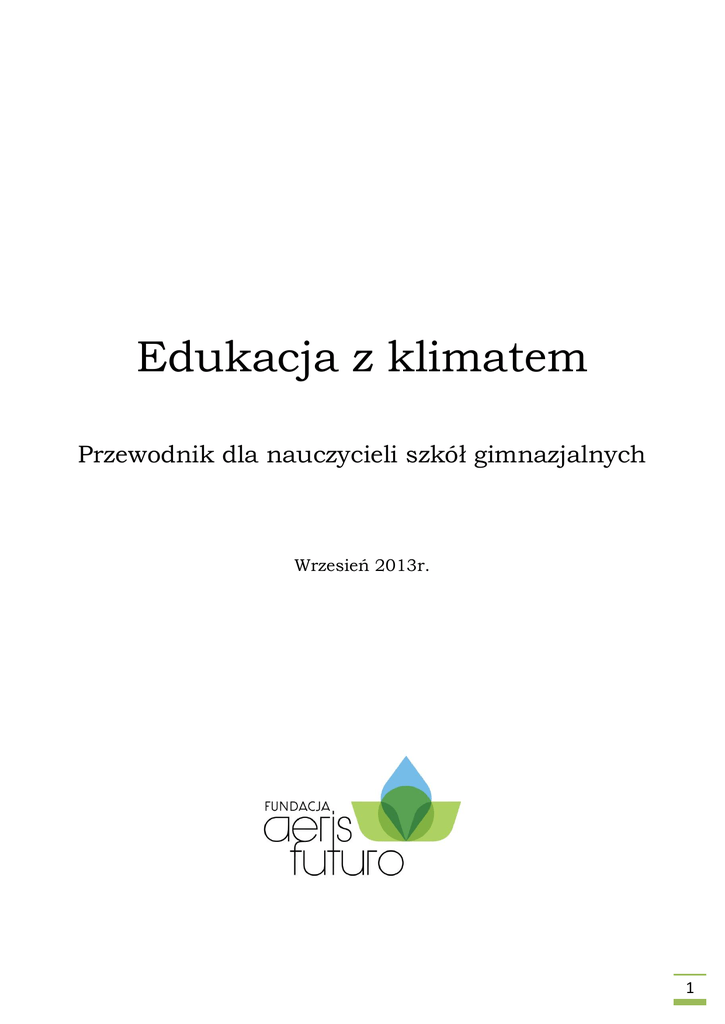 Edukacja z klimatem Przewodnik dla nauczycieli szkół gimnazjalnych Wrzesień 2013r. 1 Autor: Agnieszka Sadowska Nadzór merytoryczny: Joanna Mieszkowicz Wydawca: Fundacja Aeris Futuro Siedziba: Al. Daszyńskiego 22/46, 31-534 Kraków Biuro: ul. Krowoderska 11/8, 31-141 Kraków telefon: 12 430 08 22 e-mail: [email protected] www.aerisfuturo.pl Publikacja powstała w ramach projektu „Edukacja z klimatem” współfinansowanego przez Ministerstwo Środowiska 2 Spis treści Wstęp…………………………………………………………………….…………………………………………….4 Leksykon ważnych pojęć……………………………………………………………………..……………….5 Historia i definicja zrównoważonego rozwoju……………………………………………………….8 Edukacja dla zrównoważonego rozwoju……………………………………..………………………11 Zmiany i zmienność klimatu………………………………........................................................ 13 Czynniki wpływające na zmiany klimatu……………………………………………………………16 Konsekwencje globalnego ocieplenia…………………………………………………………..……..20 Co możemy zrobić, aby przeciwdziałać zmianom klimatu?........................................24 Bibliografia…………………………………………………………………………………………………….…..28 3 „Jeśli myślisz rok naprzód – sadź ryż, Jeśli myślisz 10 lat naprzód – sadź drzewo, Jeśli myślisz 100 lat naprzód – ucz ludzi.” /przysłowie chińskie/ Mądrość zawarta w tym chińskim przysłowiu, która mówi o kluczowym znaczeniu edukacji w kształtowaniu świata dla przyszłych pokoleń nie traci na aktualności szczególnie dziś, gdy stajemy w obliczu nowych, trudnych wyzwań cywilizacyjnych. Chcemy aby otaczający nas świat charakteryzował się równowagą obejmującą korzystanie z zasobów naturalnych, aktywność ekonomiczną i sprawiedliwość społeczną. Te idee wpisują się znakomicie w definicję pojęcia zrównoważonego rozwoju, które, począwszy od Szczytu Ziemi w Rio de Janeiro w roku 1992, stało się trwałym elementem współpracy i prawa międzynarodowego, ale także wspólną koncepcją definiującą na nowo priorytety rozwoju globalnego. Wśród głównych wyzwań współczesnego świata wyjątkowo wyraźnie rysują się: konieczność walki z ubóstwem i głodem, zagwarantowanie ludności swobodnego dostępu do wody pitnej, podjęcie działań na rzecz wyrównywania szans kobiet i mężczyzn, kształtowanie postaw poszanowania różnorodności kulturowej i etnicznej, zapewnienie powszechnego dostępu do edukacji podstawowej, wdrażanie zasad sprawiedliwego handlu, zahamowanie tempa wymierania rzadkich gatunków roślin i zwierząt, a także, przeciwdziałanie zmianom klimatu. Naszym działaniom towarzyszy świadomość, że jedynym kluczem do osiągnięcia tych ambitnych założeń, które w przyszłości przyczynią się do realizacji wizji zrównoważonego, sprawiedliwego, lepszego świata, jest kształtowanie świadomości i właściwych postaw, poprzez skuteczną, interdyscyplinarną edukację na każdym poziomie nauczania. Poprzez projekt „Edukacja z klimatem” chcemy wspierać nauczycieli szkół gimnazjalnych we wdrażaniu elementów edukacji dla zrównoważonego rozwoju do programu nauczania, aby inspirowali uczniów do działania zgodnie z ideą „Myśl globalnie – działaj lokalnie”. Jesteśmy głęboko przekonani, że realizacja tego projektu przyczyni się do nawiązania owocnej współpracy z Państwem oraz do zaangażowania uczniów w działania na rzecz zrównoważono rozwoju, abyśmy wspólnie mogli stworzyć klimat dla przyszłości. Joanna Mieszkowicz z zespołem Fundacji Aeris Futuro 4 Leksykon ważnych pojęć Rozwój zrównoważony (ang. sustainable development) – według definicji sformułowanej w 1987 roku, w Raporcie Światowej Komisji Środowiska i Rozwoju ONZ, rozwój zrównoważony to "proces mający na celu zaspokojenie aspiracji rozwojowych obecnego pokolenia, w sposób umożliwiający realizację tych samych dążeń następnym pokoleniom”. W praktyce, stworzenie modelu świata rozwijającego się w sposób zrównoważony wymaga integracji działań na trzech kluczowych obszarach: Ekonomii i wzrostu gospodarczego Rozwoju społecznego Ochrony środowiska i gospodarowania zasobami naturalnymi CSR (Corporate Social Responsibility, pol. społeczna odpowiedzialność przedsiębiorstw) – Koncepcja zakładająca uwzględnianie problematyki społecznej i środowiskowej przez firmy i przedsiębiorstwa w trakcie tworzenia strategii biznesowych. Głównym założeniem CSR jest zobowiązanie biznesu do brania odpowiedzialności za wpływ podejmowanych decyzji i aktywności na społeczeństwo i środowisko. Koncepcja CSR wynika bezpośrednio z teorii rozwoju zrównoważonego. Agenda 21 – dokument programowy przyjęty z inicjatywy ONZ na Konferencji Narodów Zjednoczonych na temat Środowiska i Rozwoju, która odbyła się w 1992 roku w Rio de Janeiro. Dokument ten stanowi podstawę do opracowywania i wdrażania programów zrównoważonego rozwoju na poziomie globalnym, krajowym czy lokalnym. Agenda 21 opisuje cele i działania konieczne do podjęcia na obszarach: społeczno-ekonomicznym, ochrony środowiska i zarządzania jego zasobami oraz wzmacniania roli różnych grup społecznych w tym m.in. kobiet, dzieci i ludności rdzennej, ale również władz samorządowych, organizacji pozarządowych i biznesu. Szczyt Ziemi 1992 r. – skrótowa nazwa Konferencji Narodów Zjednoczonych dla Rozwoju i Środowiska. Konferencja odbyła się w Rio de Janeiro, w roku 1992. W zorganizowanej przez ONZ konferencji uczestniczyły rządy 172 krajów. W jej trakcie uchwalono szereg fundamentalnych d