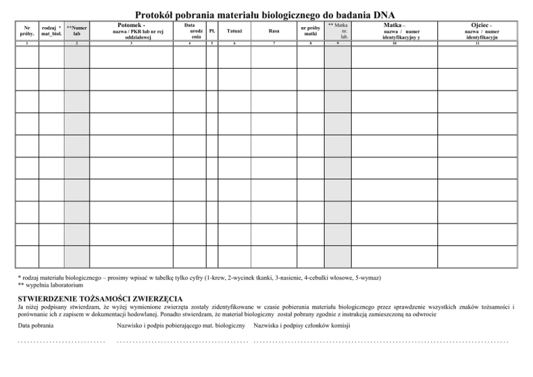 Protokół pobrania materiału biologicznego do badania DNA Nr próby. rodzaj * mat_biol. 1 **Numer lab 2 Potomek nazwa / PKR lub nr rej oddziałowej 3 Data urodz enia 4 Pł. Tatuaż Rasa nr próby matki ** Matka nr. lab. 5 6 7 8 9 Matka – nazwa / numer identyfikacyjny y 10 Ojciec nazwa / numer identyfikacyjn 11 * rodzaj materiału biologicznego – prosimy wpisać w tabelkę tylko cyfry (1-krew, 2-wycinek tkanki, 3-nasienie, 4-cebulki włosowe, 5-wymaz) ** wypełnia laboratorium STWIERDZENIE TOŻSAMOŚCI ZWIERZĘCIA Ja niżej podpisany stwierdzam, że wyżej wymienione zwierzęta zostały zidentyfikowane w czasie pobierania materiału biologicznego przez sprawdzenie wszystkich znaków tożsamości i porównanie ich z zapisem w dokumentacji hodowlanej. Ponadto stwierdzam, że materiał biologiczny został pobrany zgodnie z instrukcją zamieszczoną na odwrocie Data pobrania Nazwisko i podpis pobierającego mat. biologiczny Nazwiska i podpisy członków komisji ............................ .......................................... ................................................................................. Instrukcja pobierania i przechowywania materiału biologicznego do badań DNA u psowatych Krew • krew do badań DNA należy pobierać jedynie do probówek, gdzie antykoagulantem jest EDTA. • probówek nie wolno napełniać powyżej zaznaczonej kreski. • zaraz po napełnieniu krew należy dobrze wymieszać przez kilkukrotne odwracanie probówki. • krew należy przechowywać w lodówce, a gdy konieczne jest dłuższe przechowywanie (więcej niż 3 dni) należy ją zamrozić w -20°C. • do wysyłki probówki należy zabezpieczyć przed zgnieceniem przez owinięcie folią pęcherzykową lub grubą warstwą ligniny. Cebulki włosowe Pobieranie cebulek włosowych: wyrwać kilkanaście włosów wraz z cebulkami (najlepiej z za pomocą kleszczy kombinerek z grzbietu karku), włożyć do czystego woreczka ze struną, przechowywać zabezpieczone od światła w temperaturze pokojowej. Należy uważać aby nie pobierać włosów martwych. Na końcach żywych włosów muszą być widoczne cebulki. Tkanka mięśniowa. Fragment tkanki mięśniowej (np. od martwego zwierzęcia) pobieramy skalpelem i przechowujemy w próbówce z nakrętką (np. z EDTA do pobierania krwi) w postaci zamrożonej Wymaz Odpieczętowujemy wymazówkę, otwieramy ją i końcem z watą – (nie dotykając go!!!) mocno kilkakrotnie pocieramy po wewnętrznej stronie policzka. Po zakończeniu zamykamy i opisujemy. Przechowujemy w lodówce.