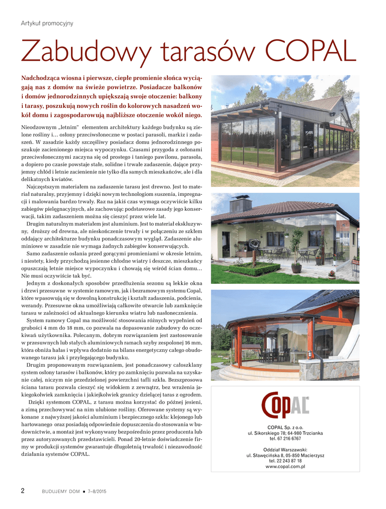 Artykuł promocyjny Zabudowy tarasów COPAL Nadchodząca wiosna i pierwsze, ciepłe promienie słońca wyciągają nas z domów na świeże powietrze. Posiadacze balkonów i domów jednorodzinnych upiększają swoje otoczenie: balkony i tarasy, poszukują nowych roślin do kolorowych nasadzeń wokół domu i zagospodarowują najbliższe otoczenie wokół niego. Nieodzownym „letnim” elementem architektury każdego budynku są zielone rośliny i… osłony przeciwsłoneczne w postaci parasoli, markiz i zadaszeń. W zasadzie każdy szczęśliwy posiadacz domu jednorodzinnego poszukuje zacienionego miejsca wypoczynku. Czasami przygoda z osłonami przeciwsłonecznymi zaczyna się od prostego i taniego pawilonu, parasola, a dopiero po czasie powstaje stałe, solidne i trwałe zadaszenie, dające przyjemny chłód i letnie zacienienie nie tylko dla samych mieszkańców, ale i dla delikatnych kwiatów. Najczęstszym materiałem na zadaszenie tarasu jest drewno. Jest to materiał naturalny, przyjemny i dzięki nowym technologiom suszenia, impregnacji i malowania bardzo trwały. Raz na jakiś czas wymaga oczywiście kilku zabiegów pielęgnacyjnych, ale zachowując podstawowe zasady jego konserwacji, takim zadaszeniem można się cieszyć przez wiele lat. Drugim naturalnym materiałem jest aluminium. Jest to materiał ekskluzywny, droższy od drewna, ale nieskończenie trwały i w połączeniu ze szkłem oddający architekturze budynku ponadczasowym wygląd. Zadaszenie aluminiowe w zasadzie nie wymaga żadnych zabiegów konserwujących. Samo zadaszenie osłania przed gorącymi promieniami w okresie letnim, i niestety, kiedy przychodzą jesienne chłodne wiatry i deszcze, mieszkańcy opuszczają letnie miejsce wypoczynku i chowają się wśród ścian domu… Nie musi oczywiście tak być. Jednym z doskonałych sposobów przedłużenia sezonu są lekkie okna i drzwi przesuwne w systemie ramowym, jak i bezramowym systemu Copal, które wpasowują się w dowolną konstrukcję i kształt zadaszenia, podcienia, werandy. Przesuwne okna umożliwiają całkowite otwarcie lub zamknięcie tarasu w zależności od aktualnego kierunku wiatru lub nasłonecznienia. System ramowy Copal ma możliwość stosowania różnych wypełnień od grubości 4 mm do 18 mm, co pozwala na dopasowanie zabudowy do oczekiwań użytkownika. Polecanym, dobrym rozwiązaniem jest zastosowanie w przesuwnych lub stałych aluminiowych ramach szyby zespolonej 16 mm, która obniża hałas i wpływa dodatnio na bilans energetyczny całego obudowanego tarasu jak i przylegającego budynku. Drugim proponowanym rozwiązaniem, jest ponadczasowy całoszklany system osłony tarasów i balkonów, który po zamknięciu pozwala na uzyskanie całej, niczym nie przedzielonej powierzchni tafli szkła. Bezszprosowa ściana tarasu pozwala cieszyć się widokiem z zewnątrz, bez wrażenia jakiegokolwiek zamknięcia i jakiejkolwiek granicy dzielącej taras z ogrodem. Dzięki systemom COPAL, z tarasu można korzystać do późnej jesieni, a zimą przechowywać na nim ulubione rośliny. Oferowane systemy są wykonane z najwyższej jakości aluminium i bezpiecznego szkła: klejonego lub hartowanego oraz posiadają odpowiednie dopuszczenia do stosowania w budownictwie, a montaż jest wykonywany bezpośrednio przez producenta lub przez autoryzowanych przedstawicieli. Ponad 20-letnie doświadczenie firmy w produkcji systemów gwarantuje długoletnią trwałość i niezawodność działania systemów COPAL. 2 budujemy dom 7–8/2015 COPAL Sp. z o.o. ul. Sikorskiego 78; 64-980 Trzcianka tel. 67 216 6767 Oddział Warszawski: ul. Sławęcińska 8, 05-850 Macierzysz tel. 22 243 87 18 www.copal.com.pl