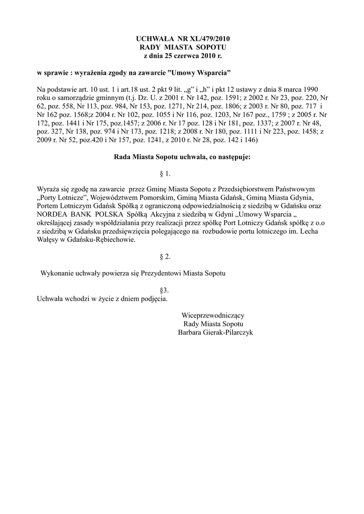 UCHWAŁA NR XL/479/2010 RADY MIASTA SOPOTU z dnia 25 czerwca 2010 r. w sprawie : wyrażenia zgody na zawarcie ”Umowy Wsparcia” Na podstawie art. 10 ust. 1 i art.18 ust. 2 pkt 9 lit. „g” i „h” i pkt 12 ustawy z dnia 8 marca 1990 roku o samorządzie gminnym (t.j. Dz. U. z 2001 r. Nr 142, poz. 1591; z 2002 r. Nr 23, poz. 220, Nr 62, poz. 558, Nr 113, poz. 984, Nr 153, poz. 1271, Nr 214, poz. 1806; z 2003 r. Nr 80, poz. 717 i Nr 162 poz. 1568;z 2004 r. Nr 102, poz. 1055 i Nr 116, poz. 1203, Nr 167 poz., 1759 ; z 2005 r. Nr 172, poz. 1441 i Nr 175, poz.1457; z 2006 r. Nr 17 poz. 128 i Nr 181, poz. 1337; z 2007 r. Nr 48, poz. 327, Nr 138, poz. 974 i Nr 173, poz. 1218; z 2008 r. Nr 180, poz. 1111 i Nr 223, poz. 1458; z 2009 r. Nr 52, poz.420 i Nr 157, poz. 1241, z 2010 r. Nr 28, poz. 142 i 146) Rada Miasta Sopotu uchwala, co następuje: § 1. Wyraża się zgodę na zawarcie przez Gminę Miasta Sopotu z Przedsiębiorstwem Państwowym „Porty Lotnicze”, Województwem Pomorskim, Gminą Miasta Gdańsk, Gminą Miasta Gdynia, Portem Lotniczym Gdańsk Spółką z ograniczoną odpowiedzialnością z siedzibą w Gdańsku oraz NORDEA BANK POLSKA Spółką Akcyjna z siedzibą w Gdyni „Umowy Wsparcia „ określającej zasady współdziałania przy realizacji przez spółkę Port Lotniczy Gdańsk spółkę z o.o z siedzibą w Gdańsku przedsięwzięcia polegającego na rozbudowie portu lotniczego im. Lecha Wałęsy w Gdańsku-Rębiechowie. § 2. Wykonanie uchwały powierza się Prezydentowi Miasta Sopotu §3. Uchwała wchodzi w życie z dniem podjęcia. Wiceprzewodniczący Rady Miasta Sopotu Barbara Gierak-Pilarczyk U ZASAD N I E N I E Port Lotniczy Gdańsk spółka z o.o. z siedzibą w Gdańsku realizuje obecnie Program Inwestycyjny na lata 2009-2015. W ramach Projektu Spółka zamierza wybudować nowy terminal pasażerski wraz z wyposażeniem i infrastrukturą towarzyszącą, drogę kołowania równoległą do drogi startowej, płytę postojową dla samolotów, stanowisko do odladzania, system odprowadzania wód opadowych, budynek biurowy, system monitoringu hałasu wraz z ochroną antyhałasową, system energetyczny – na lotnisku Gdańsk im. Lecha Wałęsy w Gdańsku oraz zakupić wóz strażacki Projekt zostanie częściowo sfinansowany ze środków własnych Spółki, podwyższenia kapitału zakładowego przez Wspólników w kwocie 55,5 mln. zł. oraz środków z Programu Operacyjnego Infrastruktura i Środowisko. W celu sfinansowania pozostałych kosztów Projektu zawarta zostanie między spółką Port Lotniczy Gdańsk sp. z o.o. z siedzibą w Gdańsku (Emitentem) a Nordea Bank Polska S.A. z siedzibą w Gdyni umowa emisyjna, na podstawie której Emitent wyemituje obligacje, a. środki uzyskane z emisji tych obligacji przeznaczone zostaną przez Emitenta na finansowanie Projektu. Wspólnicy spółki Port Lotniczy Gdańsk sp. z o.o. z siedzibą w Gdańsku zgodzili się poprzeć Projekt, a obecnie uwzględniając zamiar zawarcia pomiędzy Spółką a Bankiem umowy emisyjnej oraz intencje Emitenta dotyczące emisji obligacji zamierzają udzielić wsparcia Emitentowi w sposób określony w „Umowie Wsparcia”. „Umową Wsparcia”, z którą można było zapoznać się w Biurze Rady Miasta Sopotu, Gmina Miasta Sopotu jako wspólnik spółki Port Lotniczy Gdańsk sp. z o.o. z siedzibą w Gdańsku udziela wyłącznie „wsparcia korporacyjnego” ( z wyłączeniem wsparcia finansowego) polegającego między innymi na zobowiązaniu się miasta do tego, że bez pisemnej zgody Banku Gmina Miasta Sopotu nie podejmie żadnych działań zmierzających do likwidacji, przekształcenia, połączenia, podziału Spółki albo obniżenia kapitału zakładowego Spółki lub umorzenia udziałów w Spółce w związku z emisją przez Spółkę obligacji, w celu sfinansowania w/w Projektu. . Mając na względzie powyższe Prezydent Miasta Sopotu wnioskuje o podjęcie przedmiotowej uchwały.