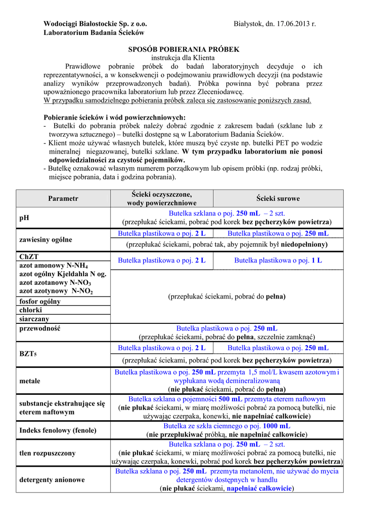 Wodociągi Białostockie Sp. z o.o. Laboratorium Badania Ścieków Białystok, dn. 17.06.2013 r. SPOSÓB POBIERANIA PRÓBEK instrukcja dla Klienta Prawidłowe pobranie próbek do badań laboratoryjnych decyduje o ich reprezentatywności, a w konsekwencji o podejmowaniu prawidłowych decyzji (na podstawie analizy wyników przeprowadzonych badań). Próbka powinna być pobrana przez upoważnionego pracownika laboratorium lub przez Zleceniodawcę. W przypadku samodzielnego pobierania próbek zaleca się zastosowanie poniższych zasad. Pobieranie ścieków i wód powierzchniowych: - Butelki do pobrania próbek należy dobrać zgodnie z zakresem badań (szklane lub z tworzywa sztucznego) – butelki dostępne są w Laboratorium Badania Ścieków. - Klient może używać własnych butelek, które muszą być czyste np. butelki PET po wodzie mineralnej niegazowanej, butelki szklane. W tym przypadku laboratorium nie ponosi odpowiedzialności za czystość pojemników. - Butelkę oznakować własnym numerem porządkowym lub opisem próbki (np. rodzaj próbki, miejsce pobrania, data i godzina pobrania). Parametr pH zawiesiny ogólne ChZT azot amonowy N-NH4 azot ogólny Kjeldahla N og. azot azotanowy N-NO3 azot azotynowy N-NO2 fosfor ogólny chlorki siarczany przewodność BZT5 Ścieki oczyszczone, Ścieki surowe wody powierzchniowe Butelka szklana o poj. 250 mL – 2 szt. (przepłukać ściekami, pobrać pod korek bez pęcherzyków powietrza) Butelka plastikowa o poj. 2 L Butelka plastikowa o poj. 250 mL (przepłukać ściekami, pobrać tak, aby pojemnik był niedopełniony) Butelka plastikowa o poj. 2 L Butelka plastikowa o poj. 1 L (przepłukać ściekami, pobrać do pełna) Butelka plastikowa o poj. 250 mL (przepłukać ściekami, pobrać do pełna, szczelnie zamknąć) Butelka plastikowa o poj. 2 L Butelka plastikowa o poj. 250 mL (przepłukać ściekami, pobrać pod korek bez pęcherzyków powietrza) Butelka plastikowa o poj. 250 mL przemyta 1,5 mol/L kwasem azotowym i wypłukana wodą demineralizowaną (nie płukać ściekami, pobrać do pełna) Butelka szklana o pojemności 500 mL przemyta eterem naftowym substancje ekstrahujące się (nie płukać ściekami, w miarę możliwości pobrać za pomocą butelki, nie eterem naftowym używając czerpaka, konewki, nie napełniać całkowicie) Butelka ze szkła ciemnego o poj. 1000 mL Indeks fenolowy (fenole) (nie przepłukiwać próbką, nie napełniać całkowicie) Butelka szklana o poj. 250 mL – 2 szt. (nie płukać ściekami, w miarę możliwości pobrać za pomocą butelki, nie tlen rozpuszczony używając czerpaka, konewki, pobrać pod korek bez pęcherzyków powietrza) Butelka szklana o poj. 250 mL przemyta metanolem, nie używać do mycia detergentów dostępnych w handlu detergenty anionowe (nie płukać ściekami, napełniać całkowicie) metale Pobieranie osadów: - Reprezentatywną próbkę komunalnego osadu ściekowego do badań uzyskuje się przez połączenie i dokładne zmieszanie próbek pobranych w tym samym czasie z różnych miejsc osadu ściekowego komunalnego przeznaczonego do badań, ich liczba wynosi co najmniej: 10 próbek - przy objętości osadu ściekowego do 50 m3 15 próbek - przy objętości osadu ściekowego powyżej 50 m3 do 100m3 30 próbek - przy objętości osadu ściekowego powyżej 100 m3. - Próbki do badań biologicznych pobrać do sterylnego słoika lub sterylnego worka: 0,5 kg - Próbki do badań fizykochemicznych pobrać do czystego plastikowego naczynia: 1 kg - Próbki osadu czynnego do badań mikroskopowych i indeksu objętości, pobrać do butelki plastikowej, nie napełniać całkowicie: 1,5 L - Sprzęt do pobierania próbek osadów powinien być czysty, najlepiej plastikowy (uwaga: w przypadku oznaczania metali do pobrania próbki używać wyłącznie sprzętu plastikowego). - Naczynia z pobranymi próbkami oznakować własnym numerem porządkowym lub opisem próbki (np. rodzaj próbki, miejsce pobrania, data i godzina pobrania). - Dołączyć szkic z miejscami pobrania próbek. Pobrane próbki należy dostarczyć do laboratorium w możliwie najkrótszym czasie. Transport próbki w ciemnym, schłodzonym pojemniku. Wymagana temperatura transportu (0 – 4) °C. Laboratorium przejmuje odpowiedzialność za próbkę od momentu przejęcia jej do badania.