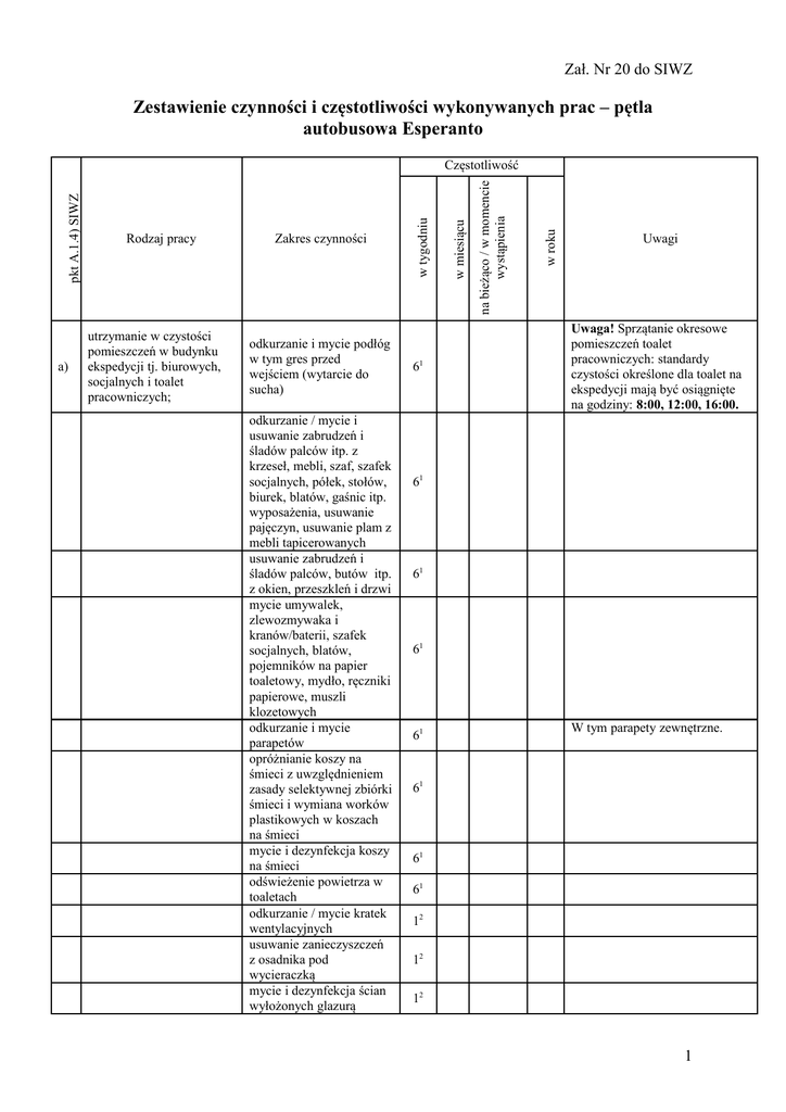 Zał. Nr 20 do SIWZ Zestawienie czynności i częstotliwości wykonywanych prac – pętla autobusowa Esperanto a) utrzymanie w czystości pomieszczeń w budynku ekspedycji tj. biurowych, socjalnych i toalet pracowniczych; odkurzanie i mycie podłóg w tym gres przed wejściem (wytarcie do sucha) odkurzanie / mycie i usuwanie zabrudzeń i śladów palców itp. z krzeseł, mebli, szaf, szafek socjalnych, półek, stołów, biurek, blatów, gaśnic itp. wyposażenia, usuwanie pajęczyn, usuwanie plam z mebli tapicerowanych usuwanie zabrudzeń i śladów palców, butów itp. z okien, przeszkleń i drzwi mycie umywalek, zlewozmywaka i kranów/baterii, szafek socjalnych, blatów, pojemników na papier toaletowy, mydło, ręczniki papierowe, muszli klozetowych odkurzanie i mycie parapetów opróżnianie koszy na śmieci z uwzględnieniem zasady selektywnej zbiórki śmieci i wymiana worków plastikowych w koszach na śmieci mycie i dezynfekcja koszy na śmieci odświeżenie powietrza w toaletach odkurzanie / mycie kratek wentylacyjnych usuwanie zanieczyszczeń z osadnika pod wycieraczką mycie i dezynfekcja ścian wyłożonych glazurą 61 w roku na bieżąco / w momencie wystąpienia Zakres czynności w miesiącu Rodzaj pracy w tygodniu pkt A.1.4) SIWZ Częstotliwość Uwagi Uwaga! Sprzątanie okresowe pomieszczeń toalet pracowniczych: standardy czystości określone dla toalet na ekspedycji mają być osiągnięte na godziny: 8:00, 12:00, 16:00. 61 61 61 61 W tym parapety zewnętrzne. 61 61 61 12 12 12 1 odkurzanie termy/bojlera do podgrzewania wody mycie chłodziarki uzupełnianie w zamontowanych do tego celu pojemnikach, papieru toaletowego, ręczników papierowych i mydła pranie / czyszczenie mat / wycieraczek mycie drzwi i okien czyszczenie / pranie mebli tapicerowanych b) utrzymanie w czystości powierzchni działki, na której znajduje się pętla autobusowa, tj. powierzchni: jezdni, chodników, trawników, przystanków, miejsc parkingowych, miejsca wyznaczonego na pojemnik na śmieci, elewacji budynku ekspedycji; w roku na bieżąco / w momencie wystąpienia Zakres czynności w miesiącu Rodzaj pracy w tygodniu pkt A.1.4) SIWZ Częstotliwość Uwagi 12 12 X 13 X 44 1 Na zlecenie W 1 i 3 tygodniu miesiąca. odkurzanie/zamiatanie całej powierzchni pętli autobusowej usuwanie śmieci i wszelkich odpadów nieorganicznych i organicznych, także martwych zwierząt, ptaków, odchodów zwierzęcych itp. zanieczyszczeń; mechaniczne lub ręczne usuwanie ziemi, piasku, żwiru, błota, gruzu itp. zanieczyszczeń likwidacja przerostów, traw i chwastów, usuwanie samosiewów drzew o średnicy ok. 5 cm wraz z systemem korzeniowym usuwanie opadłych liści, gałęzi, owoców/nasion drzew i krzewów, uschniętych części roślin 25 X X X X 2 c) d) e) zrywanie i usuwanie ogłoszeń, na których umieszczenie Zamawiający nie wyraził zgody X usuwanie graffiti X usuwanie cieczy i ich pozostałości, w tym m. in.: olejów, płynów, smarów, plam itp. zanieczyszczeń X usuwanie zanieczyszczeń z elewacji X likwidacja gołoledzi na terenie pętli autobusowej: chodników, jezdni, przystanków, miejsc parkingowych; posypywanie substancją zabezpieczającą przed zamarzaniem zgodnie z pkt. A. 5. SIWZ, aż do całkowitej likwidacji gołoledzi odśnieżanie terenu pętli autobusowej: chodników, jezdni, przystanków, miejsc parkingowych; odśnieżanie mechaniczne lub ręczne nawierzchni w sposób jej nie niszczący oraz składowanie odgarniętego śniegu na pryzmy w miejscach nie powodujących utrudnień w ruchu odśnieżanie dachu budynku ekspedycji i wiat przystankowych; usunięcie pokrywy śnieżnej w sposób nie uszkadzający oczyszczanej powierzchni w roku na bieżąco / w momencie wystąpienia Zakres czynności w miesiącu Rodzaj pracy w tygodniu pkt A.1.4) SIWZ Częstotliwość w momencie wystąpienia opadów śniegu lub/i gołoledzi, niezależnie od wyznaczonych dni i godzin sprzątania – prace muszą zacząć się najpóźniej w 60 minut po wystąpieniu opadów śniegu lub/i gołoledzi i trwać do momentu uzyskania optymalnego stanu nawierzchni. X Uwagi Technologię usuwania graffiti należy dostosować do rodzaju czyszczonej powierzchni. Rozstawienie w dniu rozpoczęcia umowy i usunięcie do dnia 20 kwietnia oraz ponowne rozstawienie do dnia 20 października na terenie zewnętrznym minimum 4 pojemników z substancją zabezpieczającą przed zamarzaniem zgodnie z pkt. A. 5. SIWZ, (bezpieczną ekologicznie i zgodnie z obowiązującymi przepisami). Śnieg nie może przylegać do elewacji. W przypadku obfitych opadów śniegu i braku możliwości jego składowania do Wykonawcy będzie należało usunięcie śniegu i wywożenie z terenu pętli w miejsce wskazane w stosownych aktach prawa miejscowego dla m.st. Warszawy. Należy także usuwać śnieg z ławek. Monitorowanie grubości pokrywy śnieżnej spoczywa na Wykonawcy, który zgłasza Zamawiającemu potrzebę jej usunięcia. Wykonawca przystępuje do prac po otrzymaniu stosownego zlecenia. 3 f) czyszczenie elementów wyposażenia pętli; g) opróżnianie oraz wymiana worków plastikowych w koszach na śmieci; h) mycie koszy na śmieci; i) likwidacja wycieków pozostawionych przez pojazdy; usunięcie sopli lodu i nawisów śnieżnych w sposób nie uszkadzający oczyszczanej powierzchni X wywożenie śniegu z terenu pętli X odkurzenie / umycie i wypolerowanie elementów wyposażenia usuwanie śmieci z koszy z uwzględnieniem zasady selektywnej zbiórki śmieci każdorazowa wymiana worków plastikowych na odpady w koszach czyszczenie zewnętrznej powierzchni koszy umycie z użyciem środka dezynfekującego z zewnątrz i wewnątrz wkładów koszy oraz czyszczenie zewnętrznej powierzchni koszy na śmieci zbieranie substancji ciekłych i stałych, pozostawionych przez nieszczelne układy olejowe, paliwowe i chłodzące za pomocą sprzętu i materiałów do tego celu przeznaczonych (wióry, ścinki tekstylne, piasek, woda itp.) unieszkodliwianie zebr