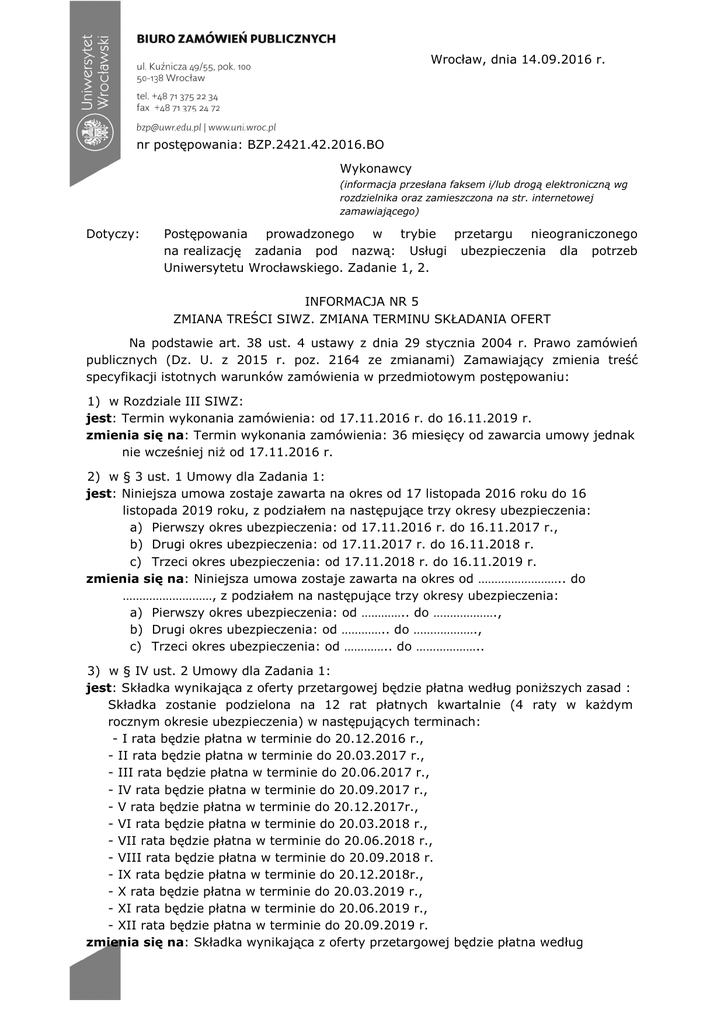 Wrocław, dnia 14.09.2016 r. nr postępowania: BZP.2421.42.2016.BO Wykonawcy (informacja przesłana faksem i/lub drogą elektroniczną wg rozdzielnika oraz zamieszczona na str. internetowej zamawiającego) Dotyczy: Postępowania prowadzonego w trybie przetargu nieograniczonego na realizację zadania pod nazwą: Usługi ubezpieczenia dla potrzeb Uniwersytetu Wrocławskiego. Zadanie 1, 2. INFORMACJA NR 5 ZMIANA TREŚCI SIWZ. ZMIANA TERMINU SKŁADANIA OFERT Na podstawie art. 38 ust. 4 ustawy z dnia 29 stycznia 2004 r. Prawo zamówień publicznych (Dz. U. z 2015 r. poz. 2164 ze zmianami) Zamawiający zmienia treść specyfikacji istotnych warunków zamówienia w przedmiotowym postępowaniu: 1) w Rozdziale III SIWZ: jest: Termin wykonania zamówienia: od 17.11.2016 r. do 16.11.2019 r. zmienia się na: Termin wykonania zamówienia: 36 miesięcy od zawarcia umowy jednak nie wcześniej niż od 17.11.2016 r. 2) w § 3 ust. 1 Umowy dla Zadania 1: jest: Niniejsza umowa zostaje zawarta na okres od 17 listopada 2016 roku do 16 listopada 2019 roku, z podziałem na następujące trzy okresy ubezpieczenia: a) Pierwszy okres ubezpieczenia: od 17.11.2016 r. do 16.11.2017 r., b) Drugi okres ubezpieczenia: od 17.11.2017 r. do 16.11.2018 r. c) Trzeci okres ubezpieczenia: od 17.11.2018 r. do 16.11.2019 r. zmienia się na: Niniejsza umowa zostaje zawarta na okres od …………………….. do ………………………, z podziałem na następujące trzy okresy ubezpieczenia: a) Pierwszy okres ubezpieczenia: od ………….. do ………………., b) Drugi okres ubezpieczenia: od ………….. do ………………., c) Trzeci okres ubezpieczenia: od ………….. do ……………….. 3) w § IV ust. 2 Umowy dla Zadania 1: jest: Składka wynikająca z oferty przetargowej będzie płatna według poniższych zasad : Składka zostanie podzielona na 12 rat płatnych kwartalnie (4 raty w każdym rocznym okresie ubezpieczenia) w następujących terminach: - I rata będzie płatna w terminie do 20.12.2016 r., - II rata będzie płatna w terminie do 20.03.2017 r., - III rata będzie płatna w terminie do 20.06.2017 r., - IV rata będzie płatna w terminie do 20.09.2017 r., - V rata będzie płatna w terminie do 20.12.2017r., - VI rata będzie płatna w terminie do 20.03.2018 r., - VII rata będzie płatna w terminie do 20.06.2018 r., - VIII rata będzie płatna w terminie do 20.09.2018 r. - IX rata będzie płatna w terminie do 20.12.2018r., - X rata będzie płatna w terminie do 20.03.2019 r., - XI rata będzie płatna w terminie do 20.06.2019 r., - XII rata będzie płatna w terminie do 20.09.2019 r. zmienia się na: Składka wynikająca z oferty przetargowej będzie płatna według poniższych zasad: Składka zostanie podzielona na 12 rat płatnych kwartalnie (4 raty w każdym rocznym okresie ubezpieczenia) w następujących terminach: - I rata będzie płatna w terminie do ………………., - II rata będzie płatna w terminie do ………………., - III rata będzie płatna w terminie do ………………., - IV rata będzie płatna w terminie do ………………., - V rata będzie płatna w terminie do ………………., - VI rata będzie płatna w terminie do ………………., - VII rata będzie płatna w terminie do ………………., - VIII rata będzie płatna w terminie do ………………., - IX rata będzie płatna w terminie do ………………., - X rata będzie płatna w terminie do ………………., - XI rata będzie płatna w terminie do ………………., - XII rata będzie płatna w terminie do ………………., 4) w § 3 ust. 1 Umowy dla Zadania 2: jest: Niniejsza umowa zostaje zawarta na okres od 17 listopada 2016 roku do 16 listopada 2019 roku, z podziałem na następujące trzy okresy ubezpieczenia: 1.1. W przypadku obowiązkowego ubezpieczenia odpowiedzialności cywilnej posiadaczy pojazdów mechanicznych: a) Pierwszy okres ubezpieczenia: roczny, od dnia wskazanego przy poszczególnych pojazdach w Załączniku Nr 12 do SIWZ. Z dniem 16.11.2017 r. nastąpi wyrównanie okresów – zostaną rozwiązane aktualne na ten dzień umowy ubezpieczenia, a składka za niewykorzystany okres ochrony z rozwiązanych umów zostanie zaliczona na poczet kolejno zawartych umów ubezpieczenia. b) Drugi okres ubezpieczenia: od 17.11.2017 r. do 16.11.2018 r., c) Trzeci okres ubezpieczenia: od 17.11.2018 r. do 16.11.2019 r. 1.2. W przypadku ubezpieczenia Auto-Casco, ubezpieczenia następstw nieszczęśliwych wypadków kierowcy i pasażerów oraz ubezpieczenia Assistance: a) Pierwszy okres ubezpieczenia: od dnia wskazanego przy poszczególnych pojazdach w Załączniku Nr 12 do SIWZ do dnia 16.11.2017 r. W przypadku ubezpieczenia krótkoterminowego składka będzie naliczona proporcjonalnie do czasu trwania okres ubezpieczenia licząc 1/365 składki rocznej za każdy dzień ochrony ubezpieczeniowej bez stosowania tabeli frakcyjnej. b) Drugi okres ubezpieczenia: od 17.11.2017 r. do 16.11.2018 r. c) Trzeci okres ubezpieczenia: od 17.11.2018 r. do 16.11.2019 r. zmienia się na: Niniejsza umowa zostaje zawarta na okres od ………………………. roku do ………………………… roku, z podziałem na następujące trzy okresy ubezpieczenia: 1.1. W przypadku obowiązkowego ubezpieczenia odpowiedzialności cywilnej posiadaczy pojazdów mechanicznych: a) Pierwszy okres ubezpieczenia: roczny, od dnia wskazanego przy poszczególnych pojazdach w Załączniku Nr 12 do SIWZ. Z dniem …………………………… r. nastąpi wyrównanie okresów – zostaną rozwiązane aktualne na ten dzień umowy ubezpieczenia, a składka za niewykorzystany okres ochrony z rozwiązanych umów zostanie zaliczona na poczet kolejno zawartych umów ubezpieczenia. b) Drugi okres ubezpieczenia: od …………………………. do ………………………………….., c) Trzeci okres ubezpieczenia: od …………………………. do …………………………………... 1.2. W przypadk
