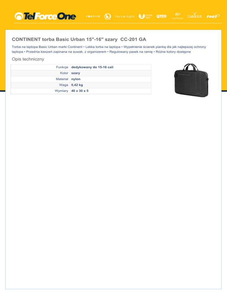 CONTINENT torba Basic Urban 15"-16" szary CC-201 GA Torba na laptopa Basic Urban marki Continent • Lekka torba na laptopa • Wypełnienie ścianek pianką dla jak najlepszej ochrony laptopa • Przednia kieszeń zapinana na suwak, z organizerem • Regulowany pasek na ramię • Różne kolory dostępne Opis techniczny Funkcje dedykowany do 15-16 cali Kolor szary Materiał nylon Waga 0,42 kg Wymiary 40 x 30 x 5