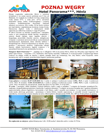 POZNAJ WĘGRY Hotel Panorama***, Hévíz Słynne węgierskie uzdrowisko Hévíz z jeziorem termalnym o tej samej nazwie położone jest 8 km od Balatonu. Ze względu na wielkość (4,5 ha), temperaturę wody (latem 35°C, a zimą pow. 25°C) zawartość minerałów (potas, siarka, wodorowęglany) i scenerię (ciekawy architektonicznie drewniany budynek zdrojowy na jeziorze, lilie wodne, 50 ha lasów) jezioro jest największą i najpiękniejszą leczniczą wanną świata. Intensywny dopływ wody z okolicznych źródeł zapewnia jej całkowitą wymianę w ciągu 48 godzin. W Hévíz leczone są choroby reumatyczne i narządów ruchu w tym reumatyzm tkanki łącznej, zwapnienie i zużycie tkanki chętnej, stany zapalne stawów i kręgosłupa, przewlekłe choroby stawów, dolegliwości związane z systemem nerwowym lub po usztywnieniach mechanicznych złamaniach, także choroby kobiece i dermatologiczne. Przeciwwskazaniem są choroby serca, gruźlica i nowotwory złośliwe. Uzdrowisko oferuje masaże, okłady borowinowe, kąpiele wannowe i w specjalnych basenach oraz gimnastykę leczniczą. Hunguest Hotel Panorama*** – znajduje się w odległości 100 m od jeziora Hévíz. Hotel ma 106 pokoi typu Superior i 96 pokoi typu Classic – wszystkie z TV, telefonem, mini barem, łazienką i balkonem. Z wyższych pięter 13-piętrowego hotelu roztacza się piękny widok na okolicę i miasto, ponadto hotel ma restaurację, bar, salę fitness, salon fryzjerski, salon kosmetyczny, sejf w recepcji, przechowalnia bagażu i podziemny parking. Cena pobytu w terminie 01.07-12.09.2010 dla 1 osoby w pokoju 2 osobowym wynosi 1.594,- PLN, w pok. 1-osobowym 1.874,- PLN. W terminie: 12.09.-24.10.2010 dla 1 osoby w pokoju 2-osobowym wynosi 1.554,- PLN, w pok. 1-osobowym 1.834,- PLN. W hotelu nie ma dostawek. Zniżki dla dzieci 0-4 lat 100%, 4-14 lat 50%. W cenie: 7 noclegów, obfite śniadania i kolacje bufetowe, bufet z zupą w południe, 7 wstępów do basenów termalnych Św. Andrzeja z bezpośrednim przejściem z hotelu (po 3 godziny dziennie), 7 wstępów na jezioro termalne (po 3 godziny dziennie), napój powitalny, płaszcz kąpielowy, korzystanie z sali fitness, sejfu i suszarki oraz atrakcje: 1x tyg. porady żywieniowe, w środy nauka zdrowego gotowania – prezentacje w hotelu Helios, transfer zapewniony, w czwartki wieczór węgierski lub operetkowy, wieczorami w barze muzyka na żywo. Obowiązkowe ubezpieczenie NNW, KL i BP na 10 dni pobytu za granicą. Do zapłacenia na miejscu: opłata klimatyczna 1,60,- EUR/osoba/1 dzień dla osób w wieku 18-70 lat. ALPEN TOUR Biuro Turystyczne, ul. Kazimierzowska 52, 02-546 Warszawa, Tel. 22/425-92-26 [email protected] www.alpentour.pl