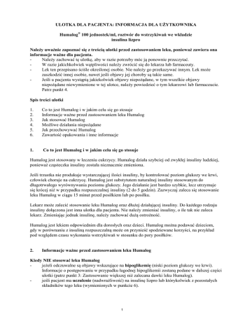 ULOTKA DLA PACJENTA: INFORMACJA DLA UŻYTKOWNIKA Humalog® 100 jednostek/ml, roztwór do wstrzykiwań we wkładzie insulina lizpro Należy uważnie zapoznać się z treścią ulotki przed zastosowaniem leku, ponieważ zawiera ona informacje ważne dla pacjenta. Należy zachować tę ulotkę, aby w razie potrzeby móc ją ponownie przeczytać. W razie jakichkolwiek wątpliwości należy zwrócić się do lekarza lub farmaceuty. Lek ten przepisano ściśle określonej osobie. Nie należy go przekazywać innym. Lek może zaszkodzić innej osobie, nawet jeśli objawy jej choroby są takie same. Jeśli u pacjenta wystąpią jakiekolwiek objawy niepożądane, w tym wszelkie objawy niepożądane niewymienione w tej ulotce, należy powiedzieć o tym lekarzowi lub farmaceucie. Patrz punkt 4. Spis treści ulotki 1. 2. 3. 4. 5. 6. Co to jest Humalog i w jakim celu się go stosuje Informacje ważne przed zastosowaniem leku Humalog Jak stosować Humalog Możliwe działania niepożądane Jak przechowywać Humalog Zawartość opakowania i inne informacje 1. Co to jest Humalog i w jakim celu się go stosuje Humalog jest stosowany w leczeniu cukrzycy. Humalog działa szybciej od zwykłej insuliny ludzkiej, ponieważ cząsteczka insuliny została nieznacznie zmieniona. Jeśli trzustka nie produkuje wystarczającej ilości insuliny, by kontrolować poziom glukozy we krwi, człowiek choruje na cukrzycę. Humalog jest substytutem naturalnej insuliny stosowanym do długotrwałego wyrównywania poziomu glukozy. Jego działanie jest bardzo szybkie, lecz utrzymuje się krócej niż w przypadku rozpuszczalnej insuliny (2 do 5 godzin). Zazwyczaj zaleca się stosowanie leku Humalog w ciągu 15 minut przed posiłkiem lub po posiłku. Lekarz może zalecić stosowanie leku Humalog oraz dłużej działającej insuliny. Do każdego rodzaju insuliny dołączona jest inna ulotka dla pacjenta. Nie należy zmieniać insuliny, o ile tak nie zaleca lekarz. Zmieniając jednak insulinę, należy zachować dużą ostrożność. Humalog jest lekiem odpowiednim dla dorosłych oraz dzieci. Humalog można podawać dzieciom, gdy w porównaniu z insuliną rozpuszczalną może on przynieść spodziewane korzyści, na przykład pod względem czasu wykonania wstrzykiwań w stosunku do pory posiłków. 2. Informacje ważne przed zastosowaniem leku Humalog Kiedy NIE stosować leku Humalog jeżeli odczuwalne są objawy wskazujące na hipoglikemię (niski poziom glukozy we krwi). Informacje o postępowaniu w przypadku łagodnej hipoglikemii zostaną podane w dalszej części ulotki (patrz punkt 3: Zastosowanie większej niż zalecana dawki leku Humalog). jeśli pacjent ma uczulenie (nadwrażliwość) na insulinę lizpro lub którykolwiek z pozostałych składników tego leku (wymienionych w punkcie 6). 1 Ostrzeżenia i środki ostrożności • Jeżeli obecne leczenie zapewnia dobrą kontrolę glikemii, ostrzegawcze objawy nadmiernego spadku poziomu glukozy we krwi mogą nie być odczuwalne. Ostrzegawcze objawy są wymienione w dalszej części ulotki. Należy zaplanować dokładnie pory posiłków, częstość podejmowania aktywności fizycznej i ogólny poziom aktywności. Należy także często kontrolować stężenie glukozy we krwi wykonując badanie poziomu glukozy. • Niektóre osoby, u których po zmianie rodzaju insuliny ze zwierzęcej na ludzką występowała hipoglikemia, zgłaszały że objawy zapowiadające hipoglikemię były słabiej zaznaczone lub zupełnie inne niż wcześniej. Jeżeli hipoglikemia pojawia się często lub występują trudności z rozpoznaniem objawów zapowiadających hipoglikemię, należy skonsultować się z lekarzem. • Należy poinformować lekarza prowadzącego, farmaceutę lub pielęgniarkę z poradni cukrzycowej w razie: ostatnio przebytej choroby; choroby wątroby lub nerek; zwiększonego wysiłku fizycznego. • Zapotrzebowanie na insulinę może także zmieniać się pod wpływem alkoholu. • Należy powiedzieć lekarzowi, farmaceucie lub pielęgniarce z poradni cukrzycowej o planowanym wyjeździe za granicę. Różnica stref czasowych może wiązać się z koniecznością wykonywania wstrzykiwań i spożywania posiłków o innej porze. • U części pacjentów długotrwale leczonych z powodu cukrzycy typu 2., u których występuje choroba serca lub w przeszłości wystąpił udar, zgłaszano przypadki niewydolności serca po jednoczesnym stosowaniu pioglitazonu i insuliny. Należy jak najszybciej poinformować lekarza, jeżeli wystąpią objawy niewydolności serca takie jak zadyszka, nagłe zwiększenie masy ciała lub miejscowy obrzęk. • Jeśli lekarz zalecił lek w fiolce 40 jednostek/ml, nie należy stosować insuliny z wkładu 100 jednostek/ml używając strzykawki 40 jednostek/ml. Humalog a inne leki Zapotrzebowanie organizmu na insulinę może zmienić się pod wpływem • doustnych środków antykoncepcyjnych, • kortykosteroidów, • leczenia substytucyjnego hormonami tarczycy, • doustnych leków obniżających stężenie glukozy we krwi, • kwasu acetylosalicylowego, • sulfonamidów, • oktreotydu, • selektywnych agonistów receptora beta2-adrenergicznego (np. ritodryny, salbutamolu, terbutaliny), • beta-adrenolityków, • niektórych leków przeciwdepresyjnych (inhibitorów monoaminooksydazy lub selektywnych inhibitorów wychwytu zwrotnego serotoniny), • danazolu, • niektórych inhibitorów konwertazy angiotensyny (np. kaptoprylu, enalaprylu) i • antagonistów receptora angiotensyny II. Należy powiedzieć lekarzowi o wszystkich lekach przyjmowanych przez pacjenta obecnie lub ostatnio, również tych, które wydawane są bez recepty (patrz punkt „Ostrzeżenia i środki ostrożności”). Ciąża i karmienie piersią Jeżeli pacjentka jest w ciąży, planuje ciążę lub karmi piersią: zapotrzebowanie organizmu na insulinę zwykle zmniejsza się w pierwszych trzech miesiącach ciąży i wzrasta przez następne 6 miesięcy. U kobiet karmiących piersią mo