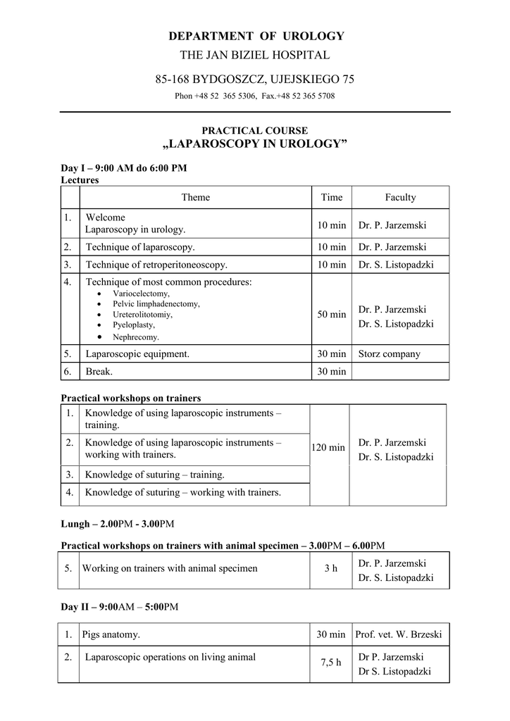 DEPARTMENT OF UROLOGY THE JAN BIZIEL HOSPITAL 85-168 BYDGOSZCZ, UJEJSKIEGO 75 Phon +48 52 365 5306, Fax.+48 52 365 5708 PRACTICAL COURSE „LAPAROSCOPY IN UROLOGY” Day I – 9:00 AM do 6:00 PM Lectures Theme Time Faculty 1. 1 Welcome . Laparoscopy in urology. 10 min Dr. P. Jarzemski 2. Technique of laparoscopy. 10 min Dr. P. Jarzemski 3. Technique of retroperitoneoscopy. 10 min Dr. S. Listopadzki 50 min Dr. P. Jarzemski Dr. S. Listopadzki Storz company 4. 3 Technique of most common procedures: • Variocelectomy, . • • • • Pelvic limphadenectomy, Ureterolitotomiy, Pyeloplasty, Nephrecomy. 5. Laparoscopic equipment. 30 min 6. Break. 30 min Practical workshops on trainers 1. Knowledge of using laparoscopic instruments – training. 2. Knowledge of using laparoscopic instruments – working with trainers. 3. Knowledge of suturing – training. 4. Knowledge of suturing – working with trainers. 120 min Dr. P. Jarzemski Dr. S. Listopadzki Lungh – 2.00PM - 3.00PM Practical workshops on trainers with animal specimen – 3.00PM – 6.00PM 5. Working on trainers with animal specimen 3h Dr. P. Jarzemski Dr. S. Listopadzki Day II – 9:00AM – 5:00PM 1. Pigs anatomy. 2. Laparoscopic operations on living animal 30 min Prof. vet. W. Brzeski 7,5 h Dr P. Jarzemski Dr S. Listopadzki