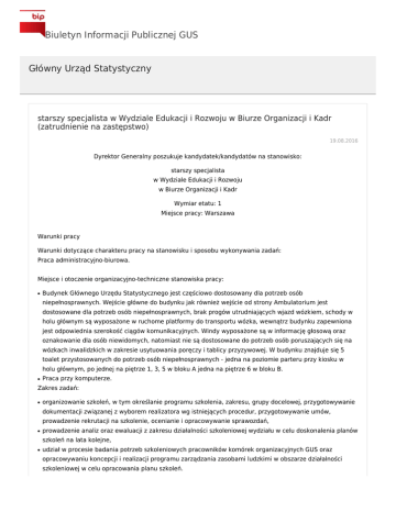 Biuletyn Informacji Publicznej GUS Główny Urząd Statystyczny starszy specjalista w Wydziale Edukacji i Rozwoju w Biurze Organizacji i Kadr (zatrudnienie na zastępstwo) 19.08.2016 Dyrektor Generalny poszukuje kandydatek/kandydatów na stanowisko: starszy specjalista w Wydziale Edukacji i Rozwoju w Biurze Organizacji i Kadr Wymiar etatu: 1 Miejsce pracy: Warszawa Warunki pracy Warunki dotyczące charakteru pracy na stanowisku i sposobu wykonywania zadań: Praca administracyjno-biurowa. Miejsce i otoczenie organizacyjno-techniczne stanowiska pracy: ● Budynek Głównego Urzędu Statystycznego jest częściowo dostosowany dla potrzeb osób niepełnosprawnych. Wejście główne do budynku jak również wejście od strony Ambulatorium jest dostosowane dla potrzeb osób niepełnosprawnych, brak progów utrudniających wjazd wózkiem, schody w holu głównym są wyposażone w ruchome platformy do transportu wózka, wewnątrz budynku zapewniona jest odpowiednia szerokość ciągów komunikacyjnych. Windy wyposażone są w informację głosową oraz oznakowanie dla osób niewidomych, natomiast nie są dostosowane do potrzeb osób poruszających się na wózkach inwalidzkich w zakresie usytuowania poręczy i tablicy przyzywowej. W budynku znajduje się 5 toalet przystosowanych do potrzeb osób niepełnosprawnych - jedna na poziomie parteru przy kiosku w holu głównym, po jednej na piętrze 1, 3, 5 w bloku A jedna na piętrze 6 w bloku B. ● Praca przy komputerze. Zakres zadań: ● organizowanie szkoleń, w tym określanie programu szkolenia, zakresu, grupy docelowej, przygotowywanie dokumentacji związanej z wyborem realizatora wg istniejących procedur, przygotowywanie umów, prowadzenie rekrutacji na szkolenie, ocenianie i opracowywanie sprawozdań, ● prowadzenie analiz oraz ewaluacji z zakresu działalności szkoleniowej wydziału w celu doskonalenia planów szkoleń na lata kolejne, ● udział w procesie badania potrzeb szkoleniowych pracowników komórek organizacyjnych GUS oraz opracowywaniu koncepcji i realizacji programu zarządzania zasobami ludzkimi w obszarze działalności szkoleniowej w celu opracowania planu szkoleń. Wymagania niezbędne: ● wykształcenie wyższe ● co najmniej 1 rok doświadczenia zawodowego, ● wiedza z zakresu zarządzania, organizacji i prowadzenia szkoleń, ewaluacji szkoleń, ● znajomość ustawy o służbie cywilnej oraz aktów wykonawczych w szczególności w zakresie szkoleń, ● znajomość ustawy o statystyce publicznej, ● znajomość ustawy o zamówieniach publicznych, ● umiejętność obsługi komputera (MS Office) ● wykorzystanie wiedzy i doskonalenie zawodowe, ● rzetelność, ● organizacja pracy i orientacja na osiąganie celów, ● komunikacja interpersonalna, ● komunikacja pisemna, ● współpraca, ● kreatywność ● orientacja na klienta/interesanta, ● posiadanie obywatelstwa polskiego, ● korzystanie z pełni praw publicznych, ● nieskazanie prawomocnym wyrokiem za umyślne przestępstwo lub umyślne przestępstwo skarbowe. Wymagania dodatkowe: ● wykształcenie wyższe w zakresie nauk społecznych lub zarządzania, ● co najmniej 1 rok doświadczenia zawodowego w pracy w dziale HR, w szczególności w dziale szkoleniowym. Dokumenty i oświadczenia niezbędne: ● życiorys/CV i list motywacyjny, ● kopie dokumentów potwierdzających spełnienie wymagania niezbędnego w zakresie wykształcenia, ● kopie dokumentów potwierdzających spełnienie wymagania niezbędnego w zakresie doświadczenia zawodowego/stażu pracy ● oświadczenie o posiadaniu obywatelstwa polskiego albo kopia dokumentu potwierdzającego posiadanie polskiego obywatelstwa, ● oświadczenie o wyrażeniu zgody na przetwarzanie danych osobowych do celów naboru, ● oświadczenie o korzystaniu z pełni praw publicznych, ● oświadczenie o nieskazaniu prawomocnym wyrokiem za umyślne przestępstwo lub umyślne przestępstwo skarbowe. Dokumenty i oświadczenia dodatkowe: ● kopia dokumentu potwierdzającego niepełnosprawność - w przypadku kandydatek/kandydatów, zamierzających skorzystać z pierwszeństwa w zatrudnieniu w przypadku, gdy znajdą się w gronie najlepszych kandydatek/kandydatów, ● kopie dokumentów potwierdzających spełnienie wymagania dodatkowego w zakresie wykształcenia, ● kopie dokumentów potwierdzających spełnienie wymagania dodatkowego dotyczącego posiadania co najmniej rocznego doświadczenia zawodowego w pracy w dziale HR, w szczególności w dziale szkoleniowym. TERMINY I MIEJSCE SKŁADANIA DOKUMENTÓW: Dokumenty należy złożyć do: 01-09-2016 r. Decyduje data wpływu oferty do Urzędu. Miejsce składania dokumentów: Główny Urząd Statystyczny Biuro Organizacji i Kadr pok. 234 lub 251 Al. Niepodległości 208 00-925 Warszawa (w godz. 815-1615) koniecznie z dopiskiem: oferta nr 83/BOK/2016 Inne informacje: W miesiącu poprzedzającym datę upublicznienia ogłoszenia wskaźnik zatrudnienia osób niepełnosprawnych w urzędzie, w rozumieniu przepisów o rehabilitacji zawodowej i społecznej oraz zatrudnianiu osób niepełnosprawnych, nie wynosi co najmniej 6%. Zatrudnienie na zastępstwo. Proponowane wynagrodzenie brutto ok. 2 998 zł + dodatek stażowy. Po upływie terminu składania dokumentów w Biuletynie Informacji Publicznej GUS zostanie upowszechniona lista kandydatek/kandydatów, spełniających wymagania formalne określone w ogłoszeniu o naborze. Kandydatki/kandydaci spełniający wymagania formalne o kolejnych etapach naboru zostaną poinformowani telefonicznie lub e-mailem. Informacje o metodach i technikach naboru: Proces naboru składa się z następujących etapów: etap 1: weryfikacja formalna nadesłanych ofert - do drugiego etapu zaproszeni zostaną kandydaci, którzy spełniają wszystkie wymagania formalne, etap 2: pisemny test wiedzy merytorycznej, etap 3: rozmowa kwalifikacyjna. Oferty złożone po terminie oraz oferty rozpatrzone negatywnie zostaną komisyjnie zniszczone po z