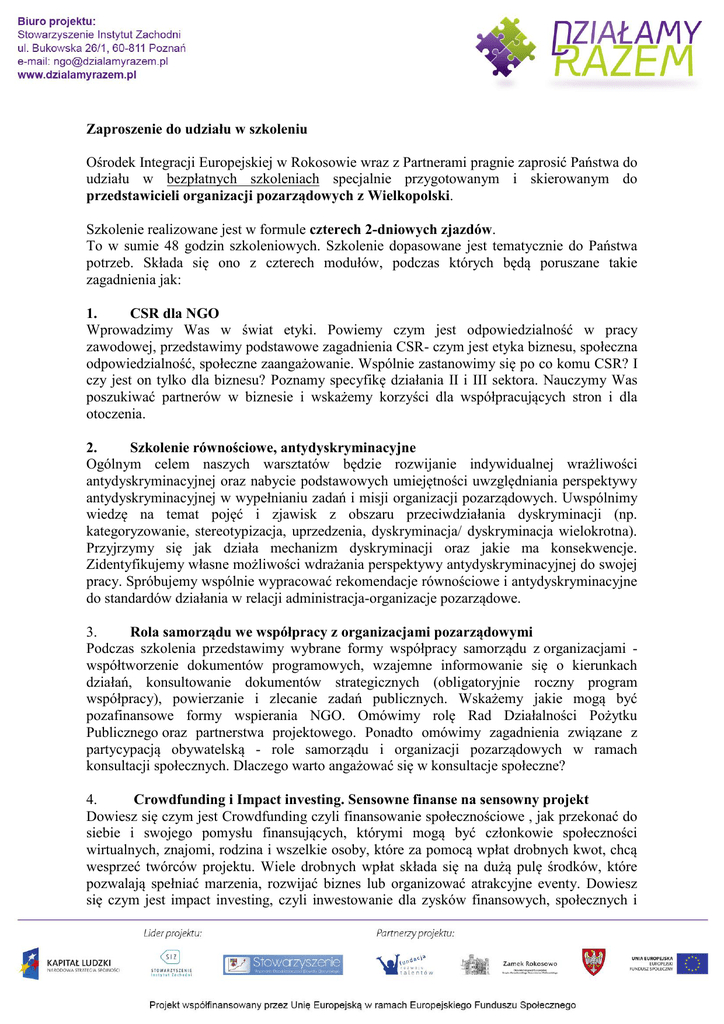 Zaproszenie do udziału w szkoleniu Ośrodek Integracji Europejskiej w Rokosowie wraz z Partnerami pragnie zaprosić Państwa do udziału w bezpłatnych szkoleniach specjalnie przygotowanym i skierowanym do przedstawicieli organizacji pozarządowych z Wielkopolski. Szkolenie realizowane jest w formule czterech 2-dniowych zjazdów. To w sumie 48 godzin szkoleniowych. Szkolenie dopasowane jest tematycznie do Państwa potrzeb. Składa się ono z czterech modułów, podczas których będą poruszane takie zagadnienia jak: 1. CSR dla NGO Wprowadzimy Was w świat etyki. Powiemy czym jest odpowiedzialność w pracy zawodowej, przedstawimy podstawowe zagadnienia CSR- czym jest etyka biznesu, społeczna odpowiedzialność, społeczne zaangażowanie. Wspólnie zastanowimy się po co komu CSR? I czy jest on tylko dla biznesu? Poznamy specyfikę działania II i III sektora. Nauczymy Was poszukiwać partnerów w biznesie i wskażemy korzyści dla współpracujących stron i dla otoczenia. 2. Szkolenie równościowe, antydyskryminacyjne Ogólnym celem naszych warsztatów będzie rozwijanie indywidualnej wrażliwości antydyskryminacyjnej oraz nabycie podstawowych umiejętności uwzględniania perspektywy antydyskryminacyjnej w wypełnianiu zadań i misji organizacji pozarządowych. Uwspólnimy wiedzę na temat pojęć i zjawisk z obszaru przeciwdziałania dyskryminacji (np. kategoryzowanie, stereotypizacja, uprzedzenia, dyskryminacja/ dyskryminacja wielokrotna). Przyjrzymy się jak działa mechanizm dyskryminacji oraz jakie ma konsekwencje. Zidentyfikujemy własne możliwości wdrażania perspektywy antydyskryminacyjnej do swojej pracy. Spróbujemy wspólnie wypracować rekomendacje równościowe i antydyskryminacyjne do standardów działania w relacji administracja-organizacje pozarządowe. 3. Rola samorządu we współpracy z organizacjami pozarządowymi Podczas szkolenia przedstawimy wybrane formy współpracy samorządu z organizacjami współtworzenie dokumentów programowych, wzajemne informowanie się o kierunkach działań, konsultowanie dokumentów strategicznych (obligatoryjnie roczny program współpracy), powierzanie i zlecanie zadań publicznych. Wskażemy jakie mogą być pozafinansowe formy wspierania NGO. Omówimy rolę Rad Działalności Pożytku Publicznego oraz partnerstwa projektowego. Ponadto omówimy zagadnienia związane z partycypacją obywatelską - role samorządu i organizacji pozarządowych w ramach konsultacji społecznych. Dlaczego warto angażować się w konsultacje społeczne? 4. Crowdfunding i Impact investing. Sensowne finanse na sensowny projekt Dowiesz się czym jest Crowdfunding czyli finansowanie społecznościowe , jak przekonać do siebie i swojego pomysłu finansujących, którymi mogą być członkowie społeczności wirtualnych, znajomi, rodzina i wszelkie osoby, które za pomocą wpłat drobnych kwot, chcą wesprzeć twórców projektu. Wiele drobnych wpłat składa się na dużą pulę środków, które pozwalają spełniać marzenia, rozwijać biznes lub organizować atrakcyjne eventy. Dowiesz się czym jest impact investing, czyli inwestowanie dla zysków finansowych, społecznych i innych. Pokażemy Ci jak możesz skorzystać z tych nowych pomysłów; jak opracować Lean canvas własnego projektu [czyli wskazać mocne i słabe strony Twojego projektu, odkryjesz, nad czym jeszcze można popracować, by projekt odniósł sukces. Lean canvas to 9 pól, jedna kartka papieru]. Opowiemy o finansowaniu pomysłów za pomocą środków własnych i pozyskanych - obcych oraz pomożemy Ci przygotować projekt – będzie m. in. o tym jak ważne jest odpowiednie podejście, budowanie zespołu i społeczności, autentyczny marketing. Po ukończeniu szkolenia każdy uczestnik otrzyma zaświadczenie. TERMINY Szkolenia realizowane są w następujących terminach: ZJAZD NR 1 ZJAZD NR 2 ZJAZD NR 3 ZJAZD 4 13-14.02.2015 13-14.03.2015 10-11.04.2015 8-9.05.2015 W celu zapisania się na szkolenie: należy wypełnić formularz zgłoszeniowy i przesłać go do Organizatora drogą pocztową na adres: Rokosowo 1, 63-805 Łęka Mała / lub: mailowo na adres [email protected], lub: faksem 65-573-33-04. Więcej informacji o rekrutacji pod numerem tel.: 65-573-33-08. Wszelkie informacje o szkoleniach dostępne są na stronie www.rokosowo.pl oraz na stronie projektu www.dzialamyrazem.pl Liczba miejsc jest ograniczona. Szkolenie odbędzie się w Zamku w Rokosowie www.rokosowo.pl. Organizator gwarantuje bezpłatnie w ramach szkolenia: nocleg, wyżywienie, materiały szkoleniowe. Zapewniamy transport z Poznania do Rokosowa. Szkolenia będą prowadzone przez: Dawid Sokołowski - Crowdfunding i Impact investing. Sensowne finanse na sensowny projekt Założyciel Sieci Sensownego Biznesu. Pracował w Gildii Aniołów Biznesu oraz funduszu VC ZernikeMeta Ventures gdzie oceniał oraz pracował z projektami startupowymi. Przez jego ręce przeszło ok. 700-800 projektów. Wielokrotnie prowadził warsztaty i prezentacje dotyczące rynku startupów i inwestycji w Polsce oraz ich przygotowania do inwestycji kapitałowych. Ma także na swoim koncie lekcje z dwóch nieudanych własnych projektów co sprawia, że oprócz profesjonalnego doświadczenia inwestorskiego nauczył się wiele na własnej skórze. Jako wielki zwolennik interdyscyplinarności czerpie doświadczenia i umiejętności z wielu źródeł. Jego zainteresowania dotyczą m.in. crowdsourcingu, ekonomii współpracy, przedsiębiorczości społecznej, kreatywności, studiów przyszłości, ale także filozofii wschodu, psychologii czy zdrowego stylu życia. Łukasz Broniszewski - Rola samorządu we współpracy z organizacjami pozarządowymi Absolwent filozofii Uniwersytetu Mikołaja Kopernika, Szkoły Liderów Społeczeństwa Obywatelskiego oraz Szkoły Partycypacji Społecznej. Działacz społeczny – prezes zarządu Fundacji Stabilo, pracuje również w zarządach Kujawsko-Pomorskiej i Ogólnopolskiej Federacji Organizacji Pozarząd