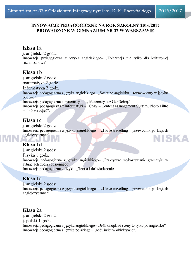 Gimnazjum nr 37 z Oddziałami Integracyjnymi im. K. K. Baczyńskiego 2016/2017 INNOWACJE PEDAGOGICZNE NA ROK SZKOLNY 2016/2017 PROWADZONE W GIMNAZJUM NR 37 W WARSZAWIE Klasa 1a j. angielski 2 godz. Innowacja pedagogiczna z języka angielskiego– „Tolerancja nie tylko dla kulturowej różnorodności” Klasa 1b j. angielski 2 godz. matematyka 2 godz. Informatyka 2 godz. Innowacja pedagogiczna z języka angielskiego– „Świat po angielsku – rozmawiamy w języku obcym.” Innowacja pedagogiczna z matematyki – „ Matematyka z GeoGebrą.” Innowacja pedagogiczna z informatyki – „CMS – Content Management System, Photo Filtre – obróbka zdjęć”. Klasa 1c j. angielski 2 godz. Innowacja pedagogiczna z języka angielskiego–– „I love travelling – przewodnik po krajach anglojęzycznych” Klasa 1d j. angielski 2 godz. Fizyka 1 godz. Innowacja pedagogiczna z języka angielskiego– „Praktyczne wykorzystanie gramatyki w sytuacjach życia codziennego” Innowacja pedagogiczna z fizyki– „Teoria i doświadczenie Klasa 1e j. angielski 2 godz. Innowacja pedagogiczna z języka angielskiego–– „I love travelling – przewodnik po krajach anglojęzycznych” Klasa 2a j. angielski 2 godz. j. polski 1 godz. Innowacja pedagogiczna z języka angielskiego– „Jeśli urządzać sceny to tylko po angielsku” Innowacja pedagogiczna z języka polskiego – „Mój świat w obiektywie”. Gimnazjum nr 37 z Oddziałami Integracyjnymi im. K. K. Baczyńskiego 2016/2017 Klasa 2b j. angielski 2 godz. matematyka 2 godz. Informatyka 2 godz. Innowacja pedagogiczna z języka angielskiego– „Czy naprawdę Ziemia kręci się wokół Słońca ? ” Innowacja pedagogiczna z matematyki – „ Tajniki geometrii.” Innowacja pedagogiczna z informatyki – „Grafika komputerowa, joomla – nowoczesne technologie internetowe”. Klasa 2c j. angielski 2 godz. Chemia 1 godz. Innowacja pedagogiczna z języka angielskiego–– „I love travelling – przewodnik po krajach anglojęzycznych” Innowacja pedagogiczna z chemii – „Ja – częścią świata przyrody.” Klasa 2d j. angielski 2 godz. Innowacja pedagogiczna z języka angielskiego– „Przez kulturę krajów anglojęzycznych” Klasa 3a j. angielski 2 godz. j. hiszpański 2 godz. Innowacja pedagogiczna z języka angielskiego– „Don’t be afraid of speaking in English” – Nie bój się mówić po angielsku. Innowacja pedagogiczna z języka angielskiego – „Polish – English Dictionary” – Tworzymy swój własny słownik polsko-angielski. Innowacja pedagogiczna z języka hiszpańskiego – „Słucham i mówię”. Klasa 3b j. angielski 2 godz. Chemia 1 godz Biologia 1 godz Matematyka 1 godz. Informatyka 1 godz. Innowacja pedagogiczna z języka angielskiego– „Don’t be afraid of speaking in English” – Nie bój się mówić po angielsku. Innowacja pedagogiczna z języka angielskiego – „Polish – English Dictionary” – Tworzymy swój własny słownik polsko-angielski. Innowacja pedagogiczna z chemii – „Od eksperymentu do medykamentu”. Innowacja pedagogiczna z biologii – „Myślenie przez doświadczenie”. Innowacja pedagogiczna z matematyki i informatyki – Tyle jest w każdym poznaniu nauki, ile jest w nim matematyki”. Gimnazjum nr 37 z Oddziałami Integracyjnymi im. K. K. Baczyńskiego 2016/2017 Klasa 3c j. angielski 2 godz. Innowacja pedagogiczna z języka angielskiego – „Travelling across English speaking countries” – Podróż przez kraje anglojęzyczne. Innowacja pedagogiczna z języka angielskiego – „English conversations, skatches and plays” – Angielskie konwersacje, skecze i sztuki. Klasa 3d j. angielski 1 godz. Innowacja pedagogiczna z języka angielskiego – „Travelling across English speaking countries” – Podróż przez kraje anglojęzyczne.