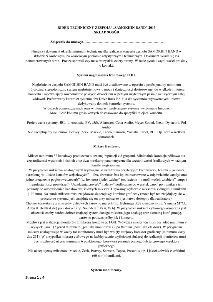 RIDER TECHNICZNY ZESPOŁU „SAMOKHIN BAND” 2013 SKŁAD 9OSÓB Załącznik do umowy:…………………………………………………………. Niniejszy dokument określa minimum techniczne dla realizacji koncertu zespołu SAMOKHIN BAND w składzie 9 osobowym, na właściwym poziomie artystycznym i technicznym. Dokument składa się z 4 ponumerowanych stron. Proszę sprawdź czy masz wszystkie cztery strony. W razie pytań i wątpliwości prosimy o kontakt. System nagłośnienia frontowego FOH. Nagłośnienie zespołu SAMOKHIN BAND musi być zrealizowane w oparciu o profesjonalny minimum trójdrożny, stereofoniczny system nagłośnieniowy o mocy i skuteczności dostosowanej do wielkości miejsca koncertu i zapewniający równomierne pokrycie dźwiękiem w pełnym użytecznym paśmie akustycznym całej widowni. Preferowany kontroler systemu dbx Drive Rack PA +, a dla systemów wyrównanych liniowo dedykowany do nich kontroler systemu. W dużych pomieszczeniach oraz w plenerach preferujemy systemy wyrównane liniowo. Moc i ilość kolumn głośnikowych dostosowana do specyfiki miejsca koncertu. Preferowane systemy: JBL, L’Acoustic, EV, d&b, Adamson, Coda Audio, Meyer Sound, Nexo, Dynacord, Pol Audio. Nie akceptujemy systemów: Peavey, Zeck, Mackie, Tapco, Samson, Yamaha, Proel, RCF i tp. oraz wszelkich samoróbek. Mikser frontowy. Mikser minimum 32 kanałowy producenta o uznanej reputacji z 8 grupami. Minimalnie korekcja półkowa dla częstotliwości wysokich i niskich oraz dwa korektory parametryczne dla częstotliwości środkowych w każdym kanale wejściowym. W przypadku mikserów analogowych wymagane są urządzenia peryferyjne: kompresory, bramki – (w ilości określonej w „liście kanałów wejściowych” – dbx, drawmer, bss itp. zainsertowane w odpowiednie kanały) oraz jedno urządzenie pogłosowe „reverb” (tc, lexicon) i jeden „delay” (tc, lexicon – z możliwością „nabicia” tempa i regulacją ilości powtórzeń). Urządzenia „reverb” i „delay” podłączone do wysyłek „aux” po tłumiku a ich powroty do odpowiednich kanałów wejściowych miksera. Używamy wyłącznie mikserów z długimi tłumikami (100 mm). Na sumie miksera musi znajdować się tercjowy korektor graficzny (może być ten znajdujący się w procesorze systemu jeśli znajduje się on przy mikserze i jest łatwo dostępny dla realizatora). Chętnie korzystamy z mikserów cyfrowych zarówno małych (np. Behringer X32), średnich (np. Yamaha M7CL, Allen & Heath iLife) jak i dużych (np. Soundcraft Vi 4, Vi 6). W przypadku miksera cyfrowego konieczna jest obecność osoby bardzo dobrze znającej system danego miksera, jego obsługę oraz aktualną konfigurację, zarówno podczas próby jak i koncertu. Możliwa jest realizacja monitorów z miksera frontowego FOH. Wówczas mikser ten musi posiadać minimum 9 wysyłek „aux” (7 przed tłumikiem „pre” dla monitorów i 2 po tłumiku „post” dla efektów). W przypadku miksera analogowego w każdy tor monitorowy musi być wpięty tercjowy korektor graficzny (minimum klasy dbx 231). W przypadku miksera cyfrowego na każdej szynie wyjściowej służącej do realizacji monitorów musi być możliwość użycia minimum 6 punktowego korektora parametrycznego lub tercjowego korektora graficznego. Nie akceptujemy mikserów: Mackie, Zeck, Peavey, Samson, Tapco, Presonus i tp. i jakichkolwiek z krótkimi (60 mm) tłumikami. System monitorowy. Strona 1 z 4 Jak wspomniano powyżej istnieje możliwość realizacji monitorów z miksera frontowego. W takim przypadku mikser frontowy musi posiadać minimum 9 wysyłek „aux” (7 przed tłumikiem „pre” dla monitorów i 2 po tłumiku „post” dla efektów). Jednakże w dużych salach i na plenerach preferujemy użycie osobnego miksera monitorowego o podobnych parametrach jak frontowy. Ilość torów monitorowych: 7 (ustawione jak na „planie sceny”, przy każdym muzyku z wyjątkiem perkusisty, który ma własny mikser i słuchawki. W torze głównego wokalu dwa monitory. W torze sekcji dętej 3 monitory. Monitory typu „wedge”, minimum 250 W każdy, dwudrożne. Nie akceptujemy plastikowych monitorów typu „eon”, „mackie”, „rcf”, i tp., gdzie horn jest częścią odlewu plastikowej obudowy. Potrzebujemy typowe „wedge” (12”+1” lub 12”+2” lub 15”+1” lub 15”+2”). W każdym torze monitorowym tercjowy korektor graficzny klasy minimum dbx 231. Na dużych scenach i w plenerze mile widziane odsłuchy boczne. Zespół nie posiada realizatora monitorów. Lista kanałów wejściowych. Kanał 1 2 3 4 5 6 7 8 9 10 11 12 13 Żródło Stopa Stopa Werbel góra Werbel dół Hi Hat Tom 1 Tom 2 Tom 3 OH L OH R Bas Gitara elektryczna Gitara akustyczna Przetwornik/wyjście Shure Beta 52, AKG D 112 Subkick Shure SM 57 Shure SM 57 pojemnościowy Sennheiser e 604/904 Sennheiser e 604/904 Sennheiser e 604/904 pojemnościowy pojemnościowy XLR Shure SM 57 Shure SM 57 lub XLR 48 V nie nie nie nie tak nie nie nie tak tak nie nie nie 14 15 16 17 18 19 20 21 22 23 24 25 26 27 Akordeon Klawisze L Klawisze R Przeszkadzajki Przeszkadzajki Puzon Saksofon Trąbka Wokal sekcja dęta Wokal sekcja dęta Wokal Bas Wokal Klawisze Wokal Gitara Wokal Przeszkadzajki Wokal Główny Trąbka Powrót efekt 1 Powrót efekt 2 Zapas XLR Dibox aktywny Dibox aktywny Shure SM 57 Shure SM 57 XLR XLR XLR Shure Beta 58 A/SM 58 Shure Beta 58 A/SM 58 Shure Beta 58 A/SM 58 Shure Beta 58 A/SM 58 Shure Beta 58 A/SM 58 Shure Beta 58 A/SM 58 tak tak tak nie nie tak tak tak nie nie nie nie nie nie Shure Beta 58 A/SM 58 XLR Reverb Delay Shure Beta 58/SM 58 bezprzewodowy nie nie nie nie nie 28 29 30 31 32 Insert bramka bramka bramka bramka bramka bramka bramka kompresor kompresor kompresor kompresor kompresor kompresor kompresor Statyw/mocowanie Niski Wewnątrz bębna Niski łamany Niski łamany Wysoki łamany Uchwyt na obręcz Uchwyt na obręcz Uchwyt na obręcz Wysoki łamany Wysoki łamany nie Niski 