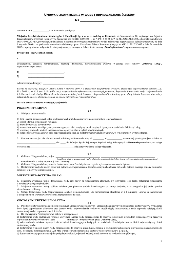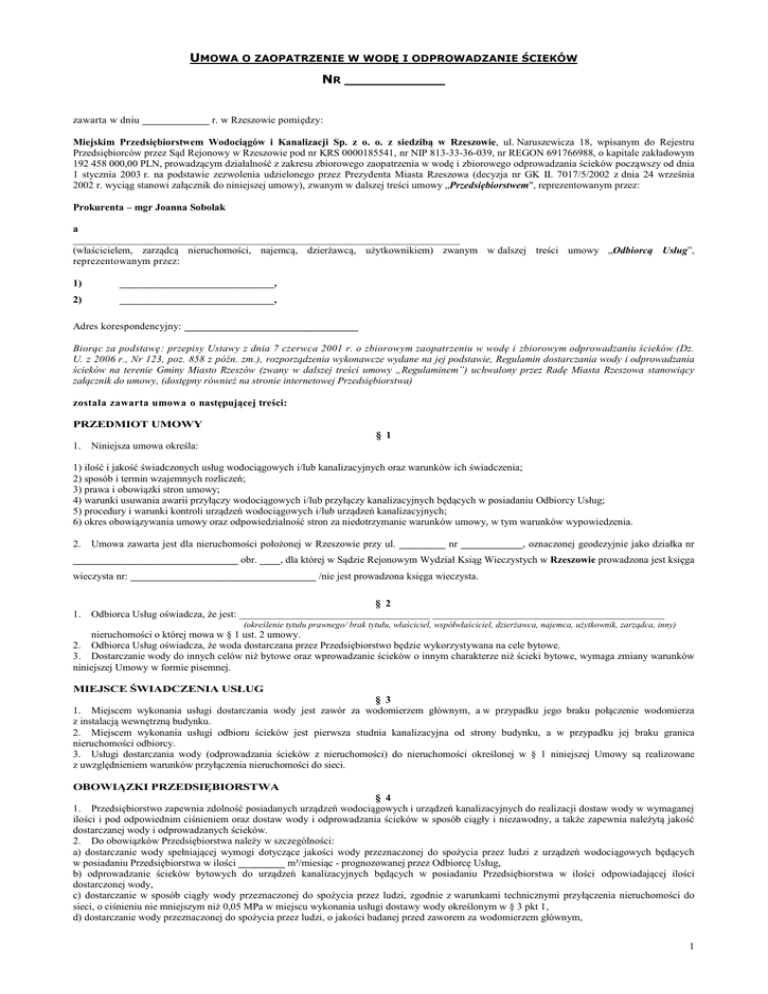 UMOWA O ZAOPATRZENIE W WODĘ I ODPROWADZANIE ŚCIEKÓW NR ___________ zawarta w dniu _____________ r. w Rzeszowie pomiędzy: Miejskim Przedsiębiorstwem Wodociągów i Kanalizacji Sp. z o. o. z siedzibą w Rzeszowie, ul. Naruszewicza 18, wpisanym do Rejestru Przedsiębiorców przez Sąd Rejonowy w Rzeszowie pod nr KRS 0000185541, nr NIP 813-33-36-039, nr REGON 691766988, o kapitale zakładowym 192 458 000,00 PLN, prowadzącym działalność z zakresu zbiorowego zaopatrzenia w wodę i zbiorowego odprowadzania ścieków począwszy od dnia 1 stycznia 2003 r. na podstawie zezwolenia udzielonego przez Prezydenta Miasta Rzeszowa (decyzja nr GK II. 7017/5/2002 z dnia 24 września 2002 r. wyciąg stanowi załącznik do niniejszej umowy), zwanym w dalszej treści umowy „Przedsiębiorstwem", reprezentowanym przez: Prokurenta – mgr Joanna Sobolak a ___________________________________________________________________________ (właścicielem, zarządcą nieruchomości, najemcą, dzierżawcą, użytkownikiem) zwanym w dalszej treści umowy „Odbiorcą Usług”, reprezentowanym przez: 1) ______________________________, 2) ______________________________, Adres korespondencyjny: _________________________________ Biorąc za podstawę: przepisy Ustawy z dnia 7 czerwca 2001 r. o zbiorowym zaopatrzeniu w wodę i zbiorowym odprowadzaniu ścieków (Dz. U. z 2006 r., Nr 123, poz. 858 z późn. zm.), rozporządzenia wykonawcze wydane na jej podstawie, Regulamin dostarczania wody i odprowadzania ścieków na terenie Gminy Miasto Rzeszów (zwany w dalszej treści umowy „Regulaminem”) uchwalony przez Radę Miasta Rzeszowa stanowiący załącznik do umowy, (dostępny również na stronie internetowej Przedsiębiorstwa) została zawarta umowa o następującej treści: PRZEDMIOT UMOWY § 1 1. Niniejsza umowa określa: 1) ilość i jakość świadczonych usług wodociągowych i/lub kanalizacyjnych oraz warunków ich świadczenia; 2) sposób i termin wzajemnych rozliczeń; 3) prawa i obowiązki stron umowy; 4) warunki usuwania awarii przyłączy wodociągowych i/lub przyłączy kanalizacyjnych będących w posiadaniu Odbiorcy Usług; 5) procedury i warunki kontroli urządzeń wodociągowych i/lub urządzeń kanalizacyjnych; 6) okres obowiązywania umowy oraz odpowiedzialność stron za niedotrzymanie warunków umowy, w tym warunków wypowiedzenia. 2. Umowa zawarta jest dla nieruchomości położonej w Rzeszowie przy ul. _________ nr ____________, oznaczonej geodezyjnie jako działka nr ________________________________ obr. ____, dla której w Sądzie Rejonowym Wydział Ksiąg Wieczystych w Rzeszowie prowadzona jest księga wieczysta nr: ____________________________________ /nie jest prowadzona księga wieczysta. 1. § 2 Odbiorca Usług oświadcza, że jest: _____________________________________ _____________________________________________ (określenie tytułu prawnego/ brak tytułu, właściciel, współwłaściciel, dzierżawca, najemca, użytkownik, zarządca, inny) nieruchomości o której mowa w § 1 ust. 2 umowy. 2. Odbiorca Usług oświadcza, że woda dostarczana przez Przedsiębiorstwo będzie wykorzystywana na cele bytowe. 3. Dostarczanie wody do innych celów niż bytowe oraz wprowadzanie ścieków o innym charakterze niż ścieki bytowe, wymaga zmiany warunków niniejszej Umowy w formie pisemnej. MIEJSCE ŚWIADCZENIA USŁUG § 3 1. Miejscem wykonania usługi dostarczania wody jest zawór za wodomierzem głównym, a w przypadku jego braku połączenie wodomierza z instalacją wewnętrzną budynku. 2. Miejscem wykonania usługi odbioru ścieków jest pierwsza studnia kanalizacyjna od strony budynku, a w przypadku jej braku granica nieruchomości odbiorcy. 3. Usługi dostarczania wody (odprowadzania ścieków z nieruchomości) do nieruchomości określonej w § 1 niniejszej Umowy są realizowane z uwzględnieniem warunków przyłączenia nieruchomości do sieci. OBOWIĄZKI PRZEDSIĘBIORSTWA § 4 1. Przedsiębiorstwo zapewnia zdolność posiadanych urządzeń wodociągowych i urządzeń kanalizacyjnych do realizacji dostaw wody w wymaganej ilości i pod odpowiednim ciśnieniem oraz dostaw wody i odprowadzania ścieków w sposób ciągły i niezawodny, a także zapewnia należytą jakość dostarczanej wody i odprowadzanych ścieków. 2. Do obowiązków Przedsiębiorstwa należy w szczególności: a) dostarczanie wody spełniającej wymogi dotyczące jakości wody przeznaczonej do spożycia przez ludzi z urządzeń wodociągowych będących w posiadaniu Przedsiębiorstwa w ilości _________ m³/miesiąc - prognozowanej przez Odbiorcę Usług, b) odprowadzanie ścieków bytowych do urządzeń kanalizacyjnych będących w posiadaniu Przedsiębiorstwa w ilości odpowiadającej ilości dostarczonej wody, c) dostarczanie w sposób ciągły wody przeznaczonej do spożycia przez ludzi, zgodnie z warunkami technicznymi przyłączenia nieruchomości do sieci, o ciśnieniu nie mniejszym niż 0,05 MPa w miejscu wykonania usługi dostawy wody określonym w § 3 pkt 1, d) dostarczanie wody przeznaczonej do spożycia przez ludzi, o jakości badanej przed zaworem za wodomierzem głównym, 1 e) odbieranie w sposób ciągły ścieków bytowych z nieruchomości w stanie i składzie zgodnym z aktualnie obowiązującymi przepisami, f) usuwanie awarii urządzeń wodociągowych i urządzeń kanalizacyjnych będących w jego posiadaniu, g) zainstalowanie i utrzymanie wodomierza głównego, h) utrzymanie i eksploatacja urządzeń wodociągowych i urządzeń kanalizacyjnych będących w jego posiadaniu, i) zapewnienie możliwości usunięcia awarii przyłączy posiadanych przez Odbiorcę Usług, na jego koszt, j) odpłatne usuwanie awarii przyłączy Odbiorcy Usług, w przypadku powierzenia wykonania takiej usługi Przedsiębiorstwu, k) usuwanie awarii na przyłączach będących w posiadaniu Przedsiębiorstwa, tj. w części przyłączy znajdujących się poza granicą nieruchomości Odbiorcy Usług. OBOWIĄZKI ODBIORCY USŁUG 