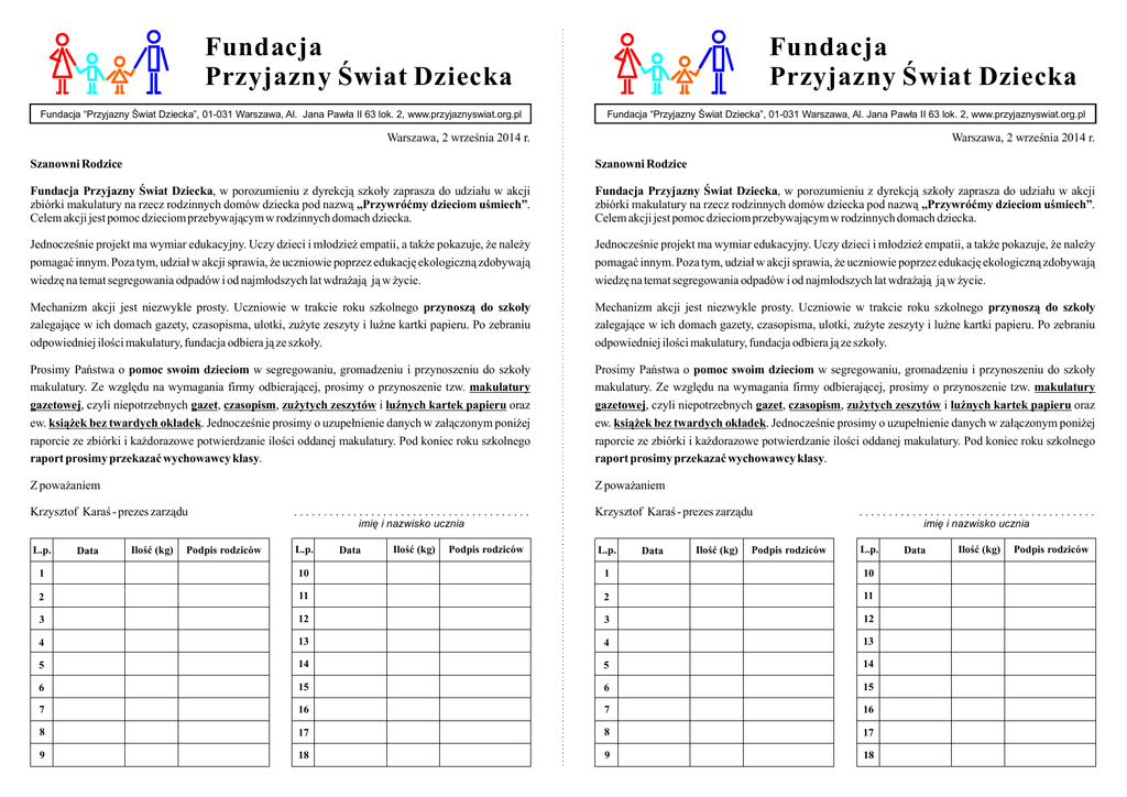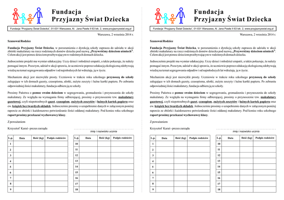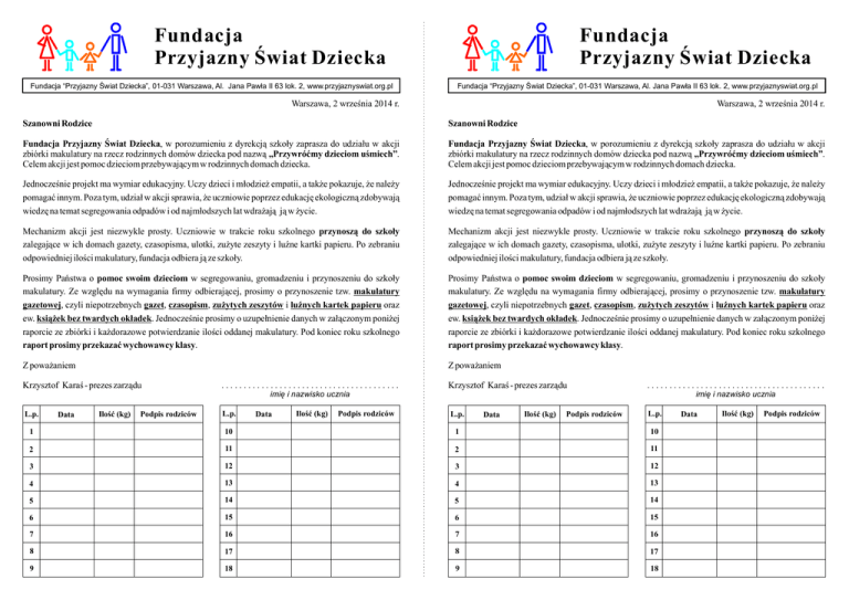 Fundacja Przyjazny Świat Dziecka Fundacja “Przyjazny Świat Dziecka”, 01-031 Warszawa, Al. Jana Pawła II 63 lok. 2, www.przyjaznyswiat.org.pl Fundacja Przyjazny Świat Dziecka Fundacja “Przyjazny Świat Dziecka”, 01-031 Warszawa, Al. Jana Pawła II 63 lok. 2, www.przyjaznyswiat.org.pl Warszawa, 2 września 2014 r. Warszawa, 2 września 2014 r. Szanowni Rodzice Szanowni Rodzice Fundacja Przyjazny Świat Dziecka, w porozumieniu z dyrekcją szkoły zaprasza do udziału w akcji zbiórki makulatury na rzecz rodzinnych domów dziecka pod nazwą „Przywróćmy dzieciom uśmiech”. Celem akcji jest pomoc dzieciom przebywającym w rodzinnych domach dziecka. Fundacja Przyjazny Świat Dziecka, w porozumieniu z dyrekcją szkoły zaprasza do udziału w akcji zbiórki makulatury na rzecz rodzinnych domów dziecka pod nazwą „Przywróćmy dzieciom uśmiech”. Celem akcji jest pomoc dzieciom przebywającym w rodzinnych domach dziecka. Jednocześnie projekt ma wymiar edukacyjny. Uczy dzieci i młodzież empatii, a także pokazuje, że należy pomagać innym. Poza tym, udział w akcji sprawia, że uczniowie poprzez edukację ekologiczną zdobywają wiedzę na temat segregowania odpadów i od najmłodszych lat wdrażają ją w życie. Jednocześnie projekt ma wymiar edukacyjny. Uczy dzieci i młodzież empatii, a także pokazuje, że należy pomagać innym. Poza tym, udział w akcji sprawia, że uczniowie poprzez edukację ekologiczną zdobywają wiedzę na temat segregowania odpadów i od najmłodszych lat wdrażają ją w życie. Mechanizm akcji jest niezwykle prosty. Uczniowie w trakcie roku szkolnego przynoszą do szkoły zalegające w ich domach gazety, czasopisma, ulotki, zużyte zeszyty i luźne kartki papieru. Po zebraniu odpowiedniej ilości makulatury, fundacja odbiera ją ze szkoły. Mechanizm akcji jest niezwykle prosty. Uczniowie w trakcie roku szkolnego przynoszą do szkoły zalegające w ich domach gazety, czasopisma, ulotki, zużyte zeszyty i luźne kartki papieru. Po zebraniu odpowiedniej ilości makulatury, fundacja odbiera ją ze szkoły. Prosimy Państwa o pomoc swoim dzieciom w segregowaniu, gromadzeniu i przynoszeniu do szkoły makulatury. Ze względu na wymagania firmy odbierającej, prosimy o przynoszenie tzw. makulatury gazetowej, czyli niepotrzebnych gazet, czasopism, zużytych zeszytów i luźnych kartek papieru oraz ew. książek bez twardych okładek. Jednocześnie prosimy o uzupełnienie danych w załączonym poniżej raporcie ze zbiórki i każdorazowe potwierdzanie ilości oddanej makulatury. Pod koniec roku szkolnego raport prosimy przekazać wychowawcy klasy. Prosimy Państwa o pomoc swoim dzieciom w segregowaniu, gromadzeniu i przynoszeniu do szkoły makulatury. Ze względu na wymagania firmy odbierającej, prosimy o przynoszenie tzw. makulatury gazetowej, czyli niepotrzebnych gazet, czasopism, zużytych zeszytów i luźnych kartek papieru oraz ew. książek bez twardych okładek. Jednocześnie prosimy o uzupełnienie danych w załączonym poniżej raporcie ze zbiórki i każdorazowe potwierdzanie ilości oddanej makulatury. Pod koniec roku szkolnego raport prosimy przekazać wychowawcy klasy. Z poważaniem Z poważaniem Krzysztof Karaś - prezes zarządu ........................................ imię i nazwisko ucznia Krzysztof Karaś - prezes zarządu ........................................ imię i nazwisko ucznia L.p. L.p. L.p. L.p. Data Ilość (kg) Podpis rodziców Data Ilość (kg) Podpis rodziców Data Ilość (kg) Podpis rodziców 1 10 1 10 2 11 2 11 3 12 3 12 4 13 4 13 5 14 5 14 6 15 6 15 7 16 7 16 8 17 8 17 9 18 9 18 Data Ilość (kg) Podpis rodziców