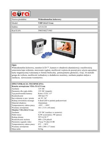 Nazwa produktu: Wideodomofon kolorowy Model: VDP-24A3 Uran Indeks: A31A124 Kod EAN: 5905548271903 Opis: Wideodomofon kolorowy, monitor LCD 7", kamera w obudowie aluminiowej z możliwością ustawienia kąta widzenia, sterowanie ryglem, możliwość wejścia do posesji przy użyciu specjalnej karty magnetycznej wykonanej w formie breloczka, potencjometry głośności, wizji, 16 melodii gongu do wyboru, możliwość rozbudowy o dodatkowe monitory, zasilanie prądem stałym z zasilacza, nowoczesne wzornictwo. SPECYFIKACJA TECHNICZNA Kaseta zewnętrzna VDA-31A3 Uran Zasilanie Parametry dla rygla elektr. Typ przetwornika kamery Rozdzielczość Kąt widzenia w poz./ pionie Rodzaj oświetlenia nocnego Materiał obudowy Temperaturowy zakres pracy Wymiary zewnętrzne Monitor VDA-04A3 Uran Zasilanie Pobór mocy Rodzaj ekranu Rozdzielczość moitora Parametry sygnału video Temperaturowy zakres pracy Wymiary zewnętrzne Masa netto 12V DC 12V DC (impuls) Kolor, CCD, 1/3" 380 linii TV ok.76º /36º 6 diod LED w paśmie podczerwieni Aluminium -18ºC…+50ºC 161 x 115 x 64 (mm) 12V DC (zasilacz w zestawie) 0,2W (czuwanie), 5W (praca) TFT-LCD 7” 480 x 234 pikseli 1Vp-p 75 ohm CCIR 0°C…+30°C 160 x 240 x 17 (mm) 0,8 kg