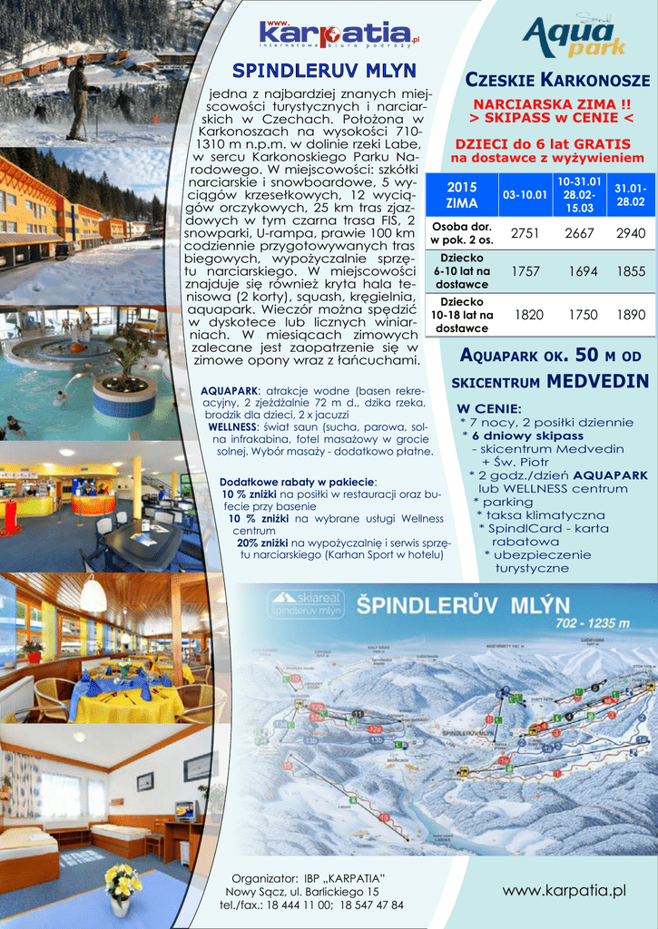 SPINDLERUV MLYN CZESKIE Karkonosze jedna z najbardziej znanych miejNARCIARSKA ZIMA !! scowości turystycznych i narciar> SKIPASS w CENIE < skich w Czechach. Położona w Karkonoszach na wysokości 7101310 m n.p.m. w dolinie rzeki Labe, DZIECI do 6 lat GRATIS w sercu Karkonoskiego Parku Nana dostawce z wyżywieniem rodowego. W miejscowości: szkółki 10-31.01 narciarskie i snowboardowe, 5 wy2015 31.0103-10.01 28.02ciągów krzesełkowych, 12 wycią28.02 ZIMA 15.03 gów orczykowych, 25 km tras zjazdowych w tym czarna trasa FIS, 2 Osoba dor. snowparki, U-rampa, prawie 100 km 2751 2667 2940 w pok. 2 os. codziennie przygotowywanych tras Dziecko biegowych, wypożyczalnie sprzętu narciarskiego. W miejscowości 6-10 lat na 1757 1694 1855 znajduje się również kryta hala tedostawce nisowa (2 korty), squash, kręgielnia, Dziecko aquapark. Wieczór można spędzić 10-18 lat na 1820 1750 1890 w dyskotece lub licznych winiardostawce niach. W miesiącach zimowych zalecane jest zaopatrzenie się w Aquapark ok. 50 m od zimowe opony wraz z łańcuchami. AQUAPARK: atrakcje wodne (basen rekreacyjny, 2 zjeżdżalnie 72 m d., dzika rzeka, brodzik dla dzieci, 2 x jacuzzi WELLNESS: świat saun (sucha, parowa, solna infrakabina, fotel masażowy w grocie solnej. Wybór masaży - dodatkowo płatne. skicentrum MEDVEDIN W CENIE: * 7 nocy, 2 posiłki dziennie * 6 dniowy skipass - skicentrum Medvedin + Św. Piotr * 2 godz./dzień AQUAPARK Dodatkowe rabaty w pakiecie: lub WELLNESS centrum 10 % zniżki na posiłki w restauracji oraz bu* parking fecie przy basenie * taksa klimatyczna 10 % zniżki na wybrane usługi Wellness * SpindlCard - karta centrum rabatowa 20% zniżki na wypożyczalnię i serwis sprzętu narciarskiego (Karhan Sport w hotelu) * ubezpieczenie turystyczne Organizator: Organizator: IBP „KARPATIA” ul. Barlickiego 15 www.karpatia.pl Nowy Sącz, ul. Barlickiego 15IBP „KARPATIA” Nowy Sącz, tel./fax.: (018) 444 11 00; 547 47 84 tel./fax.: 18 444 11 00; 18 547 47 84 www.karpatia.pl