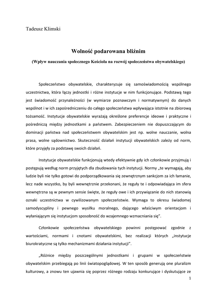 Tadeusz Klimski Wolność podarowana bliźnim (Wpływ nauczania społecznego Kościoła na rozwój społeczeństwa obywatelskiego) Społeczeostwo obywatelskie, charakteryzuje się samoświadomością wspólnego uczestnictwa, która łączy jednostki i różne instytucje w nim funkcjonujące. Podstawą tego jest świadomośd przynależności (w wymiarze poznawczym i normatywnym) do danych wspólnot i w ich zapośredniczeniu do całego społeczeostwa wpływająca istotnie na zbiorową tożsamośd. Instytucje obywatelskie wyrażają określone preferencje ideowe i praktyczne i pośredniczą między jednostkami a paostwem. Zabezpieczeniem nie dopuszczającym do dominacji paostwa nad społeczeostwem obywatelskim jest np. wolne nauczanie, wolna prasa, wolne sądownictwo. Skutecznośd działao instytucji obywatelskich zależy od norm, które przyjęły za podstawę swoich działao. Instytucje obywatelskie funkcjonują wtedy efektywnie gdy ich członkowie przyjmują i postępują według norm przyjętych dla zbudowania tych instytucji. Normy „te wymagają, aby ludzie byli nie tylko gotowi do podporządkowania się zewnętrznym sankcjom za ich łamanie, lecz nade wszystko, by byli wewnętrznie przekonani, że reguły te i odpowiadająca im sfera wewnętrzna są w pewnym sensie święte, że reguły owe i ich przywiązanie do nich stanowią oznaki uczestnictwa w cywilizowanym społeczeostwie. Wymaga to okresu świadomej samodyscypliny i pewnego wysiłku moralnego, dającego właściwym orientacjom i wyłaniającym się instytucjom sposobnośd do wzajemnego wzmacniania się”. Członkowie społeczeostwa obywatelskiego powinni postępowad zgodnie z wartościami, normami i cnotami obywatelskimi, bez realizacji których „instytucje biurokratyczne są tylko mechanizmami działania instytucji”. „Różnice między poszczególnymi jednostkami i grupami w społeczeostwie obywatelskim przebiegają po linii światopoglądowej. W ten sposób generują one pluralizm kulturowy, a znowu ten ujawnia się poprzez różnego rodzaju konkurujące i dyskutujące ze 1 sobą instytucje. W tym świetle społeczeostwo obywatelskie stanowi przeciwwagę dla pluralizmu i rodzących się w nim sprzeczności, utrzymuje w ryzach skonfliktowane jednostki zdążające do sprzecznych celów”. Należy podkreślid, że niezbędnym fundamentem dla powstania i trwania społeczeostwa obywatelskiego jest urzeczywistnianie wartości podstawowych, czyli odnalezienie „wspólnych przekonao moralnych, gwarantujących poczucie wspólnoty i integrację społeczną”. Kapitał społeczny to zasoby, które ucieleśniają się w relacjach i strukturze społecznej, a u podstaw tych relacji znajduje się zaufanie, z jakim odnoszą się względem siebie członkowie danej wspólnoty. Kapitał społeczny prowadzi do rozwoju społeczeostwa. W wyniku funkcjonowania kapitału społecznego następuje zwiększenie zdolności działania jednostek, ułatwienie realizowania wspólnych celów i podniesienie poziomu jakości życia. Konstytucja Dogmatyczna o Kościele ukazuje, że włączenie w Lud Boży jest skutkiem przyjęcia sakramentu chrztu świętego i jednocześnie wprowadza ochrzczonego w zbawczą misję Chrystusa. Każdy członek Ludu Bożego jest zobowiązany do realizowania w swoim życiu misji prorockiej, kapłaoskiej i królewskiej Chrystusa (KK 31). Natura Kościoła wyraża się w tym, że jest to lud prorocki, królewski i kapłaoski, który pielgrzymując niesie światu nadzieję zbawienia. Natomiast rzeczywistością łączącą i gromadzącą Lud Boży jest sakrament Eucharystii. Uczestniczenie w nim, według teologii katolickiej, buduje jedno Ciało Chrystusa – Kościół. Uczestniczenie w Ludzie Bożym wyraża się w postawie uobecniania Chrystusa w świecie poprzez służbę Bogu i bliźniemu (misja kapłaoska), głoszenie Ewangelii i wspieranie kapłanów w posłudze kaznodziejskiej (misja prorocka) czy wreszcie ewangeliczną i sprawiedliwą aktywnośd społeczną, polityczną i gospodarczą. Katolicyzm zobowiązuje wiernych do działalności w życiu doczesnym, we wszystkich jego płaszczyznach: politycznej, ekonomicznej, zawodowej, kulturalnej oraz naukowej. Katolicka nauka społeczna stoi na stanowisku, że relacje między jednostką a społeczeostwem wynikają z natury człowieka. Jej własnością jest „zwrócenie się” ku innym i ku społeczności zarówno w wymiarze cielesno2 materialnym, duchowo-kulturowym i moralnym. Należy pamiętad, że w społeczności następuje dopełnienie osobowości człowieka, jej rozszerzenie i wzbogacenie. Ów rozwój następuje poprzez czynności społeczne, które wytwarzają dobro społeczne. Ono zaś zawiera w sobie dobro wszystkich członków. Inaczej mówiąc, budowanie dobra społecznego zapewnia rozwój i tworzenie dobra jednostkowego. Kościół proponuje wprowadzenie w życie społeczne zasady, która pozwoli na generowanie i troskę o dobro wspólne. Jest nią zasada solidarności, która wyraża się w uporządkowanej zgodzie w dążeniu do wspólnego dobra. Dotyczy ona zachowao jednostkowych i grupowych, zaś rozumienie dobra wspólnego obejmuje zarówno potrzeby duchowe, materialne, ale także doczesne i nadprzyrodzone. Należy zaznaczyd, że urzeczywistnianie zasady solidarności wymaga: istnienia dobra wspólnego (każda społecznośd ma dobro wspólne), poznania dobra wspólnego przez wszystkich członków społeczności, zgodności wszystkich w dążeniu do wspólnego dobra i wreszcie zgody na wspólny porządek w tym dążeniu. Zasada solidarności dodatkowo wyraża opinię, że członkowie danego społeczeostwa konstytuują społeczny byt i pozostają w służbie całości. Jednakże katolicka nauka społeczna jest daleka od całkowitego podporządkowanie członków społeczeostwa dobru wspólnemu. Podporządkowanie osoby dobru wspólnemu danej grupy obejmuje tylko te wymiary, w obrębie których jednostka przynależy do danej wspólnoty. Przed niesłuszną ing