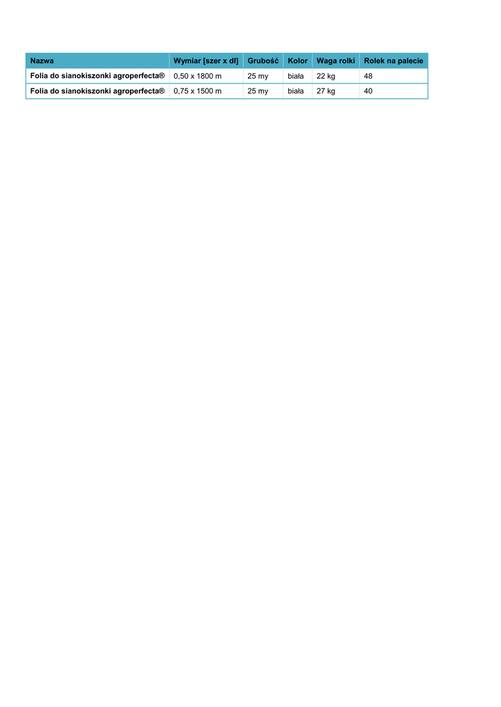 Nazwa Wymiar [szer x dł] Grubość Kolor Waga rolki Rolek na palecie Folia do sianokiszonki agroperfecta® 0,50 x 1800 m 25 my biała 22 kg 48 Folia do sianokiszonki agroperfecta® 0,75 x 1500 m 25 my biała 27 kg 40