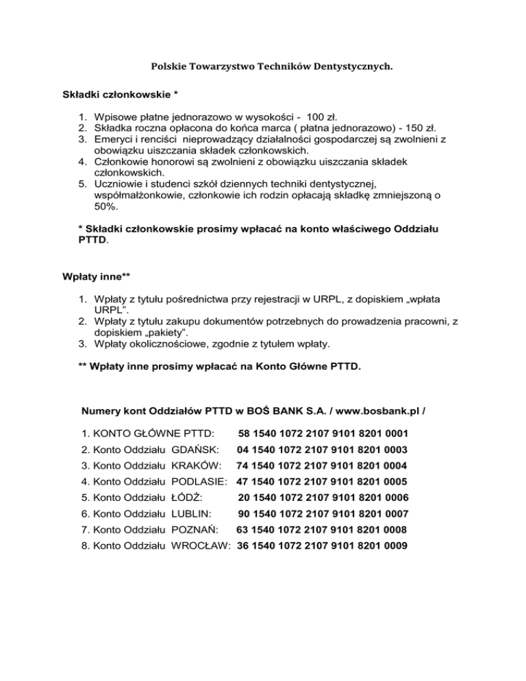 Polskie Towarzystwo Techników Dentystycznych. Składki członkowskie * 1. Wpisowe płatne jednorazowo w wysokości - 100 zł. 2. Składka roczna opłacona do końca marca ( płatna jednorazowo) - 150 zł. 3. Emeryci i renciści nieprowadzący działalności gospodarczej są zwolnieni z obowiązku uiszczania składek członkowskich. 4. Członkowie honorowi są zwolnieni z obowiązku uiszczania składek członkowskich. 5. Uczniowie i studenci szkół dziennych techniki dentystycznej, współmałżonkowie, członkowie ich rodzin opłacają składkę zmniejszoną o 50%. * Składki członkowskie prosimy wpłacać na konto właściwego Oddziału PTTD. Wpłaty inne** 1. Wpłaty z tytułu pośrednictwa przy rejestracji w URPL, z dopiskiem „wpłata URPL”. 2. Wpłaty z tytułu zakupu dokumentów potrzebnych do prowadzenia pracowni, z dopiskiem „pakiety”. 3. Wpłaty okolicznościowe, zgodnie z tytułem wpłaty. ** Wpłaty inne prosimy wpłacać na Konto Główne PTTD. Numery kont Oddziałów PTTD w BOŚ BANK S.A. / www.bosbank.pl / 1. KONTO GŁÓWNE PTTD: 58 1540 1072 2107 9101 8201 0001 2. Konto Oddziału GDAŃSK: 04 1540 1072 2107 9101 8201 0003 3. Konto Oddziału KRAKÓW: 74 1540 1072 2107 9101 8201 0004 4. Konto Oddziału PODLASIE: 47 1540 1072 2107 9101 8201 0005 5. Konto Oddziału ŁÓDŹ: 20 1540 1072 2107 9101 8201 0006 6. Konto Oddziału LUBLIN: 90 1540 1072 2107 9101 8201 0007 7. Konto Oddziału POZNAŃ: 63 1540 1072 2107 9101 8201 0008 8. Konto Oddziału WROCŁAW: 36 1540 1072 2107 9101 8201 0009