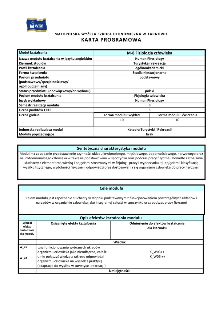 karta programowa - Małopolska Wyższa Szkoła Ekonomiczna