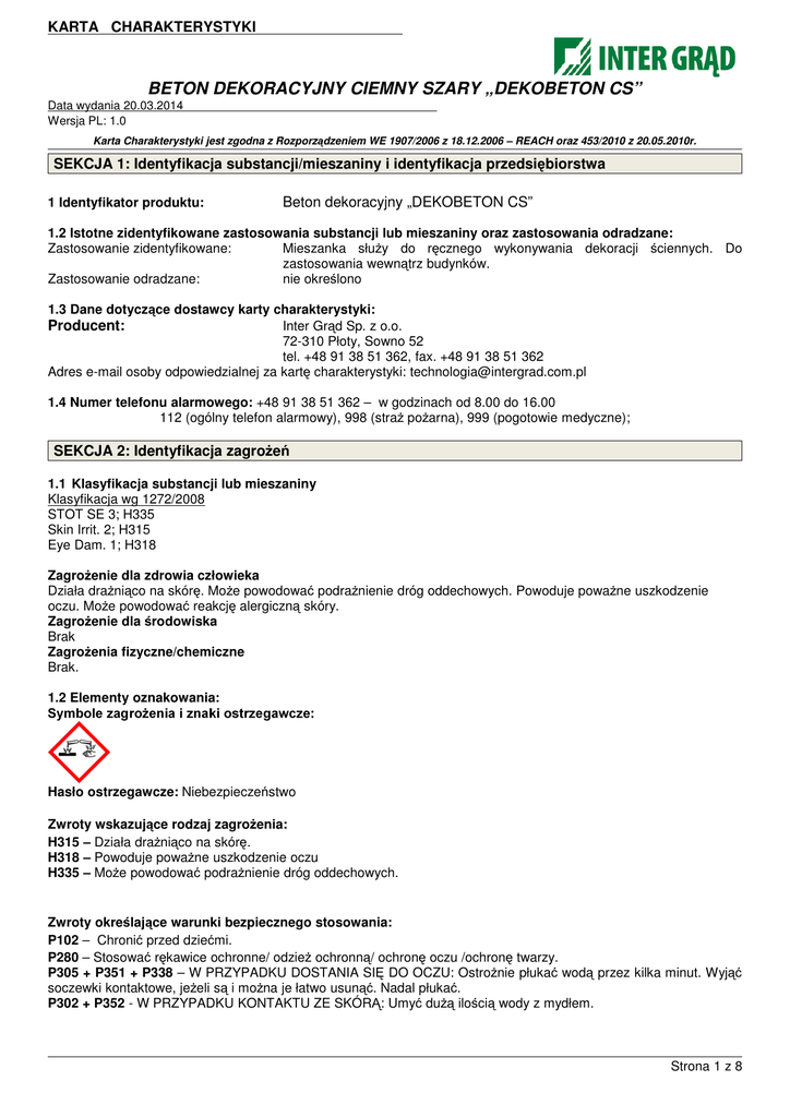 KARTA CHARAKTERYSTYKI BETON DEKORACYJNY CIEMNY SZARY „DEKOBETON CS” Data wydania 20.03.2014 Wersja PL: 1.0 Karta Charakterystyki jest zgodna z Rozporządzeniem WE 1907/2006 z 18.12.2006 – REACH oraz 453/2010 z 20.05.2010r. SEKCJA 1: Identyfikacja substancji/mieszaniny i identyfikacja przedsiębiorstwa 1 Identyfikator produktu: Beton dekoracyjny „DEKOBETON CS” 1.2 Istotne zidentyfikowane zastosowania substancji lub mieszaniny oraz zastosowania odradzane: Zastosowanie zidentyfikowane: Mieszanka służy do ręcznego wykonywania dekoracji ściennych. Do zastosowania wewnątrz budynków. Zastosowanie odradzane: nie określono 1.3 Dane dotyczące dostawcy karty charakterystyki: Inter Grąd Sp. z o.o. 72-310 Płoty, Sowno 52 tel. +48 91 38 51 362, fax. +48 91 38 51 362 Adres e-mail osoby odpowiedzialnej za kartę charakterystyki: [email protected] Producent: 1.4 Numer telefonu alarmowego: +48 91 38 51 362 – w godzinach od 8.00 do 16.00 112 (ogólny telefon alarmowy), 998 (straż pożarna), 999 (pogotowie medyczne); SEKCJA 2: Identyfikacja zagrożeń 1.1 Klasyfikacja substancji lub mieszaniny Klasyfikacja wg 1272/2008 STOT SE 3; H335 Skin Irrit. 2; H315 Eye Dam. 1; H318 Zagrożenie dla zdrowia człowieka Działa drażniąco na skórę. Może powodować podrażnienie dróg oddechowych. Powoduje poważne uszkodzenie oczu. Może powodować reakcję alergiczną skóry. Zagrożenie dla środowiska Brak Zagrożenia fizyczne/chemiczne Brak. 1.2 Elementy oznakowania: Hasło ostrzegawcze: Niebezpieczeństwo Zwroty wskazujące rodzaj zagrożenia: H315 – Działa drażniąco na skórę. H318 – Powoduje poważne uszkodzenie oczu H335 – Może powodować podrażnienie dróg oddechowych. Zwroty określające warunki bezpiecznego stosowania: P102 – Chronić przed dziećmi. P280 – Stosować rękawice ochronne/ odzież ochronną/ ochronę oczu /ochronę twarzy. P305 + P351 + P338 – W PRZYPADKU DOSTANIA SIĘ DO OCZU: Ostrożnie płukać wodą przez kilka minut. Wyjąć soczewki kontaktowe, jeżeli są i można je łatwo usunąć. Nadal płukać. P302 + P352 - W PRZYPADKU KONTAKTU ZE SKÓRĄ: Umyć dużą ilością wody z mydłem. Strona 1 z 8 KARTA CHARAKTERYSTYKI BETON DEKORACYJNY CIEMNY SZARY „DEKOBETON CS” Data wydania 20.03.2014 Wersja PL: 1.0 Karta Charakterystyki jest zgodna z Rozporządzeniem WE 1907/2006 z 18.12.2006 – REACH oraz 453/2010 z 20.05.2010r. P304 + P340 – W PRZYPADKU DOSTANIA SIĘ DO DRÓG ODDECHOWYCH: wyprowadzić lub wynieść poszkodowanego na świeże powietrze i zapewnić warunki do odpoczynku w pozycji umożliwiającej swobodne oddychanie P312 - W przypadku złego samopoczucia skontaktować się z OŚRODKIEM ZATRUĆ lub z lekarzem Składniki niebezpieczne: Wodorotlenek wapnia [CAS: 1305-62-0]. Inne informacje: Produkt przed użyciem jest rozrabiany z wodą i w takiej postaci jest stosowany 1.3 Inne zagrożenia: Brak innych zagrożeń. Brak informacji na temat spełnienia kryteriów PBT lub vPvB zgodnie z załącznikiem XIII rozporządzenia REACH. Odpowiednie badania nie były przeprowadzone. SEKCJA 3: Skład/informacja o składnikach 3.1 Substancja: Nie dotyczy. 3.2 Mieszanina: Niebezpieczne składniki: Identyfikator produktu Wodorotlenek wapnia CAS: 1305-62-0 WE: 215-137-3 Nr indeksowy:-Nr REACH: substancja podlega przepisom okresu przejściowego Zawartość % <10 Klasyfikacja CLP Kody zwrotów Klasa zagrożenia i wskazujących kody kategorii rodzaj zagrożenia Eye Dam. 1 STOT SE 3 Skin Irrit. 2 H318 H335 H315 Pełna treść zwrotów R i H w sekcji 16 Pozostałe składniki: mączka marmurowa >70% z ustaloną wartością NDS dla pyłów SEKCJA 4: Środki pierwszej pomocy 4.1 Opis środków pierwszej pomocy W przypadku kontaktu ze skórą: Zdjąć zanieczyszczoną odzież, umyć zabrudzoną skórę wodą z mydłem, spłukać dokładnie wodą, w przypadku pojawienia się podrażnienia, skontaktować się z lekarzem. W przypadku kontaktu z oczami: Przepłukać oczy przez kilkanaście minut (ok. 15) dużą ilością wody, trzymając powieki szeroko rozwarte. Unikać silnego strumienia, ze względu na niebezpieczeństwo uszkodzenia rogówki. W przypadku przedłużającego się podrażnienia skonsultować się z lekarzem. Narażenie inhalacyjne: W razie zawrotów głowy lub nudności wyprowadzić poszkodowanego na świeże powietrze, w razie braku szybkiej poprawy zasięgnąć porady lekarza. W przypadku połknięcia: Nie wywoływać wymiotów, natychmiast skontaktować się z lekarzem. Nie podawać niczego doustnie osobie nieprzytomnej. 4.2 Najważniejsze ostre i opóźnione objawy oraz skutki narażenia: Układ oddechowy. Wdychanie stężonych pyłów produktu powoduje podrażnienia błon śluzowych nosa, gardła i dalszych odcinków układu oddechowego. Może powodować duszności, kaszel, problemy z oddychaniem. Strona 2 z 8 KARTA CHARAKTERYSTYKI BETON DEKORACYJNY CIEMNY SZARY „DEKOBETON CS” Data wydania 20.03.2014 Wersja PL: 1.0 Karta Charakterystyki jest zgodna z Rozporządzeniem WE 1907/2006 z 18.12.2006 – REACH oraz 453/2010 z 20.05.2010r. Przewód pokarmowy. Spożycie powoduje podrażnienia błon śluzowych języka, jamy ustnej, gardła i dalszych odcinków przewodu pokarmowego. Po spożyciu może wywołać objawy zatrucia pokarmowego, bóle brzucha, nudności, biegunkę i wymioty. Kontakt z oczami. Stwarza ryzyko poważnego uszkodzenia oczu. Kontakt ze skórą. Powoduje podrażnienia. Może powodować uczulenie w kontakcie ze skórą. 4.3 Wskazania dotyczące wszelkiej natychmiastowej pomocy lekarskiej i szczególnego postępowania z poszkodowanym: Decyzję o sposobie postępowania podejmuje lekarz po ocenie stanu poszkodowanego. SEKCJA 5: Postępowanie w przypadku pożaru 5.1 Środki gaśnicze: Odpowiednie środki gaśnicze: piana alkoholoodporna lub suche proszki gaśnicze (A,B,C), dwutlenek węgla (gaśnica śniegowa), piasek lub ziemia, mgła wodna. Stosować metody gaśnicze odpowiednie do warunków otoczenia. Niewłaściwe środki gaśnicze: 