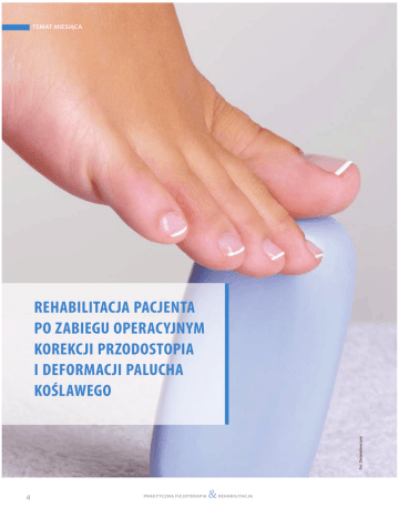 TEMAT MIESIĄCA Fot. Dreamstime.com REHABILITACJA PACJENTA PO ZABIEGU OPERACYJNYM KOREKCJI PRZODOSTOPIA I DEFORMACJI PALUCHA KOŚLAWEGO 4 PRAKTYCZNA FIZJOTERAPIA REHABILITACJA TEMAT MIESIĄCA P aluch koślawy określany jest jako zniekształcenie I stawu śródstopno-paliczkowego, które charakteryzuje się bocznym odchyleniem paliczka bliższego [2]. Do czynników predysponujących zalicza się m.in. stopę płasko-koślawą, słabszą budowę mięśniowo-więzadłową stopy kobiecej, pierwotną szpotawość I kości śródstopia i okrągły kształt jej głowy, a także osłabienie układu statycznego stopy, pogłębiane dodatkowo przez czynniki zewnętrzne, takie jak niefizjologiczne obuwie oraz obciążenia związane z macierzyństwem u kobiet [4, 5]. BIOMECHANIKA STOPY – TRZY PUNKTY PODPARCIA W PRAKTYCE KLINICZNEJ Sklepienia podłużne oraz poprzeczne stopy tworzą trzy punkty podparcia. Należą do nich: głowa I kości śródstopia, głowa IV i V kości śródstopia oraz pięta. Tworzą dobrą stabilizację dla stopy i tym samym całej kończyny dolnej [7]. Dwa ostatnie z trzech wymienionych punktów podporu stopy wykazują nieznaczną ruchomość. Zdecydowanie większy zakres ruchomości ma głowa I kości śródstopia, głównie dzięki ruchom w stawie skokowo-łódkowym. Ta względnie nieznaczna ruchomość w kierunkach grzbietowym lub podeszwowym jest wystarczająca do utrzymania stabilizacji stopy podczas fazy obciążenia na podłożu o niewielkich nierównościach. Podczas poruszania się w terenie o większych nierównościach (w fazie jednonóż podczas pełnego obciążania kończyny) funkcje amortyzacyjne przejmują dodatkowo górny i dolny staw skokowy. O ile obciążenie stopy w fazie podporowej przenoszone jest na punkty podparcia pięty oraz głów IV i V kości śródstopia za pośrednictwem układu kostnego i więzadłowego, o tyle przyparcie I głowy kości śródstopia uwarunkowane jest prawidłową funkcją mięśnia strzałkowego długiego [7]. W wyniku napięcia tego mięśnia dochodzi do przemieszczenia się głowy I kości śródstopia w kierunku podeszwowym i tym samym podkreślenia sklepienia podłużnego przyśrodkowego stopy. Warto zwrócić uwagę, że mięsień strzałkowy długi ma niewielkie pole przekroju, co sprawia, że nie należy do silnych mięśni. Tym bardziej może dziwić fakt, że jest zlokalizowany w peryferycznej części kończyny dolnej, która przecież poddawana jest ogromnym obciążeniom i spełnia funkcje podporowo-stabilizacyjne dla całego ciała. Analiza przebiegu mięśnia strzałkowego pozwala jednak znaleźć uzasadnienie takiego umiejscowienia – ścięgno zawija się dwukrotnie, początkowo za kostką boczną kości strzałkowej, a następnie pod kością sześcienną. Kieruje się dalej na stronę podeszwową stopy i przyczepia się od spodu do podstawy I kości śródstopia. Do przemieszczenia się głowy I kości śródstopia dochodzi w wyniku napięcia mięśnia strzałkowego długiego w kierunku podeszwowym. To właśnie dzięki tym „zagięciom” ścięgno mięśnia strzałkowego „nadrabia” niewielką siłę i w połączeniu z działaniem mięśnia piszczelowego tylnego stabilizuje prawidłowe ustawienie stopy. Próba korekcji ustawienia stopy pod obciążeniem poprzez napinanie wyżej wymienionych mięśni jest niemożliwa. Stąd niezwykle istotne jest, aby podczas rehabilitacji poinstruować pacjenta i nauczyć go odtwarzania prawidłowego wysklepienia stopy przed obciążeniem, czyli zanim przeniesie na nią ciężar swojego ciała. Szczególnie ważnym momentem podczas lokomocji jest przejście pomiędzy fazą kontaktu pięty z podłożem (initial contact – IC), a fazą amortyzacji podłoża/stopa płasko (loading response – LR), podczas której stopa początkowo ma kontakt z podłożem wyłącznie za pośrednictwem pięty, październik 2012 a w końcu opada płasko na podłoże całą swoją powierzchnią [6]. Istotne jest, aby nauczyć pacjenta podczas tej fazy chodu prawidłowego wzorca ruchowego, polegającego na napinaniu w tym czasie mięśnia strzałkowego długiego, co spowoduje przemieszczenie głowy I kości śródstopia w kierunku podeszwowym i jej docisk do podłoża tuż przed pełnym przejęciem obciążenia przez stopę. Pozwoli to na zwiększenie efektywności działania mięśnia strzałkowego długiego oraz zoptymalizowanie prawidłowych funkcji podporowych stopy. PATOMECHANIZM PALUCHA KOŚLAWEGO Paluch koślawy określany jest jako zniekształcenie I stawu śródstopno-paliczkowego (metatarso-phalangeal joint I – MTP I), które charakteryzuje się bocznym odchyleniem paliczka bliższego [2]. Autor do czynników predysponujących zalicza m.in. stopę płasko-koślawą, wiotkość tkanek, pierwotną szpotawość I kości śródstopia oraz okrągły kształt jej głowy. Według Kelikiana [4] przyczyną palucha koślawego jest osłabienie układu statycznego stopy, pogłębiane dodatkowo przez czynniki zewnętrzne, takie jak modne obuwie na obcasie ze zwężanymi czubkami butów. Michalak [5] uważa, że choroba ta, która dotyczy w większości kobiet, wiąże się ze słabszą budową mięśniowo-więzadłową stopy kobiecej, przeciążeniami związanymi z macierzyństwem, wpływem hormonów oraz użytkowaniem przez kobiety niefizjologicznego obuwia. Następstwami deformacji są przykurcz bocznej części torebki stawowej MTP, rozciągnięcie przyśrodkowej części torebki stawowej MTP, przyśrodkowa wyniosłość kostna głowy I kości śródstopia, szpotawe odchylenie I kości śródstopia oraz pronacja palucha [1]. Do najczęstszych dolegliwości pojawiających się w praktyce klinicznej można zaliczyć ból MTP I oraz części przyśrodkowej głowy I kości śródstopia, a także dyskomfort estetyczny [1]. Leczenie przy ewidentnej deformacji palucha musi zakładać jej korekcję, co za- 5 TEMAT MIESIĄCA zwyczaj jest możliwe tylko i wyłącznie poprzez zabieg chirurgiczny. 
