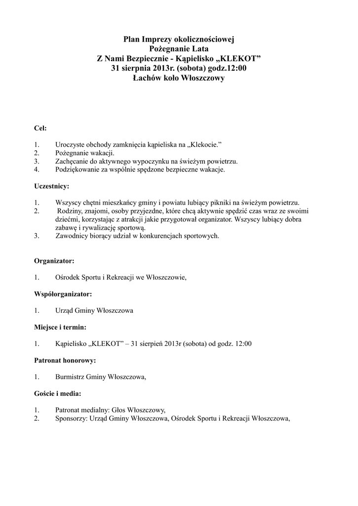 Plan Imprezy okolicznościowej Pożegnanie Lata Z Nami Bezpiecznie - Kąpielisko „KLEKOT” 31 sierpnia 2013r. (sobota) godz.12:00 Łachów koło Włoszczowy Cel: 1. 2. 3. 4. Uroczyste obchody zamknięcia kąpieliska na „Klekocie.” Pożegnanie wakacji. Zachęcanie do aktywnego wypoczynku na świeżym powietrzu. Podziękowanie za wspólnie spędzone bezpieczne wakacje. Uczestnicy: 1. 2. 3. Wszyscy chętni mieszkańcy gminy i powiatu lubiący pikniki na świeżym powietrzu. Rodziny, znajomi, osoby przyjezdne, które chcą aktywnie spędzić czas wraz ze swoimi dziećmi, korzystając z atrakcji jakie przygotował organizator. Wszyscy lubiący dobra zabawę i rywalizację sportową. Zawodnicy biorący udział w konkurencjach sportowych. Organizator: 1. Ośrodek Sportu i Rekreacji we Włoszczowie, Współorganizator: 1. Urząd Gminy Włoszczowa Miejsce i termin: 1. Kąpielisko „KLEKOT” – 31 sierpień 2013r (sobota) od godz. 12:00 Patronat honorowy: 1. Burmistrz Gminy Włoszczowa, Goście i media: 1. 2. Patronat medialny: Głos Włoszczowy, Sponsorzy: Urząd Gminy Włoszczowa, Ośrodek Sportu i Rekreacji Włoszczowa, Atrakcje jakie zapewnia Organizator: 1. 2. 3. 4. 5. 6. Obsługę imprezy Profesjonalne prowadzenie zawodów. Sprzęt do zawodów Turnieje Piłka siatkowa Badminton Wyścig kajaków Gry i zabawy dla najmłodszych- Pokazy ratownictwa wodnego. - budowa zamków z piasku - rzut rzutką ratowniczą do celu -przeciąganie liny - poszukiwanie skarbów Nauka Resuscytacja Krążeniowo – Oddechowej na fantomie Występy uczestników „Wakacyjnych Warsztatów Wokalnych” prowadzonych przez Dom Kultury we Włoszczowie Plan imprezy – Pożegnanie Lata ,,Z Nami Bezpiecznie” Lp. Godzina Konkurencje Miejsce 1 12:00 Otwarty turniej siatkówki plażowej Boisko do siatkówki 2 14:00 Otwarty turniej w badmintona Boisko do badmintona 3 15:00 Wyścigi kajaków Przy plaży 4 15:30 Gry i zabawy dla dzieci -Pokazy ratownictwa wodnego - budowa zamków z piasku - rzut rzutką ratowniczą do celu -przeciąganie liny - poszukiwanie skarbów Przy plaży 5 17:00 Nauka RKO Przy plaży 6 Godziny Występy uczestników Wakacyjnych popołudniowe Warsztatów Wokalnych – DK Organizator udostępnia dla uczestników imprezy − stoisko z daniami i napojami, − parking, Nagrody w konkursach: 1. Puchary, Dyplomy, Nagrody Niespodzianki Molo Postanowienia końcowe: 1. Szczegółowych informacje Obsługa klienta – kasa basenu NEMO Tel.: (41) 33 35 101 , e-mail: [email protected] Udział w imprezie okolicznościowej: ”Z Nami Bezpiecznie - KLEKOT 2013” jest jednocześnie wyrażeniem zgody na wykorzystywanie zdjęć z wizerunkiem uczestników imprezy ( zarówno zawodników, jak i kibiców) w celach informacyjnych i reklamowych prowadzonych przez OSiR Włoszczowa. Serdecznie zapraszamy Wszystkich do wspólnej zabawy na świeżym powietrzu !!!