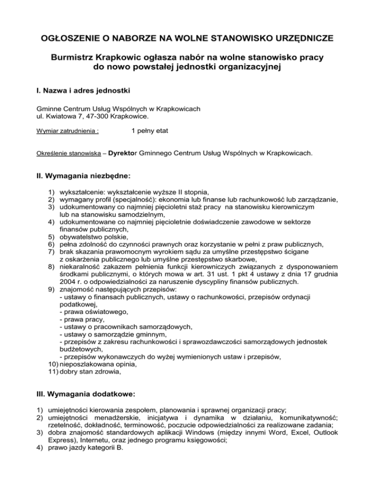 OGŁOSZENIE O NABORZE NA WOLNE STANOWISKO URZĘDNICZE Burmistrz Krapkowic ogłasza nabór na wolne stanowisko pracy do nowo powstałej jednostki organizacyjnej I. Nazwa i adres jednostki Gminne Centrum Usług Wspólnych w Krapkowicach ul. Kwiatowa 7, 47-300 Krapkowice. Wymiar zatrudnienia : 1 pełny etat Określenie stanowiska – Dyrektor Gminnego Centrum Usług Wspólnych w Krapkowicach. II. Wymagania niezbędne: 1) wykształcenie: wykształcenie wyższe II stopnia, 2) wymagany profil (specjalność): ekonomia lub finanse lub rachunkowość lub zarządzanie, 3) udokumentowany co najmniej pięcioletni staż pracy na stanowisku kierowniczym lub na stanowisku samodzielnym, 4) udokumentowane co najmniej pięcioletnie doświadczenie zawodowe w sektorze finansów publicznych, 5) obywatelstwo polskie, 6) pełna zdolność do czynności prawnych oraz korzystanie w pełni z praw publicznych, 7) brak skazania prawomocnym wyrokiem sądu za umyślne przestępstwo ścigane z oskarżenia publicznego lub umyślne przestępstwo skarbowe, 8) niekaralność zakazem pełnienia funkcji kierowniczych związanych z dysponowaniem środkami publicznymi, o których mowa w art. 31 ust. 1 pkt 4 ustawy z dnia 17 grudnia 2004 r. o odpowiedzialności za naruszenie dyscypliny finansów publicznych. 9) znajomość następujących przepisów: - ustawy o finansach publicznych, ustawy o rachunkowości, przepisów ordynacji podatkowej, - prawa oświatowego, - prawa pracy, - ustawy o pracownikach samorządowych, - ustawy o samorządzie gminnym, - przepisów z zakresu rachunkowości i sprawozdawczości samorządowych jednostek budżetowych, - przepisów wykonawczych do wyżej wymienionych ustaw i przepisów, 10) nieposzlakowana opinia, 11) dobry stan zdrowia, III. Wymagania dodatkowe: 1) umiejętności kierowania zespołem, planowania i sprawnej organizacji pracy; 2) umiejętności menadżerskie, inicjatywa i dynamika w działaniu, komunikatywność; rzetelność, dokładność, terminowość, poczucie odpowiedzialności za realizowane zadania; 3) dobra znajomość standardowych aplikacji Windows (między innymi Word, Excel, Outlook Express), Internetu, oraz jednego programu księgowości; 4) prawo jazdy kategorii B. IV. Zakres wykonywanych zadań na stanowisku pracy: 1. Zadania główne 1) kierowanie, planowanie, koordynowanie oraz kontrola realizacji statutowych zadań Gminnego Centrum Usług Wspólnych w Krapkowicach, 2) nadzór merytoryczny i organizacyjny nad Gminnym Centrum Usług Wspólnych w Krapkowicach realizującym własne zadania oraz zadania obsługi finansowej, administracyjnej oraz organizacyjnej jednostek oświatowych, które będą jednostkami obsługiwanymi, w myśl ustawy o samorządzie gminnym, 3) organizowanie i prowadzenie zadań związanych ze wspólną obsługą administracyjną, finansową oraz organizacyjną jednostek oświatowych Gminy Krapkowice, 4) współpraca z dyrektorami jednostek oświatowych Gminy Krapkowice w zakresie wykonywanych zadań przez Gminne Centrum Usług Wspólnych w Krapkowicach, 5) reprezentowanie Gminnego Centrum Usług Wspólnych w Krapkowicach na zewnątrz, 6) wykonywanie zadań w zakresie zwierzchnika służbowego nad zatrudnionymi pracownikami jednostki. V. Informacja o warunkach pracy na danym stanowisku: Miejsce pracy: Praca w budynku Publicznego Gimnazjum Nr 2 w Krapkowicach, ul. Kwiatowa 7, 47-300 Krapkowice. Budynek szkoły wyposażony w podjazd i windę. Stanowisko pracy: Stanowisko przeznaczone dla pracownika administracji biurowej z obsługą komputera oraz urządzeń biurowych, w pełnym wymiarze czasu pracy z przewagą wysiłku umysłowego. Informacja o wskaźniku zatrudnienia osób niepełnosprawnych w CUW, w rozumieniu przepisów o rehabilitacji zawodowej i społecznej oraz zatrudnieniu osób niepełnosprawnych – nie dotyczy. VI. Wymagane dokumenty i oświadczenia: pisemna koncepcja funkcjonowania Gminnego Centrum Usług Wspólnych w Krapkowicach, podpisany własnoręcznie list motywacyjny, kwestionariusz osobowy dla osób ubiegających się o zatrudnienie wg wzoru dostępnego na stronie internetowej Urzędu Miasta i Gminy w Krapkowicach (własnoręczny podpis), CV – z informacjami o wykształceniu i opisem dotychczasowego przebiegu pracy zawodowej i zajmowanych stanowiskach (własnoręczny podpis), kopia dokumentów potwierdzających wykształcenie oraz kwalifikacje zawodowe, kopie świadectw pracy dokumentujących dotychczasowy staż pracy lub zaświadczenie o zatrudnieniu w przypadku kontynuacji zatrudnienia, oświadczenie kandydata o posiadaniu obywatelstwa, oświadczenie kandydata o braku przeciwwskazań zdrowotnych do pracy na stanowisku, na które prowadzony jest nabór; oświadczenie o posiadaniu nieposzlakowanej opinii; oświadczenie o pełnej zdolności do czynności prawnych i korzystania z pełni praw publicznych, oświadczenie o niekaralności za umyślne przestępstwo ścigane z oskarżenia publicznego lub umyślne przestępstwo skarbowe, oświadczenie o niekaralności zakazem pełnienia funkcji kierowniczych związanych z dysponowaniem środkami publicznymi, o których mowa w art. 31 ust. 1 pkt 4 ustawy z dnia 17 grudnia 2004 r. o odpowiedzialności za naruszenie dyscypliny finansów publicznych, oświadczenie o wyrażeniu zgody na przetwarzanie danych osobowych do celów rekrutacji zgodnie z ustawą z dnia 29 sierpnia 1997r. o ochronie danych osobowych (t.j. Dz. U. 2014 r., poz. 1182 ze zm.) oraz ustawą z dnia 21 listopada 2008 r. o pracownikach samorządowych (t.j. Dz. U. 2016 r., poz. 902). VII. Miejsce i termin złożenia dokumentów: Dokumenty należy złożyć lub przesłać na adres Urzędu Miasta i Gminy w Krapkowicach ul. 3 Maja 17, 47-303 Krapkowice w zamkniętej kopercie z dopiskiem „Nabór na dyrektora Gminnego Centrum Usług Wspólnych w Krapkowicach” w terminie do 12 grudnia 2016 roku, do godziny 15.00. VIII. Informacje dodatkowe: dokumenty złożone po terminie nie będą rozpatrywane, postępowanie konkursowe obejmuje 