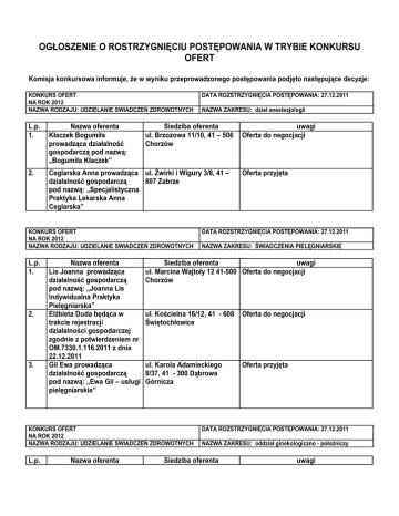 OGŁOSZENIE O ROSTRZYGNIĘCIU POSTĘPOWANIA W TRYBIE KONKURSU OFERT Komisja konkursowa informuje, że w wyniku przeprowadzonego postępowania podjęto następujące decyzje: KONKURS OFERT NA ROK 2012 NAZWA RODZAJU: UDZIELANIE SWIADCZEŃ ZDROWOTNYCH DATA ROZSTRZYGNIĘCIA POSTĘPOWANIA: 27.12.2011 NAZWA ZAKRESU: dział anestezjologii L.p. 1. Nazwa oferenta Kłaczek Bogumiła prowadząca działalność gospodarczą pod nazwą: „Bogumiła Kłaczek” Siedziba oferenta ul. Brzozowa 11/10, 41 – 506 Chorzów 2. Ceglarska Anna prowadząca ul. Żwirki i Wigury 3/8, 41 – działalność gospodarczą 807 Zabrze pod nazwą: „Specjalistyczna Praktyka Lekarska Anna Ceglarska” KONKURS OFERT NA ROK 2012 NAZWA RODZAJU: UDZIELANIE SWIADCZEŃ ZDROWOTNYCH L.p. 1. 2. 3. Nazwa oferenta Lis Joanna prowadząca działalność gospodarczą pod nazwą: „Joanna Lis Indywidualna Praktyka Pielęgniarska” Elżbieta Duda będąca w trakcie rejestracji działalności gospodarczej zgodnie z potwierdzeniem nr OM.7330.1.116.2011 z dnia 22.12.2011 Gil Ewa prowadząca działalność gospodarczą pod nazwą: „Ewa Gil – usługi pielęgniarskie” Nazwa oferenta Oferta przyjęta DATA ROZSTRZYGNIĘCIA POSTĘPOWANIA: 27.12.2011 NAZWA ZAKRESU: ŚWIADCZENIA PIELĘGNIARSKIE Siedziba oferenta uwagi ul. Marcina Wajtoły 12 41-500 Oferta do negocjacji Chorzów ul. Kościelna 16/12, 41 - 608 Oferta do negocjacji Świętochłowice ul. Karola Adamieckiego 8/37, 41 - 300 Dąbrowa Górnicza KONKURS OFERT NA ROK 2012 NAZWA RODZAJU: UDZIELANIE SWIADCZEŃ ZDROWOTNYCH L.p. uwagi Oferta do negocjacji Oferta przyjęta DATA ROZSTRZYGNIĘCIA POSTĘPOWANIA: 27.12.2011 NAZWA ZAKRESU: oddział ginekologiczno - położniczy Siedziba oferenta uwagi 1. 2. 3. Waśka Grzegorz prowadzący działalność gospodarczą pod nazwą: „Specjalistyczna Praktyka Lekarska Grzegorz Waśka” Limanowska – Brachaczek Ewa prowadząca działalność gospodarczą pod nazwą: „Prywatny Specjalistyczny Gabinet Lekarski Choroby Kobiece i Połoznictwo Ewa – Limanowska Brachaczek” Żubrowska – Mazur Joanna prowadząca działalność gospodarczą pod nazwą: „Indywidualna Praktyka Lekarska Joanna Żubrowska - Mazur” ul. Prusa 32/6, 41 – 902 Bytom Oferta do negocjacji ul. Dobrodzieńska 23/1, 41 – 506 Chorzów Oferta do negocjacji ul. Katowicka 43/3, 41 – 710 Ruda Śląska Oferta do negocjacji KONKURS OFERT NA ROK 2012 NAZWA RODZAJU: UDZIELANIE SWIADCZEŃ ZDROWOTNYCH L.p. 1. 2. Nazwa oferenta Biczkowska – Zając Barbara prowadząca działalność gospodarczą pod nazwą: „Biczkowska – Zając Barbara” Szturm – Rejniak Ewa prowadząca działalność gospodarczą pod nazwą: „Gabinet Ogólnolekarski Szturm – Rejniak Ewa” 2. Nazwa oferenta Biczkowska – Zając Barbara prowadząca działalność gospodarczą pod nazwą: „Biczkowska – Zając Barbara” Szturm – Rejniak Ewa prowadząca działalność gospodarczą pod nazwą: „Gabinet Ogólnolekarski Szturm – Rejniak Ewa” NAZWA ZAKRESU: oddział patologii noworodka Siedziba oferenta ul. H. Sawickiej 7/9, 41 – 605 Świętochłowice uwagi Oferta do negocjacji ul. Gdańska 20/106, 40 – 719 Oferta do negocjacji Katowice KONKURS OFERT NA ROK 2012 NAZWA RODZAJU: UDZIELANIE SWIADCZEŃ ZDROWOTNYCH L.p. 1. DATA ROZSTRZYGNIĘCIA POSTĘPOWANIA: 27.12.2011 DATA ROZSTRZYGNIĘCIA POSTĘPOWANIA: 27.12.2011 NAZWA ZAKRESU: oddział pediatryczny Siedziba oferenta ul. H. Sawickiej 7/9, 41 – 605 Świętochłowice uwagi Oferta do negocjacji ul. Gdańska 20/106, 40 – 719 Oferta do negocjacji Katowice KONKURS OFERT NA ROK 2012 NAZWA RODZAJU: UDZIELANIE SWIADCZEŃ ZDROWOTNYCH DATA ROZSTRZYGNIĘCIA POSTĘPOWANIA: 27.12.2011 NAZWA ZAKRESU: oddział neonatologiczny L.p. 1. Nazwa oferenta Szturm – Rejniak Ewa prowadząca działalność gospodarczą pod nazwą: „Gabinet Ogólnolekarski Szturm – Rejniak Ewa” Siedziba oferenta uwagi ul. Gdańska 20/106, 40 – 719 Oferta do negocjacji Katowice Komisja w składzie: 1. Krystyna Szyrocka – Szwed - przewodniczący komisji ....................................... 2. Margot Łój - członek komisji ....................................... 3. Arkadiusz Kucharek – członek komisji ........................................ 4. Danuta Grębosz – członek komisji ........................................ 5. Jolanta Wieczorek – protokolant, członek komisji ....................................... Art. 149. 1. Odrzuca się ofertę: 1) złożoną przez świadczeniodawcę po terminie; 2) gdy dostarczone przez świadczeniodawcę informacje są nieprawdziwe; 3) gdy świadczeniodawca nie określił przedmiotu oferty lub nie podał proponowanej liczby lub ceny świadczeń opieki zdrowotnej. 2. W przypadku gdy braki, o których mowa w ust. 1, dotyczą tylko części oferty, ofertę można odrzucić w części dotkniętej brakiem. 3. W przypadku gdy świadczeniodawca nie przedstawił wszystkich wymaganych dokumentów lub gdy oferta zawiera braki formalne, komisja wzywa oferenta do usunięcia tych braków w wyznaczonym terminie pod rygorem odrzucenia oferty.