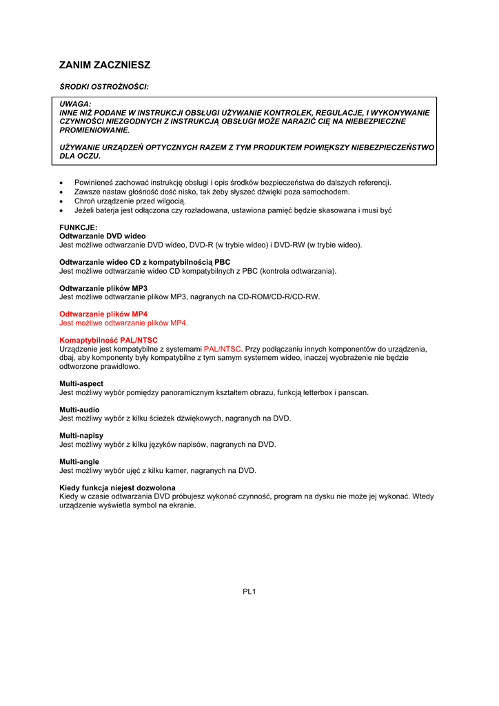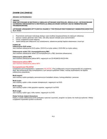 ZANIM ZACZNIESZ ŚRODKI OSTROŻNOŚCI: UWAGA: INNE NIŻ PODANE W INSTRUKCJI OBSŁUGI UŻYWANIE KONTROLEK, REGULACJE, I WYKONYWANIE CZYNNOŚCI NIEZGODNYCH Z INSTRUKCJĄ OBSŁUGI MOŻE NARAZIĆ CIĘ NA NIEBEZPIECZNE PROMIENIOWANIE. UŻYWANIE URZĄDZEŃ OPTYCZNYCH RAZEM Z TYM PRODUKTEM POWIĘKSZY NIEBEZPIECZEŃSTWO DLA OCZU. • • • • Powinieneś zachować instrukcję obsługi i opis środków bezpieczeństwa do dalszych referencji. Zawsze nastaw głośność dość nisko, tak żeby słyszeć dżwięki poza samochodem. Chroń urządzenie przed wilgocią. Jeżeli baterja jest odłączona czy rozładowana, ustawiona pamięć będzie skasowana i musi być FUNKCJE: Odtwarzanie DVD wideo Jest możliwe odtwarzanie DVD wideo, DVD-R (w trybie wideo) i DVD-RW (w trybie wideo). Odtwarzanie wideo CD z kompatybilnością PBC Jest możliwe odtwarzanie wideo CD kompatybilnych z PBC (kontrola odtwarzania). Odtwarzanie plików MP3 Jest możliwe odtwarzanie plików MP3, nagranych na CD-ROM/CD-R/CD-RW. Odtwarzanie plików MP4 Jest możliwe odtwarzanie plików MP4. Komaptybilność PAL/NTSC Urządzenie jest kompatybilne z systemami PAL/NTSC. Przy podłączaniu innych komponentów do urządzenia, dbaj, aby komponenty były kompatybilne z tym samym systemem wideo, inaczej wyobrażenie nie będzie odtworzone prawidłowo. Multi-aspect Jest możliwy wybór pomiędzy panoramicznym kształtem obrazu, funkcją letterbox i panscan. Multi-audio Jest możliwy wybór z kilku ścieżek dżwiękowych, nagranych na DVD. Multi-napisy Jest możliwy wybór z kilku języków napisów, nagranych na DVD. Multi-angle Jest możliwy wybór ujęć z kilku kamer, nagranych na DVD. Kiedy funkcja niejest dozwolona Kiedy w czasie odtwarzania DVD próbujesz wykonać czynność, program na dysku nie może jej wykonać. Wtedy urządzenie wyświetla symbol na ekranie. PL1 INSTALACJA ŚRODKI OSTROŻNOŚCI • Należy uważnie wybrać miejsce instalacji, aby urządzenie nie przeszkadzało w prowadzeniu pojazdu. • Unikaj instalacji urządzenia w miejscach narażonych na wysokie temperatury, np. w miejscu • bezpośrednio nasłonecznionym lub w pobliżu nawiewu gorącego powietrza, lub w miejscu narażonym • na zapylenie, kurz lub nadmierne wibracje. • Stosuj tylko dołączone wyposażenie instalacyjne, aby zapewnić bezpieczną instalację. • Przed rozpoczęciem instalacji urządzenia, pamiętaj o odłączeniu panelu przedniego. UWAGA: Kąt nachylenia dla instalacji urządzenia nie może przekraczać 30°; w przeciwnym wypadku otwieranie panelu przedniego będzie niemożliwe. Odkręć wkręt i wspornik Zegnij te zaczepy w razie potrzeby UWAGA: Zachowaj klucz do odkręcania, ponieważ może on się przydać w przyszłości, w razie potrzeby wymontowania urządzenia z pojazdu Zdejmowanie i zakładanie panelu przedniego Panel przedni tego urządzenia można odłączać w celu zapobieżenia kradzieży. ZDEJMOWANIE PANELU PRZEDNIEGO Przed odłączeniem panelu przedniego, pamiętaj o wyłączeniu urządzenia za pomocą przycisku PWR (1). Następnie naciśnij przycisk REL (14), pozwól, aby panel ustalil się w pozycji horyzontalnej i odłącz panel przedni pociągając go do siebie, tak jak pokazano na rysunku. Uwagi: • Podczas podłączania nie przyciskaj panelu zbyt mocno do urządzenia głуwnego. Panel daje się łatwo podłączyć poprzez lekkie dociśnięcie do urządzenia głównego. • Kiedy przenosisz panel przedni, wkładaj go do dołączonego pudełka. • Podczas podłączania panelu przedniego nie naciskaj na wyświetlacz. PL2 ABY PRZYMOCOWAĆ URZĄDZENIE 1. URZĄDZENIE 2. OBUDOWA ZWALNIAJĄCA 3. DESKA ROZDZIELCZA 4. NAKRĘTKA SZEŚCIOKĄTNA 5. PODKŁADKA BLOKUJĄCA 6. PODKŁADKA 7. KAROSERIA SAMOCHODU 8. TYLNY PASEK MOCUJĄCY 9. WKRĘT SAMOGWINTUJĄCY 10.ŚRUBA SZEŚCIOKĄTNA M5 X 15 Deska rozdzielcza ZŁĄCZE ISO WYJŚCIE: WEJŚCIE: CZERWONE (WPRAWO) BIAŁE (WLEWO) : CZERWONE (WPRAWO) BIAŁE (WLEWO) ZŁĄCZE A 1. 2. 3. 4. PAMIĘĆ +12V 5. WYJŚCIE ANTENY SAMOCHODU 6. 7. +12 V (DO STACYJKI) 8. UZIEMIENIE Uwaga: (złącze A nr. 7) przewód musi być podłączony przez stacyjkę, aby uniknąć wyładowania akumulatora samochodu, jeśli samochód nie bęzie używany przez dluższy czas. ZŁĄCZE B 1. PRAWY TYLNY GŁOŚNIK (+) 2. PRAWY TYLNY GŁOŚNIK (-) 3. PRAWY PRZEDNI GŁOŚNIK (+) 4. PRAWY PRZEDNI GŁOŚNIK (-) 5. LEWY PRZEDNI GŁOŚNIK (+) 6. LEWY PZREDNI GŁOŚNIK (-) 7. LEWY TYLNY GŁOŚNIK (+) 8. LEWY TYLNY GŁOŚNIK (-) Konserwacja WYMIANA BEZPIECZNIKA Jelśli przepali się bezpiecznik, sprawdź połączenie zasilania i wymień bezpiecznik. Jelśli bezpiecznik przepali się ponownie po wymianie, mogło dojść do usterki wewnątrz urządzenia. W takim wypadku skonsultuj się z najbliższym centrum naprawy. Ostrzeżenie Stosuj bezpieczniki o podanym natężeniu dla wszystkich przewodуw. Zastosowanie bezpiecznika dla zbyt wysokiego natężenia może spowodować poważne uszkodzenia. PL3 ROZMIESZCZENIE CZĘŚCI (Jednostka główna) 1. WŁĄCZ / WYŁĄCZ (PWR) 2.,3. PRZYCISK WYBORU FUNKCJI: GŁOŚNOŚĆ / GŁOŚNOŚĆ TA / TONY NISKIE / WYSOKIE / BALANS / WYCISZENIE 4. USTAWIONE STACJE (1,2,3,4,5,6) 5. FUNKCJA „AF” (ALTERNATYWNE CZĘSTOTLIWOŚCI) 6. FUNKCJA „TA” (OGŁOSZENIA O RUCHU) 7. FUNKCJA „PTY” (TYP ROGRAMU) 8. WYŚWIETLACZ (DISP) 9. PRZYCISK TRYBU (MODE) 10. ZAKRES / GŁOŚNOŚĆ (BAND/LOUD) 11. TOJENIE RĘCZNE LUB AUTOMATYCZNE LUB CZĘSTOTLIWOŚĆ ) (CZĘSTOTLIWOŚĆ + WYBÓR UTWORU / WYSZUKIWANIE NA CD 12. AUTOMATYCZNE WYSZUKIWANIE I STROJENIE (A/PS) 13. AUTOMATYCZNE STEROWANIE STROJENIEM „SKANUJ” (SCN) 14. PRZYCISK ZWOLNIENIA BLOKADY PANELU ( ) 15. WYŚWIETLACZ LCD 16. PRZYCISK WYJMOWANIA PŁYTY CD ( ) 17. SZCZELINA PŁYTY 18. PRZYCISK ODTWARZANIA/PAUZY 19. PRZYCISK STOP 20. PRZYCISK POWTARZANIA 21. PRZYCISK ODTWARZANIA LOSOWEGO 22, 23. POSZUKIWANIE ŚCIEŻEK +10 / -10 (TYLKO DLA DYSKÓW MP3) 24. PRZYCISK RESET PL4 ROZMIESZCZENIE CZĘŚCI (Pilot) 1. WŁĄCZ / WYŁĄCZ 2. TRYB 3. ODTWARZANIE
