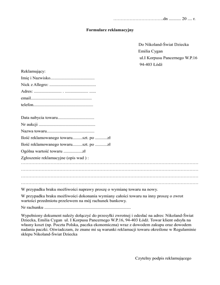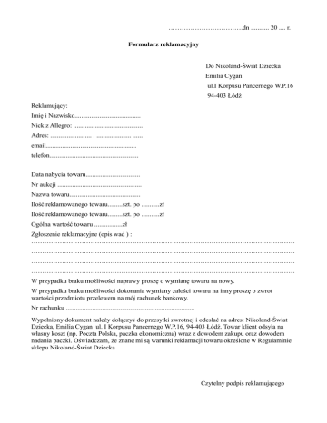 …………………………….dn ........... 20 .... r. Formularz reklamacyjny Do Nikoland-Świat Dziecka Emilia Cygan ul.I Korpusu Pancernego W.P.16 94-403 Łódź Reklamujący: Imię i Nazwisko........................................ Nick z Allegro: .......................................... Adres: ......................... . ..................... ...... email....................................................... telefon...................................................... Data nabycia towaru................................. Nr aukcji ................................................... Nazwa towaru........................................... Ilość reklamowanego towaru.........szt. po ...........zł Ilość reklamowanego towaru.........szt. po ...........zł Ogólna wartość towaru .................zł Zgłoszenie reklamacyjne (opis wad ) : ………………………………………………………………………………………………………… ………………………………………………………………………………………………………… ………………………………………………………………………………………………………… ………………………………………………………………………………………………………… W przypadku braku możliwości naprawy proszę o wymianę towaru na nowy. W przypadku braku możliwości dokonania wymiany całości towaru na inny proszę o zwrot wartości przedmiotu przelewem na mój rachunek bankowy. Nr rachunku .............................................................................. Wypełniony dokument należy dołączyć do przesyłki zwrotnej i odesłać na adres: Nikoland-Świat Dziecka, Emilia Cygan ul. I Korpusu Pancernego W.P.16, 94-403 Łódź. Towar klient odsyła na własny koszt (np. Poczta Polska, paczka ekonomiczna) wraz z dowodem zakupu oraz dowodem nadania paczki. Oświadczam, że znane mi są warunki reklamacji towaru określone w Regulaminie sklepu Nikoland-Świat Dziecka Czytelny podpis reklamującego