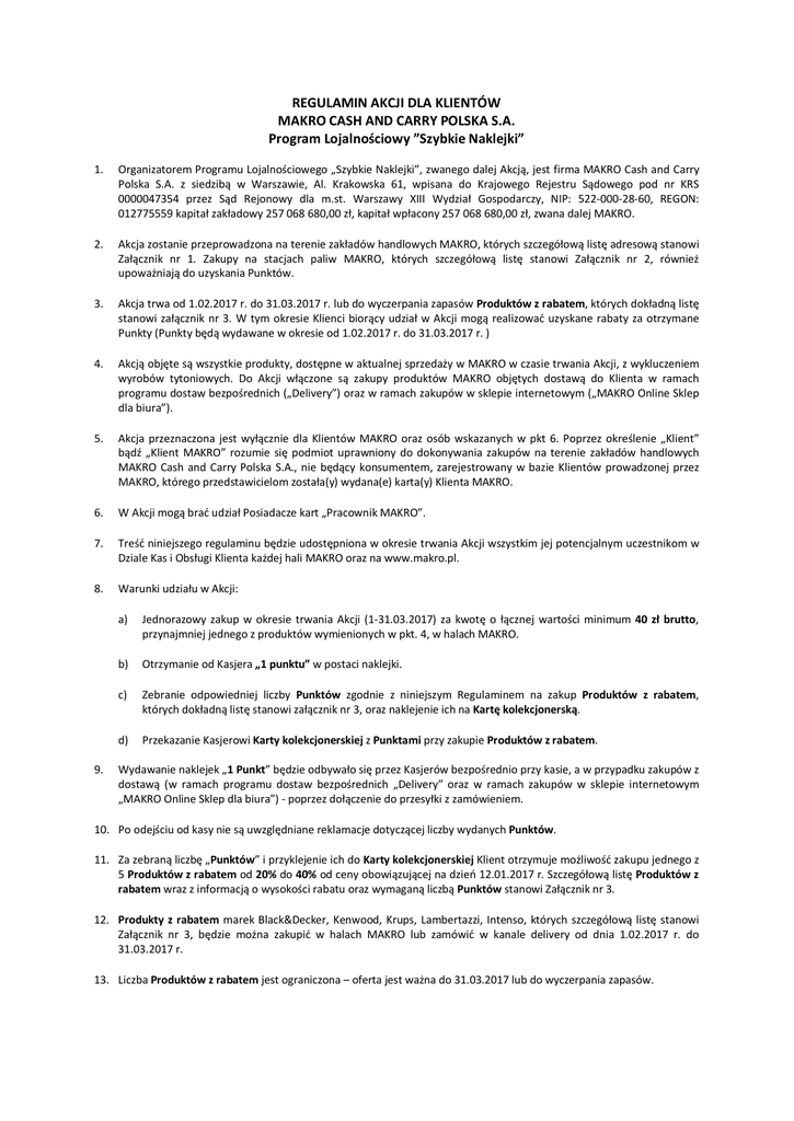 REGULAMIN AKCJI DLA KLIENTÓW MAKRO CASH AND CARRY POLSKA S.A. Program Lojalno ciowy ”Szybkie Naklejki” 1. Organizatorem Programu Lojalno ciowego „Szybkie Naklejki”, zwanego dalej Akcj , jest firma MAKRO Cash and Carry Polska S.A. z siedzib w Warszawie, Al. Krakowska 61, wpisana do Krajowego Rejestru S dowego pod nr KRS 0000047354 przez S d Rejonowy dla m.st. Warszawy XIII Wydzia Gospodarczy, NIP: 522-000-28-60, REGON: 012775559 kapita zak adowy 257 068 680,00 z , kapita wp acony 257 068 680,00 z , zwana dalej MAKRO. 2. Akcja zostanie przeprowadzona na terenie zak adów handlowych MAKRO, których szczegó ow list adresow stanowi Za cznik nr 1. Zakupy na stacjach paliw MAKRO, których szczegó ow list stanowi Za cznik nr 2, równie upowa niaj do uzyskania Punktów. 3. Akcja trwa od 1.02.2017 r. do 31.03.2017 r. lub do wyczerpania zapasów Produktów z rabatem, których dok adn list stanowi za cznik nr 3. W tym okresie Klienci bior cy udzia w Akcji mog realizowa uzyskane rabaty za otrzymane Punkty (Punkty b wydawane w okresie od 1.02.2017 r. do 31.03.2017 r. ) 4. Akcj obj te s wszystkie produkty, dost pne w aktualnej sprzeda y w MAKRO w czasie trwania Akcji, z wykluczeniem wyrobów tytoniowych. Do Akcji w czone s zakupy produktów MAKRO obj tych dostaw do Klienta w ramach programu dostaw bezpo rednich („Delivery”) oraz w ramach zakupów w sklepie internetowym („MAKRO Online Sklep dla biura”). 5. Akcja przeznaczona jest wy cznie dla Klientów MAKRO oraz osób wskazanych w pkt 6. Poprzez okre lenie „Klient” „Klient MAKRO” rozumie si podmiot uprawniony do dokonywania zakupów na terenie zak adów handlowych MAKRO Cash and Carry Polska S.A., nie b cy konsumentem, zarejestrowany w bazie Klientów prowadzonej przez MAKRO, którego przedstawicielom zosta a(y) wydana(e) karta(y) Klienta MAKRO. 6. W Akcji mog bra udzia Posiadacze kart „Pracownik MAKRO”. 7. Tre niniejszego regulaminu b dzie udost pniona w okresie trwania Akcji wszystkim jej potencjalnym uczestnikom w Dziale Kas i Obs ugi Klienta ka dej hali MAKRO oraz na www.makro.pl. 8. Warunki udzia u w Akcji: 9. a) Jednorazowy zakup w okresie trwania Akcji (1-31.03.2017) za kwot o cznej warto ci minimum 40 z brutto, przynajmniej jednego z produktów wymienionych w pkt. 4, w halach MAKRO. b) Otrzymanie od Kasjera „1 punktu” w postaci naklejki. c) Zebranie odpowiedniej liczby Punktów zgodnie z niniejszym Regulaminem na zakup Produktów z rabatem, których dok adn list stanowi za cznik nr 3, oraz naklejenie ich na Kart kolekcjonersk . d) Przekazanie Kasjerowi Karty kolekcjonerskiej z Punktami przy zakupie Produktów z rabatem. Wydawanie naklejek „1 Punkt” b dzie odbywa o si przez Kasjerów bezpo rednio przy kasie, a w przypadku zakupów z dostaw (w ramach programu dostaw bezpo rednich „Delivery” oraz w ramach zakupów w sklepie internetowym „MAKRO Online Sklep dla biura”) - poprzez do czenie do przesy ki z zamówieniem. 10. Po odej ciu od kasy nie s uwzgl dniane reklamacje dotycz cej liczby wydanych Punktów. 11. Za zebran liczb „Punktów” i przyklejenie ich do Karty kolekcjonerskiej Klient otrzymuje mo liwo zakupu jednego z 5 Produktów z rabatem od 20% do 40% od ceny obowi zuj cej na dzie 12.01.2017 r. Szczegó ow list Produktów z rabatem wraz z informacj o wysoko ci rabatu oraz wymagan liczb Punktów stanowi Za cznik nr 3. 12. Produkty z rabatem marek Black&Decker, Kenwood, Krups, Lambertazzi, Intenso, których szczegó ow list stanowi Za cznik nr 3, b dzie mo na zakupi w halach MAKRO lub zamówi w kanale delivery od dnia 1.02.2017 r. do 31.03.2017 r. 13. Liczba Produktów z rabatem jest ograniczona – oferta jest wa na do 31.03.2017 lub do wyczerpania zapasów. 14. W momencie zap aty za jeden z Produktów z rabatem, Klient oddaje Kasjerowi Kart kolekcjonersk z przyklejonymi Punktami. 15. W przypadku zniszczenia lub zagubienia „Punktów”, duplikaty nie b wydawane. Karty kolekcjonerskie ze zniszczonymi, zafa szowanymi, b podrobionymi punktami nie b upowa nia y do nabycia Produktu z rabatem. 16. Ka dy Klient mo e wzi niniejszym Regulaminie. udzia w akcji wielokrotnie, jednak e za ka dym razem musi spe ni warunki zawarte w 17. Nadzór nad przebiegiem Akcji pe ni Komisja, w sk ad której wchodz : Manager Trade Marketingu – Centrum Wsparcia Biznesu MAKRO Kierownik DKiOK odpowiedniej hali MAKRO 18. Reklamacje dotycz ce przebiegu Akcji mog by zg aszane w ci gu 7 dni od daty zako czenia Akcji pod adres MAKRO Cash and Carry Polska S. A., Al. Krakowska 61, 02-183 Warszawa, z dopiskiem „Program Lojalno ciowy – Akcja Szybkie Naklejki”. 19. Decyzja Komisji zostanie przes ana do uczestnika Akcji zg aszaj cego reklamacj w ci gu 14 dni od daty otrzymania reklamacji. Decyzja Komisji jest ostateczna. 20. MAKRO ponosi pe reklamacje. odpowiedzialno za tre regulaminu, czas i przebieg Akcji, wydanie nagród oraz ewentualne 21. MAKRO zastrzega sobie prawo do wprowadzania zmian cen produktów obj tych Akcj , wymienionych w Za czniku nr 3, oraz do limitowania wielko ci sprzeda y poszczególnych towarów. 22. MAKRO zastrzega sobie prawo do wprowadzenia zmian w Regulaminie w formie pisemnej stosownym aneksem oraz og oszenia ich na stronie www.makro.pl oraz w Dzia ach Obs ugi Kas i Klienta. 23. MAKRO zastrzega sobie prawo do skrócenia okresu trwania akcji w ka dym czasie, bez podawania przyczyny i poinformowania o tym uczestników w trybie wskazanym w pkt. 22 Regulaminu. Za cznik nr 1. Lista zak adów handlowych MAKRO Cash and Carry Polska S.A. Hala nr 1, al. Jerozolimskie 184, 02-486 Warszawa Hala nr 2, ul. D ugosza 80, 41-219 Sosnowiec Hala nr 3, ul. Kasprzaka 8, 91-083 ód Hala nr 4, ul. Wolno ci 50, 05-091 Z bki Hala nr 5, ul. Tyniecka 3, Bielany Wroc awskie, 55-040 Kobierzyce Hala nr 6, ul. Jasnogórska 2, 31-358 Kraków Hala nr 7, al. Solidarno ci 51, 61-696 Pozna Hala nr 9, ul. Hutnicza 8, 81-061 Gdynia Hala nr 10, ul. Po udniowa 35, 71-001 Szczecin Hala nr 11, ul. Chemiczna 5, 20-329 Lublin Hala nr 12, 