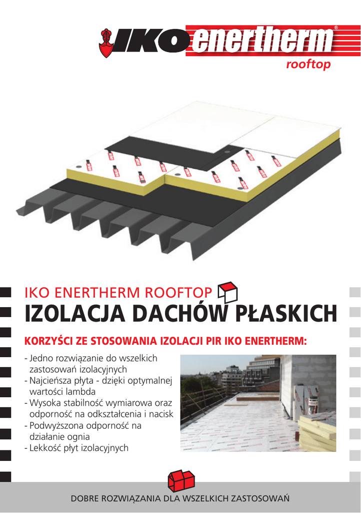 rooftop IKO ENERTHERM ROOFTOP IZOLACJA DACHÓW PŁASKICH KORZYŚCI ZE STOSOWANIA IZOLACJI PIR IKO ENERTHERM: -Jedno rozwiązanie do wszelkich zastosowań izolacyjnych -Najcieńsza płyta - dzięki optymalnej wartości lambda -Wysoka stabilność wymiarowa oraz odporność na odkształcenia i nacisk -Podwyższona odporność na działanie ognia -Lekkość płyt izolacyjnych DOBRE ROZWIĄZANIA DLA WSZELKICH ZASTOSOWAŃ rooftop IKO ENERTHERM ALU Zastosowanie: Płyty IKO enertherm ALU są przeznaczone do termicznej izolacji dachów płaskich w systemach balastowanych, pokryciach dachowych zgrzewanych ogniowo, montowanych mechanicznie lub klejonych. Charakterystyka produktu: IKO enertherm ALU jest płytą izolacyjną w 100% wolną od freonów lub halogenków, z rdzeniem z twardej pianki z poliizocyjanuratu (PIR), obłożoną po obu stronach wielowarstwową, gazoszczelną okładziną z aluminium. Parametry izolacyjne: Współczynnik przewodzenia ciepła: (EN 13165) λD: 0,022 W/(m.K). ALU IKO ENERTHERM BGF Zastosowanie: Płyty IKO enertherm BGF są przeznaczone do termicznej izolacji dachów płaskich, zwłaszcza pokryć dachowych zgrzewanych ogniowo, ale także w systemach balastowanych, montowanych mechanicznie lub klejonych. Charakterystyka produktu: IKO enertherm BGF jest płytą izolacyjną w 100% wolną od freonów lub halogenków, z rdzeniem z twardej pianki z poliizocyjanuratu (PIR), oklejoną po obu stronach perforowaną, powlekaną włókniną szklaną niezawierającą piasku ani talku. Parametry izolacyjne: Współczynnik przewodzenia ciepła: (EN 13165) λD: od 0,026 W/(m.K) do 0,027 W/(m.K). MG BGF IKO ENERTHERM MG Zastosowanie: Płyty IKO enertherm MG są przeznaczone do termicznej izolacji dachów płaskich w połączeniu z bitumicznymi pokryciami dachowymi, z membranami PCV, TPO, TPE, EPDM i innymi. Charakterystyka produktu: IKO enertherm MG jest płytą izolacyjną w 100% wolną od freonów lub halogenków, z rdzeniem z twardej pianki z poliizocyjanuratu (PIR), oklejoną po obu stronach perforowaną, powlekaną włókniną szklaną. Parametry izolacyjne: Współczynnik przewodzenia ciepła: (EN 13165) λD: od 0,026 W/(m.K) do 0,027 W/(m.K). IKO Insulations BV - Postbus 45 - NL-4780 AA Moerdijk Wielewaalweg 3 - NL-4791 PD Klundert Tel.: +31(0)168 331 400 - Fax: +31(0)168 331 409 www.enertherm.eu - E-mail: [email protected]