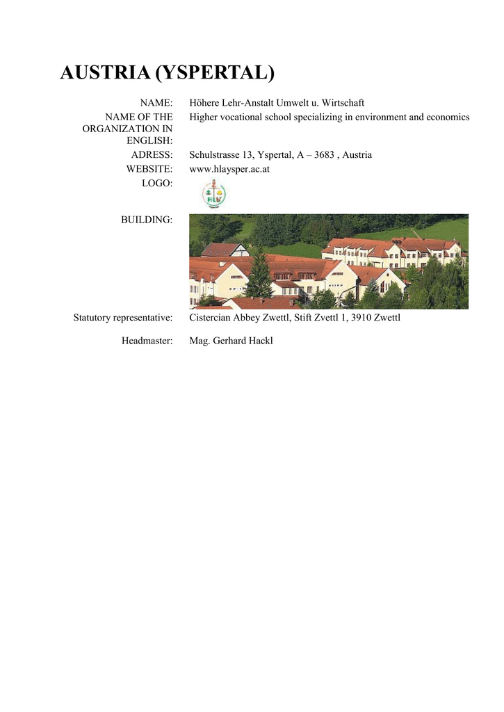 AUSTRIA (YSPERTAL) NAME: NAME OF THE ORGANIZATION IN ENGLISH: ADRESS: WEBSITE: LOGO: Höhere Lehr-Anstalt Umwelt u. Wirtschaft Higher vocational school specializing in environment and economics Schulstrasse 13, Yspertal, A – 3683 , Austria www.hlaysper.ac.at BUILDING: Statutory representative: Headmaster: Cistercian Abbey Zwettl, Stift Zvettl 1, 3910 Zwettl Mag. Gerhard Hackl HUNGARY (TOKAJ) NAME: NAME OF THE ORGANIZATION IN ENGLISH: ADRESS: WEBSITE: LOGO: Ferenc Gimnázium Szakközépiskola és Kollégium Tokaji Ferenc Secondary Grammar and Secondary Vocational School 3910 Tokaj, Bajcsy-Zsilinszky Endre út 18-20 www.tfg.hu BUILDING: HEADTEACHER: Mag. Erika Molnárné Tóth POLAND ( CIESZYN) NAME: NAME OF THE ORGANIZATION IN ENGLISH: ADRESS: WEBSITE: LOGO: Władysław Szybiński School Complex in Cieszyn (Zespół Szkół im. Władysława Szybińskiego w Cieszynie) Szybinski Secondary School No 1 in Cieszyn ul. Kraszewskiego 11 43-400 CIESZYN, PL www.szybinski.cieszyn.pl BUILDING: HEADTEACHER: Iwona Bebek, M.Sc. SLOVAKIA (PIEŠŤANY) NAME: NAME OF THE ORGANIZATION IN ENGLISH: ADRESS: WEBSITE: LOGO: Stredná odborná škola záhradnícká Secondary school of Horticulture Brezová 2, Piešťany, 92101, Slovakia http://szaspn.edupage.org BUILDING: HEADTEACHER: Ing. Eva Stručková
