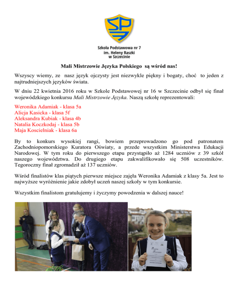 Mali Mistrzowie Języka Polskiego są wśród nas! Wszyscy wiemy, ze nasz język ojczysty jest niezwykle piękny i bogaty, choć to jeden z najtrudniejszych języków świata. W dniu 22 kwietnia 2016 roku w Szkole Podstawowej nr 16 w Szczecinie odbył się finał wojewódzkiego konkursu Mali Mistrzowie Języka. Naszą szkołę reprezentowali: Weronika Adamiak - klasa 5a Alicja Kasicka - klasa 5f Aleksandra Kubiak - klasa 4b Natalia Koczkodaj - klasa 5b Maja Koscielniak - klasa 6a By to konkurs wysokiej rangi, bowiem przeprowadzono go pod patronatem Zachodniopomorskiego Kuratora Oświaty, a przede wszystkim Ministerstwa Edukacji Narodowej. W tym roku do pierwszego etapu przystąpiło aż 1284 uczniów z 39 szkół naszego województwa. Do drugiego etapu zakwalifikowało się 508 uczestników. Tegoroczny finał zgromadził aż 137 uczniów. Wśród finalistów klas piątych pierwsze miejsce zajęła Weronika Adamiak z klasy 5a. Jest to najwyższe wyróżnienie jakie zdobył uczeń naszej szkoły w tym konkursie. Wszystkim finalistom gratulujemy i życzymy powodzenia w dalszej nauce!