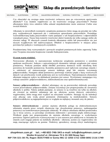 Czy obawiałeś się swojego stanu trzeźwości zwłaszcza rano po wieczornym spożywaniu alkoholu?? Czy miałem wątpliwości co do trzeźwości swojego pracownika?? Pomiar alkomatem który trwa zaledwie kilka sekund niejednokrotnie może uratować Ciebie oraz twoich bliskich. Alkomaty to niewielkich rozmiarów urządzenia pomiarowe które mogą się przydać nie tylko przy weekendowych imprezach ale i codziennym sprawdzaniu pracowników. Posiadając wykwalifikowaną kadrę pracowników warto pamiętać o ich bezpieczeństwu i odpowiednich warunkach pracy. Nasza linia testerów trzeźwości ułatwi kontrolę nie tylko samego siebie ale również załogi. W obecnych czasach kontrola alkomatem siebie lub pracowników nie jest niczym wyjątkowym lub nadzwyczajnym. Dbałość o bezpieczeństwo w miejscu pracy powinna być jednym z ważniejszych czynników. Przedstawiamy linię wytrzymałych i pewnych urządzeń pomiarowych które zapewnią Tobie oraz Twojemu otoczeniu bezpieczne warunki funkcjonowania. O czym warto wiedzieć. Nowoczesne alkomaty to zaawansowane techniczne urządzenia pomiarowe o szerokim spektrum możliwości. Jednym z najważniejszych elementów takiego urządzenia jest sensor pomiarowy. Podczas pomiaru układ obróbki powietrza dostarcza ściśle określoną ilość powietrza do komórki pomiarowej. Komórka pomiarowa pod wpływem zawartego etanolu i w zależności od zastosowanego sensora indukuje prąd lub zmienia rezystancję półprzewodnika. Następnie układ pomiarowy porównuje wartości prądu z bazą wzorcowych danych i po przeliczeniu wynik podawany jest na wyświetlaczu. Najważniejszym elementem alkomatu mającym wpływ na dokładność pomiaru jest sensor. Wyróżniamy następujące trzy rodzaje sensorów: półprzewodnikowe, elektrochemiczne oraz spektrofotometryczne. Sensory półprzewodnikowe - alkohol utleniający się na powierzchni elektrody powoduje wzrost przewodności półprzewodnika. Zmiana rezystancji jest proporcjonalna do zawartości alkoholu w próbie. Należy jednak pamiętać, że sensory te są wrażliwe nie tylko na alkohol, ale również na niektóre substancje jak np. nikotyna, aceton (dotyczy cukrzyków), węglowodory, które mogą mieć wypływ na zawyżanie wyników. Stosując się do instrukcji oraz płucząc usta wodą przed pomiarem eliminujemy tą niedoskonałość. Sensory półprzewodnikowe są najpopularniejsze ze względu na najlepszy stosunek ceny do jakości. Sensory elektrochemiczne - pomiar stężenia alkoholu polega na elektrochemicznym utlenianiu etanolu przez związki chemiczne (np. dwuchromian potasowy, nadmanganian potasowy) na kontrolowanym potencjale elektrody. W efekcie utleniania alkohol przekształca się w kwas octowy, co powoduje uwolnienie elektronów i powstanie prądu elektrycznego. Wielkość prądu jest proporcjonalna do stężenia alkoholu zawartego w wydychanym powietrzu. Ogniwo paliwowe wykorzystywane w tym sensorze jest selektywne w stosunku do etanolu czyli reaguje jedynie na molekuły alkoholu - nikotyna, aceton czy węglowodory nie mają znaczącego wpływu na pomiar. Niektórzy sprzedawcy stosują chwyt marketingowy twierdząc, że w sprzedawanych alkomatach elektrochemicznych sensor jest taki sam jak w policyjnych alkomatach. Niestety nie jest to prawda, w policyjnych alkomatach sensory są znacznie bardziej zaawansowane i kilkanaście razy droższe. Jedyne podobieństwo to wykorzystywana technologia. Sensory spektrofotometryczne - wykorzystują spektrum podczerwieni do określania zawartości alkoholu. Spektrometria w podczerwieni polega na pomiarze wielkości, przy której związki chemiczne absorbują promieniowanie podczerwone w specyficznej długości fali. Podczas absorbcji promieniowania podczerwonego przez dany związek ulega zwiększeniu lub wzmocnieniu jego ruch obrotowy lub wibracyjny, wartość absorbcji jest mierzona i przeliczana na stężenie alkoholu. Sensory spektrofotometryczne stosowane są jedynie w stacjonarnych alkomatach dowodowych wykorzystywanych przez policję lub sądy. Właściwe korzystanie z alkomatu. Właściwe użytkowanie urządzeń pomiarowych jest niezwykle ważne z przynajmniej dwóch powodów. Pierwszym z nich jest dbałość o jakość pomiaru drugim dbałość o sprzęt. Stosowanie się do zaleceń producenta umożliwi długotrwałe korzystanie z urządzeń z pewnością o wysokiej powtarzalności a co za tym idzie dokładności jakości wyników. Należy przede wszystkim pamiętać o konieczności odczekania około 40 min od wypicia alkoholu. Musimy pozwolić aż cały wypity alkohol dostanie się z żołądka do krwioobiegu. Alkohol wchłania się do krwi najszybciej po ok.20 –30 min. od spożycia. Ponadto resztki alkoholu, jakie pozostają w ustach (pod językiem, w kieszonkach dziąseł, w ślinie, między zębami) oraz jego opary z przewodu pokarmowego. Zaraz po wypiciu kieliszka wódki, stężenie alkoholu w ustach, pochodzące z tych resztek, a nie z płuc wynosi nawet 200 promili, czyli kilkudziesięciokrotnie przekracza maksymalny zakres sensora (4 promile). Jeden taki pomiar może rozkalibrować alkomat lub nawet spowodować spalenie sensora. Czas 40 min. jest niezbędny do zneutralizowania lub wyparowania cząstek etanolu z resztek alkoholu pozostających w ustach. Przepłukanie ust wodą może ale nie musi przyspieszyć ten proces. Wrażliwość sensora na inne substancje (nikotyna, resztki jedzenia) również może zafałszować wynik pomiaru. Co może zafałszować wynik badania alkomatem? Stan baterii ma bardzo duży wpływ na dokładność pomiaru. Słaba bateria lub niealkaiczna nie zapewnia wystarczającej ilości prądu do rozgrzania sensora do odpowiedniej temperatury i tym samym wyniki nie mogą być wiarygodne. Akumulatorki nie zdają egzaminu, gdyż z czasem tracą swoją pojemność. Resztki alkoholu w ustach lub nie powstrzymanie się od jedzenia lub palenia papierosów 20 min przed pomiarem opisane wyżej. Odbijanie się, czkawka, c