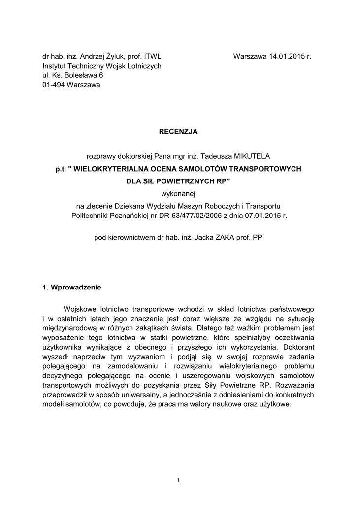 dr hab. inż. Andrzej Żyluk, prof. ITWL Instytut Techniczny Wojsk Lotniczych ul. Ks. Bolesława 6 01-494 Warszawa Warszawa 14.01.2015 r. RECENZJA rozprawy doktorskiej Pana mgr inż. Tadeusza MIKUTELA p.t. " WIELOKRYTERIALNA OCENA SAMOLOTÓW TRANSPORTOWYCH DLA SIŁ POWIETRZNYCH RP” wykonanej na zlecenie Dziekana Wydziału Maszyn Roboczych i Transportu Politechniki Poznańskiej nr DR-63/477/02/2005 z dnia 07.01.2015 r. pod kierownictwem dr hab. inż. Jacka ŻAKA prof. PP 1. Wprowadzenie Wojskowe lotnictwo transportowe wchodzi w skład lotnictwa państwowego i w ostatnich latach jego znaczenie jest coraz większe ze względu na sytuację międzynarodową w różnych zakątkach świata. Dlatego też ważkim problemem jest wyposażenie tego lotnictwa w statki powietrzne, które spełniałyby oczekiwania użytkownika wynikające z obecnego i przyszłego ich wykorzystania. Doktorant wyszedł naprzeciw tym wyzwaniom i podjął się w swojej rozprawie zadania polegającego na zamodelowaniu i rozwiązaniu wielokryterialnego problemu decyzyjnego polegającego na ocenie i uszeregowaniu wojskowych samolotów transportowych możliwych do pozyskania przez Siły Powietrzne RP. Rozważania przeprowadził w sposób uniwersalny, a jednocześnie z odniesieniami do konkretnych modeli samolotów, co powoduje, że praca ma walory naukowe oraz użytkowe. 1 2. Omówienie treści rozprawy Praca zawiera 204 stron i składa się z sześciu rozdziałów oraz ośmiu załączników. Zawarto w niej 125 rysunków przedstawiających wyniki badań w postaci wykresów, schematów, tabel oraz wzorów. W treści pracy Autor zaprezentował 163 pozycje literaturowe, zarówno krajowe, jak i zagraniczne. W rozdziale pierwszym opisano obszar zainteresowań Doktoranta oraz przedstawiono tezę, cel i główne zadania badawcze. W rozdziale drugim Autor porusza zagadnienia transportu wojskowego, procesu podejmowania decyzji w wojsku ze szczególnym uwzględnieniem problematyki wyboru floty powietrznej. Przedstawia istotę wielokryterialnego wspomagania decyzji (WWD), w tym charakteryzuje główne pojęcia i schematy związane z tą dziedziną wiedzy oraz przeprowadza przegląd i klasyfikację metod WWD, szczegółowo charakteryzuje wybrane wielokryterialne metody szeregowania wariantów. Rozdział trzeci zawiera charakterystykę funkcjonowania wojskowego transportu powietrznego na tle transportu cywilnego i przedstawia sposoby i metody oceny floty powietrznej. Opisuje problematykę związaną ze sposobami doboru wariantów (wojskowych samolotów transportowych) oraz kryteriów ich oceny W rozdziale czwartym Doktorant przedstawia metodykę wielokryterialnej oceny wojskowych samolotów transportowych obejmującą analizę, modelowanie i rozwiązanie wielokryterialnego problemu decyzyjnego związanego z ocena oraz uszeregowaniem różnych wojskowych samolotów transportowych przeznaczonych do realizacji zadań transportowych wykonywanych przez Siły Powietrzne RP. Następny rozdział opisuje weryfikację opracowanej metodyki i przedstawia procedurę związaną z rozwiązywaniem problemu decyzyjnego oceny i wyboru wojskowego samolotu transportowego. Autor definiuje zestaw dziewięciu samolotów, a następnie przeprowadza wszechstronną ocenę rozważanych wariantów ze względu na kryteria: ekonomiczne, techniczne (operacyjne) i środowiskowe z uwzględnieniem różnych modeli preferencji decydenta i interesariuszy. Kryteria ekonomiczne związane są wg Autora z bezpośrednimi kosztami pozyskania wojskowego samolotu transportowego, jak również możliwościami pozyskania offsetu. Doktorant dokonuje też oceny kryteriów technicznych i operacyjnych, wskazując na ważność charakterystyk konstrukcyjnych samolotów transportowych oraz elastyczność ich zastosowania podczas prowadzenia operacji na rzecz Sił Zbrojnych RP. Opisuje też sposób przeprowadzenia eksperymentów obliczeniowych z wykorzystaniem metod ELECTRE i AHP, na podstawie których powstaje końcowe ranking wojskowych samolotów transportowych. Na tej podstawie Autor przedstawia swoje rekomendacje i dokonuje wyboru rozwiązania kompromisowego. Przeprowadza także analizę wrażliwości wyników, odnosząc się do zagadnienia stabilności rankingów. 2 W rozdziale szóstym Autor formułuje wnioski końcowe oraz wskazuje kierunki dalszych prac badawczych. Do pracy dołączono załączniki: Załącznik 1 - zadania wojskowego lotnictwa transportowego oraz sposoby ich realizacji; Załącznik 2 - środki zapewniające przetrwanie samolotów transportowych na współczesnym polu walki; Załącznik 3 - elementy zwiększające elastyczność zastosowania samolotów transportowych; Załącznik 4 - elementy zwiększających ergonomię pracy załogi oraz komfort podróży pasażerów wojskowych samolotów transportowych; Załącznik 5 - informacje opisujące warianty samolotu transportowego; Załącznik 6 - ankieta w zakresie wyboru nowego samolotu transportowego dla Sił Powietrznych; Załącznik 7 - upoważnienie jednorazowe do przeprowadzenia badań ankietowych; Załącznik 8 – praca w formie cyfrowej na dysku CD. 2. Ocena merytoryczna rozprawy Na podstawie oceny przedstawionej do recenzji rozprawy doktorskiej można stwierdzić, że podjęte w niej trudne i ciekawe zadanie naukowo-badawcze zostało przez Autora zrealizowane. Rozprawa zawiera oryginalne osiągnięcia poznawcze i praktyczne, a sam Autor wykazał się wysokimi kompetencjami w zakresie prowadzonych analiz teoretycznych i doświadczalnych. Po raz pierwszy w kraju podjęto się analiz tak złożonego problemu jakim jest lotnicza technika wojskowa. Najbardziej wartościowe i oryginalne wartości przedstawionej do oceny dysertacji to: 1) Wszechstronny, dogłębny przegląd literatury w zakresie wojskowych, transportowych statków powietrznych. 2) Zastosowanie Wielokryterialnego Wspomagania Decyzji (WWD) do oceny, wyboru i użycia transportowych statków powietrznych w Lotnictwie Sił Zbrojnych. 3) Opracowanie metodyk