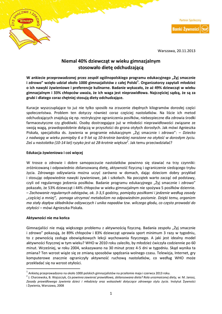Warszawa, 20.11.2013 Niemal 40% dziewcząt w wieku gimnazjalnym stosowało dietę odchudzającą W ankiecie przeprowadzonej przez zespół ogólnopolskiego programu edukacyjnego „Żyj smacznie i zdrowo” wzięło udział około 1000 gimnazjalistów z całej Polski1. Organizatorzy zapytali młodzież o ich nawyki żywieniowe i preferencje kulinarne. Badanie wykazało, że aż 49% dziewcząt w wieku gimnazjalnym i 33% chłopców uważa, że ich waga jest nieprawidłowa. Najczęściej sądzą, że są za grubi i dlatego coraz chętniej stosują diety odchudzające. Kuracje wyszczuplające to już nie tylko sposób na zrzucenie zbędnych kilogramów dorosłej części społeczeństwa. Problem ten dotyczy również coraz częściej nastolatków. Na liście ich metod odchudzających znajdują się np. restrykcyjne ograniczenia posiłków, niebezpieczne dla zdrowia środki farmaceutyczne czy głodówki. Osoby dostrzegające już w młodości nieprawidłowości związane ze swoją wagą, prawdopodobnie dołączą w przyszłości do grona otyłych dorosłych. Jak mówi Agnieszka Piskała, specjalistka ds. żywienia w programie edukacyjnym „Żyj smacznie i zdrowo”: – Dziecko z nadwagą w wieku pomiędzy 6 a 9 lat są 10-krotnie bardziej narażone na otyłość w dorosłym życiu. Zaś u nastolatka (10-14 lat) ryzyko jest aż 28-krotnie większe2. Jak temu przeciwdziałać? Edukacja żywieniowa i coś więcej W trosce o zdrowie i dobre samopoczucie nastolatków powinno się stawiać na trzy czynniki: zróżnicowaną i odpowiednio zbilansowaną dietę, aktywność fizyczną i ograniczenie siedzącego trybu życia. Zdrowego odżywiania można uczyć zarówno w domach, dając dzieciom dobry przykład i stosując odpowiednie nawyki żywieniowe, jak i szkołach. Na początek warto zacząć od podstawy, czyli od regularnego jedzenia posiłków. Badanie programu edukacyjnego „Żyj smacznie i zdrowo” pokazało, że 53% dziewcząt i 44% chłopców w wieku gimnazjalnym nie spożywa 5 posiłków dziennie. – Zachowanie regularnych odstępów, ok. 3-3,5 godziny, pomiędzy posiłkami i jedzenie według zasady „częściej a mniej”, pomaga utrzymać metabolizm na odpowiednim poziomie. Dzięki temu, organizm ma stały dopływ składników odżywczych i unika napadów tzw. wilczego głodu, co często prowadzi do otyłości – mówi Agnieszka Piskała. Aktywności nie ma końca Gimnazjaliści nie mają większego problemu z aktywnością fizyczną. Badania zespołu „Żyj smacznie i zdrowo” pokazują, że 89% chłopców i 83% dziewcząt uprawia sport minimum 3 razy w tygodniu, to z pewnością zasługa obowiązkowych lekcji wychowania fizycznego. A jaki jest idealny model aktywności fizycznej w tym wieku? WHO w 2010 roku zaleciło, by młodzież ćwiczyła codziennie po 60 minut. Wcześniej, w roku 2004, wskazywano na 30 minut przez 4-5 dni w tygodniu. Skąd wynika ta zmiana? Ten wzrost wiąże się ze zmianą sposobów spędzania wolnego czasu. Telewizja, Internet, gry komputerowe znacznie ograniczyły aktywność ruchową nastolatków, co według WHO może przekładać się na wzrost otyłości. 1 Ankietę przeprowadzono na około 1000 polskich gimnazjalistów na przełomie maja i czerwca 2013 roku. J. Charzewska, B. Wajszczyk, Co powinna zawierać prawidłowa, zbilansowana dieta? Rola urozmaiconej diety, w: M. Jarosz, Zasady prawidłowego żywienia dzieci i młodzieży oraz wskazówki dotyczące zdrowego stylu życia. Instytut Żywności i Żywienia, Warszawa, 2008 2 1 Warszawa, 20.11.2013 Zdrowo chudnąć? – Jeśli pomimo tego, nastolatek zauważy u siebie problem z masą ciała, bo jego waga jest za duża w stosunku do wieku i wzrostu, to oczywiście może podjąć próbę zdrowego odchudzania – mówi Agnieszka Piskała, specjalistka ds. żywienia w programie edukacyjnym „Żyj smacznie i zdrowo”. Pomóc mu w tym powinni rodzice, a problem warto również skonsultować z lekarzem lub dietetykiem – dodaje. Zdrowa dieta odchudzająca dla gimnazjalisty powinna być oparta na piramidzie zdrowego odżywiania, ale kaloryczność poszczególnych posiłków powinna być mniejsza niż dotychczas. Pierwszą zasadą zdrowego chudnięcia jest nauczenie się regularnego spożywania 5-ciu posiłków o stałych porach. Podstawę takiej diety powinny stanowić warzywa, produkty pełnoziarniste, chude mięso, tłuste ryby i produkty nabiałowe (jogurt naturalny, mleko, maślanka). Zdrowy proces odchudzania u młodych ludzi w okresie intensywnego wzrostu, powinien dostarczać mniejszą ilość kalorii (tak, aby organizm czerpał z zasobów nadprogramowej tkanki tłuszczowej), ale jednocześnie dostarczać wszystkich niezbędnych składników odżywczych, które warunkują prawidłowy wzrost i rozwój. Warto wiedzieć W całym procesie odchudzania nastolatka należy pamiętać o tym, że tygodniowo może on zgubić maksymalnie 0,5 kg, nie więcej. W przeciwnym wypadku czeka go efekt jo-jo. Nie da się również schudnąć bez aktywności fizycznej i odchudzić tylko konkretną partię ciała np. uda czy brzuch. Pomóc mogą w tym jedynie profilowane ćwiczenia fizyczne. I na koniec – mówi Agnieszka Piskała – należy pamiętać o złotej zasadzie „małych kroków”. Czyli stopniowo zamieniamy słodkie napoje na wodę, słodycze na suszone owoce itd. Dzięki temu, również małymi krokami, będziemy zbliżać się do smacznego i zdrowego stylu życia – dodaje Piskała. *********************************************** „Żyj smacznie i zdrowo” to program edukacyjny marki WINIARY, prowadzony we współpracy z Federacją Polskich Banków Żywności w polskich gimnazjach. Misją programu „Żyj smacznie i zdrowo” jest przekazanie gimnazjalistom wiedzy z zakresu prawidłowego i zdrowego odżywiania oraz zachęcenie ich do wspólnego spożywania posiłków i podejmowania pierwszych samodzielnych prób gotowania. W ramach projektu promuje się wśród młodzieży postawę proekologiczną, a