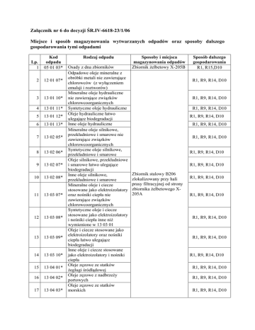 Załącznik nr 6 do decyzji ŚR.IV-6618-23/1/06 Miejsce i sposób magazynowania wytwarzanych odpadów oraz sposoby dalszego gospodarowania tymi odpadami Lp. 1 Kod odpadu 05 01 03* 2 12 01 07* 3 13 01 10* 4 13 01 11* 5 13 01 12* 6 13 01 13* 7 13 02 05* 8 13 02 06* 9 13 02 07* 10 13 02 08* 11 13 03 07* 12 13 03 08* 13 13 03 09* 14 13 03 10* 15 13 04 01* 16 13 04 02* 17 13 04 03* Rodzaj odpadu Osady z dna zbiorników Odpadowe oleje mineralne z obróbki metali nie zawierające chlorowców (z wyłączeniem emulsji i roztworów) Mineralne oleje hydrauliczne nie zawierające związków chlorowcoorganicznych Syntetyczne oleje hydrauliczne Oleje hydrauliczne łatwo ulegające biodegradacji Inne oleje hydrauliczne Mineralne oleje silnikowe, przekładniowe i smarowe nie zawierające związków chlorowcoorganicznych Syntetyczne oleje silnikowe, przekładniowe i smarowe Oleje silnikowe, przekładniowe i smarowe łatwo ulegające biodegradacji Inne oleje silnikowe, przekładniowe i smarowe Mineralne oleje i ciecze stosowane jako elektroizolatory oraz nośniki ciepła nie zawierające związków chlorowcoorganicznych Syntetyczne oleje i ciecze stosowane jako elektroizolatory i nośniki ciepła inne niż wymienione w 13 03 01 Oleje i ciecze stosowane jako elektroizolatory oraz nośniki ciepła łatwo ulegające biodegradacji Inne oleje i ciecze stosowane jako elektroizolatory i nośniki ciepła Oleje zęzowe ze statków żeglugi śródlądowej Oleje zęzowe z nadbrzeży portowych Oleje zęzowe ze statków morskich Sposoby i miejsca magazynowania odpadów Zbiornik żelbetowy X-205B Sposób dalszego gospodarowania R1, R15,D10 R1, R9, R14, D10 R1, R9, R14, D10 R1, R9, R14, D10 R1, R9, R14, D10 R1, R9, R14, D10 R1, R9, R14, D10 R1, R9, R14, D10 R1, R9, R14, D10 Zbiornik stalowy B206 zlokalizowany przy hali prasy filtracyjnej od strony zbiornika żelbetowego X205A R1, R9, R14, D10 R1, R9, R14, D10 R1, R9, R14, D10 R1, R9, R14, D10 R1, R9, R14, D10 R1, R9, R14, D10 R1, R9, R14, D10 R1, R9, R14, D10 18 15 01 01 19 15 01 02 20 21 15 01 03 15 01 04 22 15 01 06 23 15 01 07 24 15 01 10* 25 15 02 02* 26 27 15 02 03 16 07 08* 28 16 11 06 29 19 01 02 30 19 01 06* 31 19 01 11* 32 33 Opakowania z papieru i tektury Opakowania z tworzyw sztucznych Opakowania z drewna Opakowania z metali Zmieszane odpady opakowaniowe Opakowania ze szkła Opakowania zawierające pozostałości substancji niebezpiecznych lub nimi zanieczyszczone Sorbenty, materiały filtracyjne, tkaniny do wycierania (np. szmaty, ścierki) i ubrania ochronne zanieczyszczone substancjami niebezpiecznymi (np. PCB) Sorbenty, materiały filtracyjne, tkaniny do wycierania (np. szmaty, ścierki) i ubrania ochronne inne niż wymienione w 15 02 02 Odpady zawierające ropę naftową lub jej produkty 19 08 13* Okładziny piecowe i materiały ogniotrwałe z procesów nie metalurgicznych inne niż wymienione w 16 11 05 Złom żelazny usunięty z popiołów paleniskowych Szlamy i inne odpady uwodnione z oczyszczania gazów odlotowych Żużle i popioły paleniskowe zawierające substancje niebezpieczne Szlamy zawierające substancje niebezpieczne z innego niż biologiczne oczyszczania ścieków przemysłowych Papier i tektura 19 12 01 Załącznik nr 6 do decyzji ŚR.IV-6610-23/1/06 Wiata stalowa zlokalizowana pomiędzy zbiornikami żelbetowymi w opakowaniach typu: beczki metalowe o pojemności 200l z wiekiem zdejmowanym lub opakowania z tworzywa sztucznego o pojemności 1000l typu „mauzer” lub opakowania kartonowe lub skrzynie drewniane lub luzem R13, R14 R13, R14 R13, R14 R4, R13, R14, D5 R13, R14, D10 R13, R14 R14, R15, D10 D10 Zbiornik żelbetowy X-206 D10 Zbiornik żelbetowy X-205B lub w zbiornikach stalowych M1 i M2 znajdujących się pomiędzy zbiornikami żelbetowymi. Wiata stalowa zlokalizowana pomiędzy zbiornikami żelbetowymi. Odpady magazynowane będą w skrzyniach drewnianych lub (większe elementy) luzem w wiacie. Zbiorniki żelbetowe X-207A i X-207B R1, R9, R12, R14, R15, D10 R13, R14, D5, D15 R13, R14, D5, D15 R14, R15, D5, D9, D12, D13, D15, D16 R14, R15, D5, D9, D12, D13, D15, D16 Zbiornik żelbetowy X-205 B R15, D10 Wiata stalowa zlokalizowana pomiędzy zbiornikami żelbetowymi. Odpady magazynowane będą w skrzyniach drewnianych, pojemnikach z tworzywa sztucznego lub opakowaniach kartonowych. R13, R14, R15 str. 2 z 3 Metale żelazne 34 19 12 02 Załącznik nr 6 do decyzji ŚR.IV-6610-23/1/06 Wiata stalowa zlokalizowana pomiędzy zbiornikami żelbetowymi. Odpady magazynowane będą w skrzyniach drewnianych, pojemnikach z tworzywa sztucznego lub (większe elementy) luzem w wiacie. R13, R14, R15 D5 str. 3 z 3